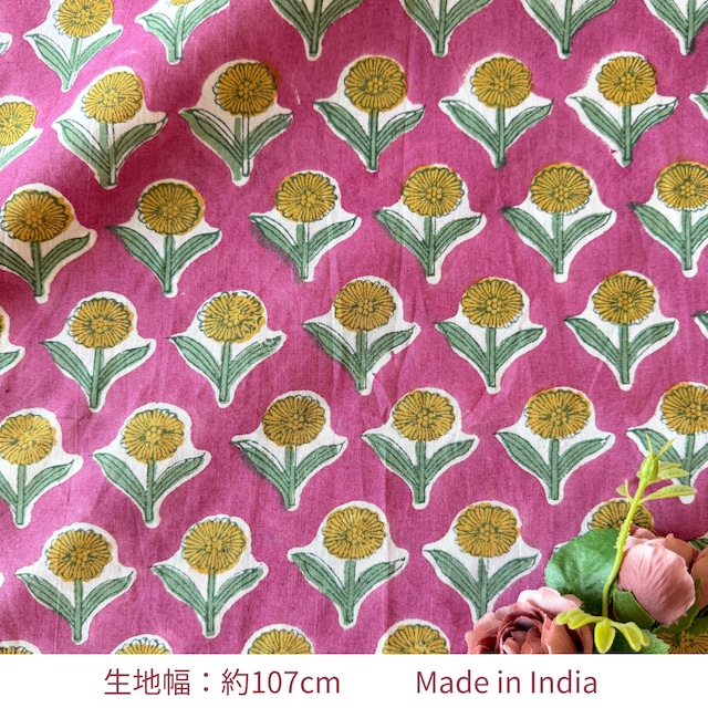 ハンドブロックプリント生地 インド更紗 綿生地 マゼンタ×イエロー花柄 薄手コットン GP-260211