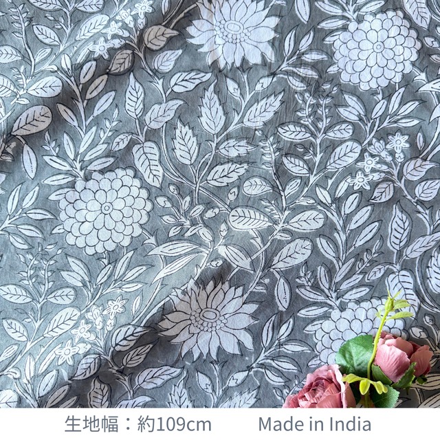 ハンドブロックプリント生地 インド更紗 綿生地 グレーベース×白抜きボタニカル柄 薄手コットン GP-26014-sa