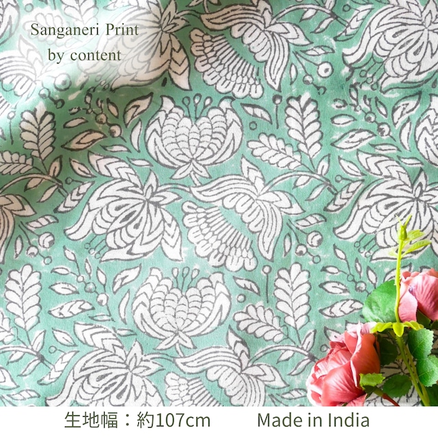 ハンドブロックプリント生地 インド更紗 綿生地 ターコイズグリーン×ボタニカルフラワー 薄手コットン JE-250210