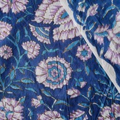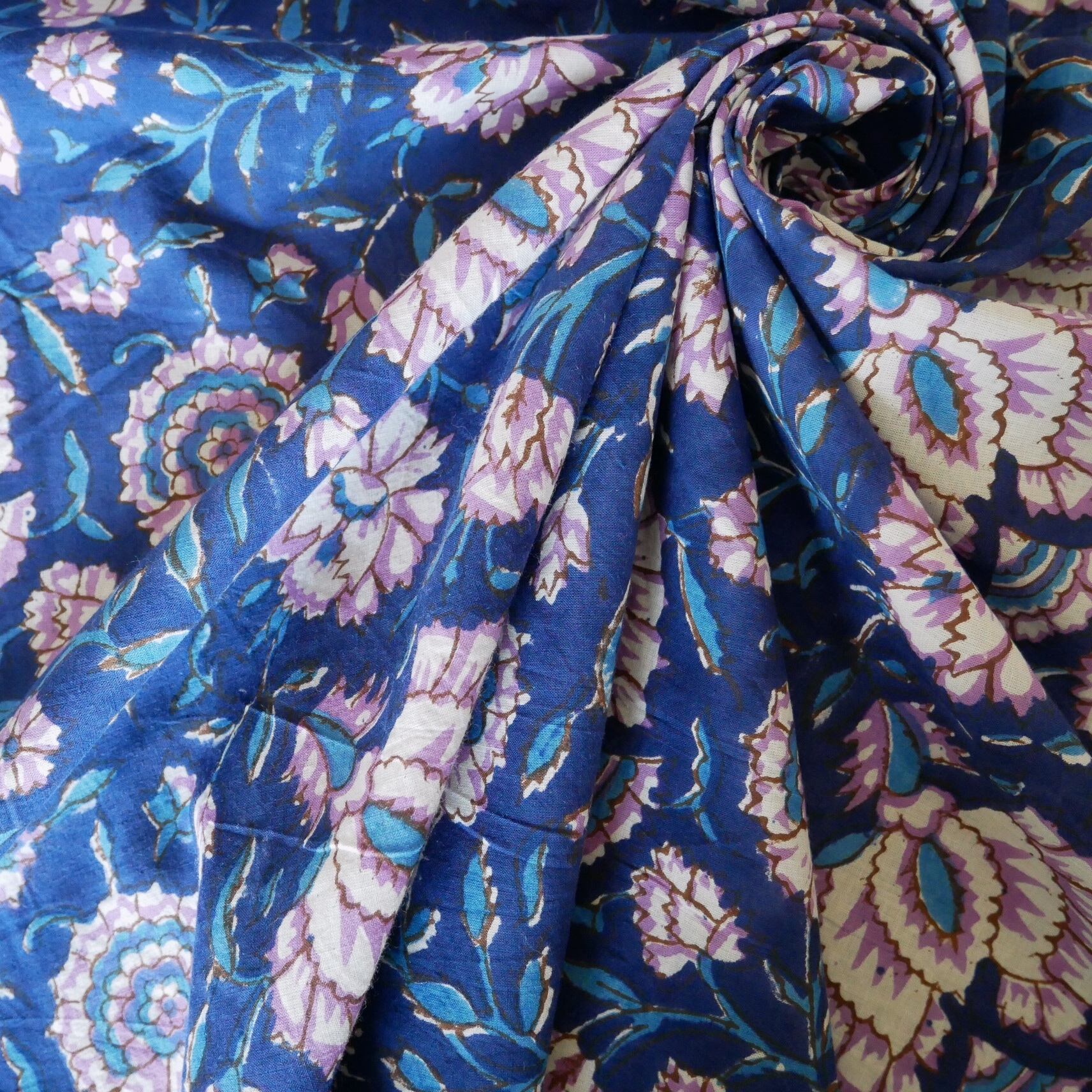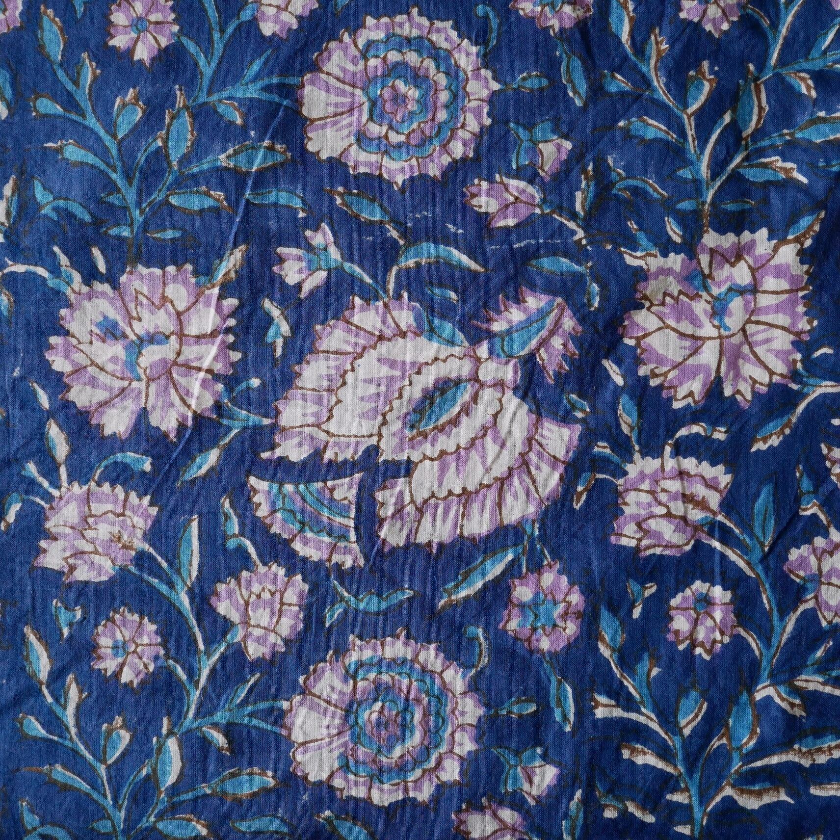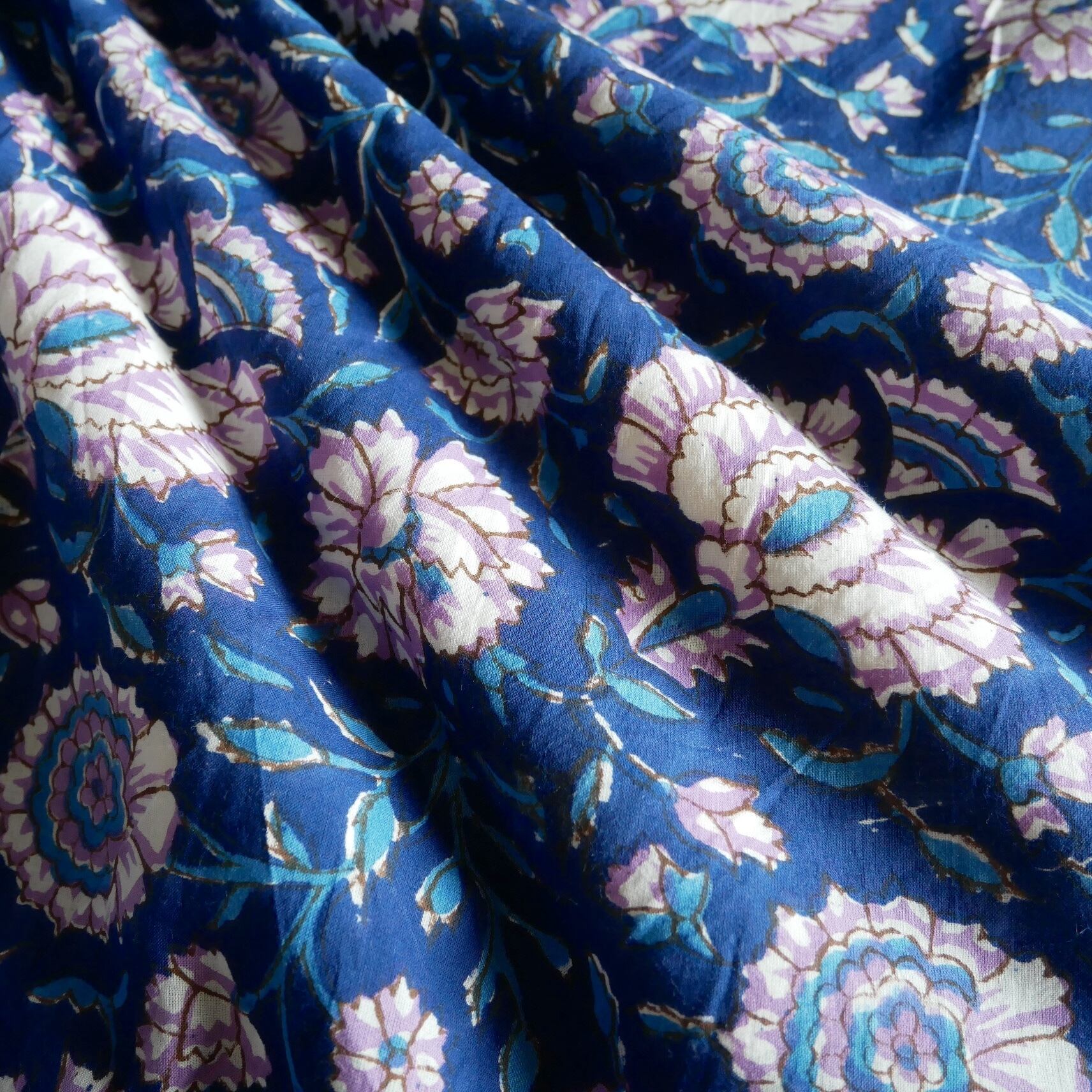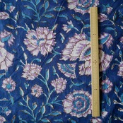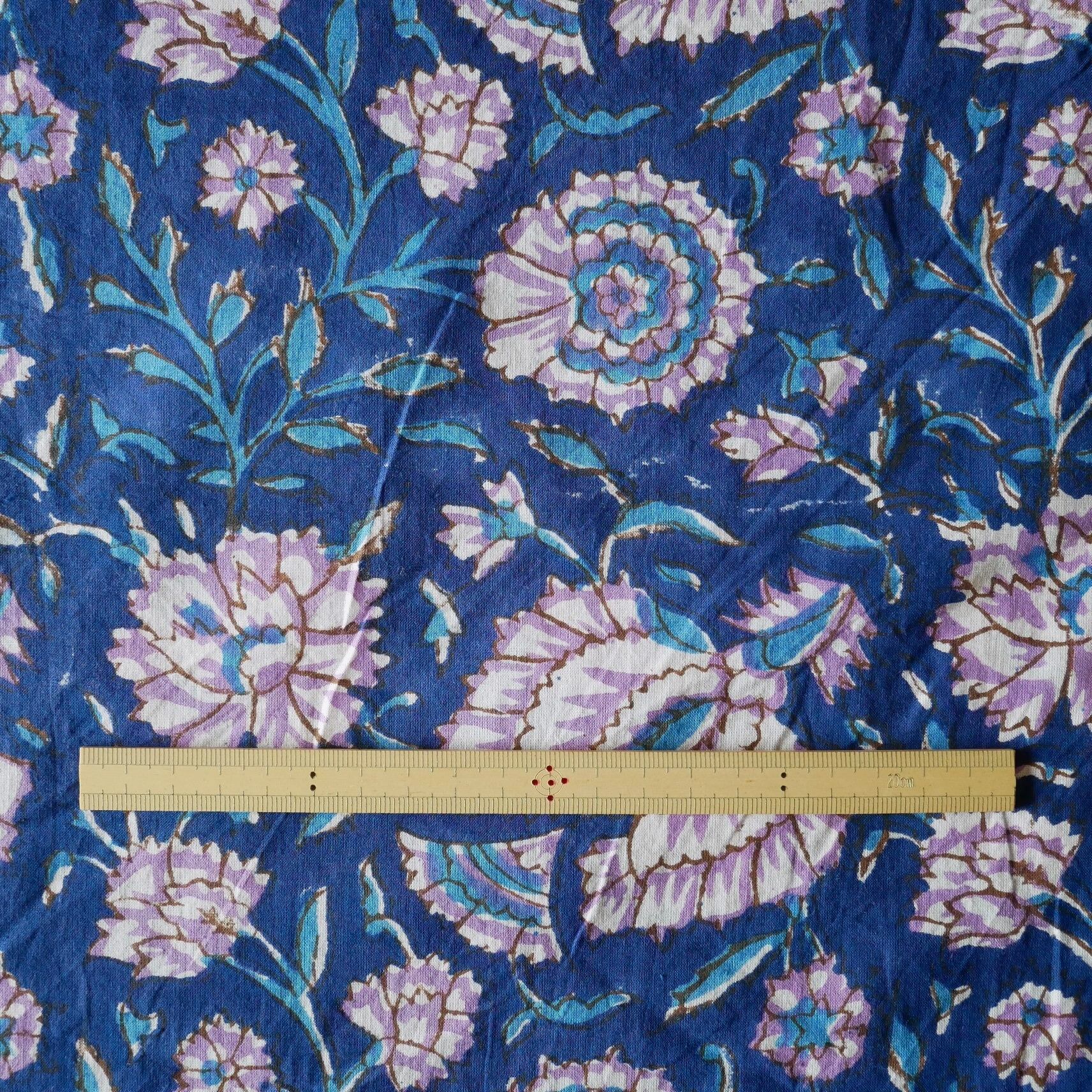 ハンドブロックプリント生地 インド更紗 綿生地 ネイビーベース×パープルフラワー 薄手コットン JE-250603