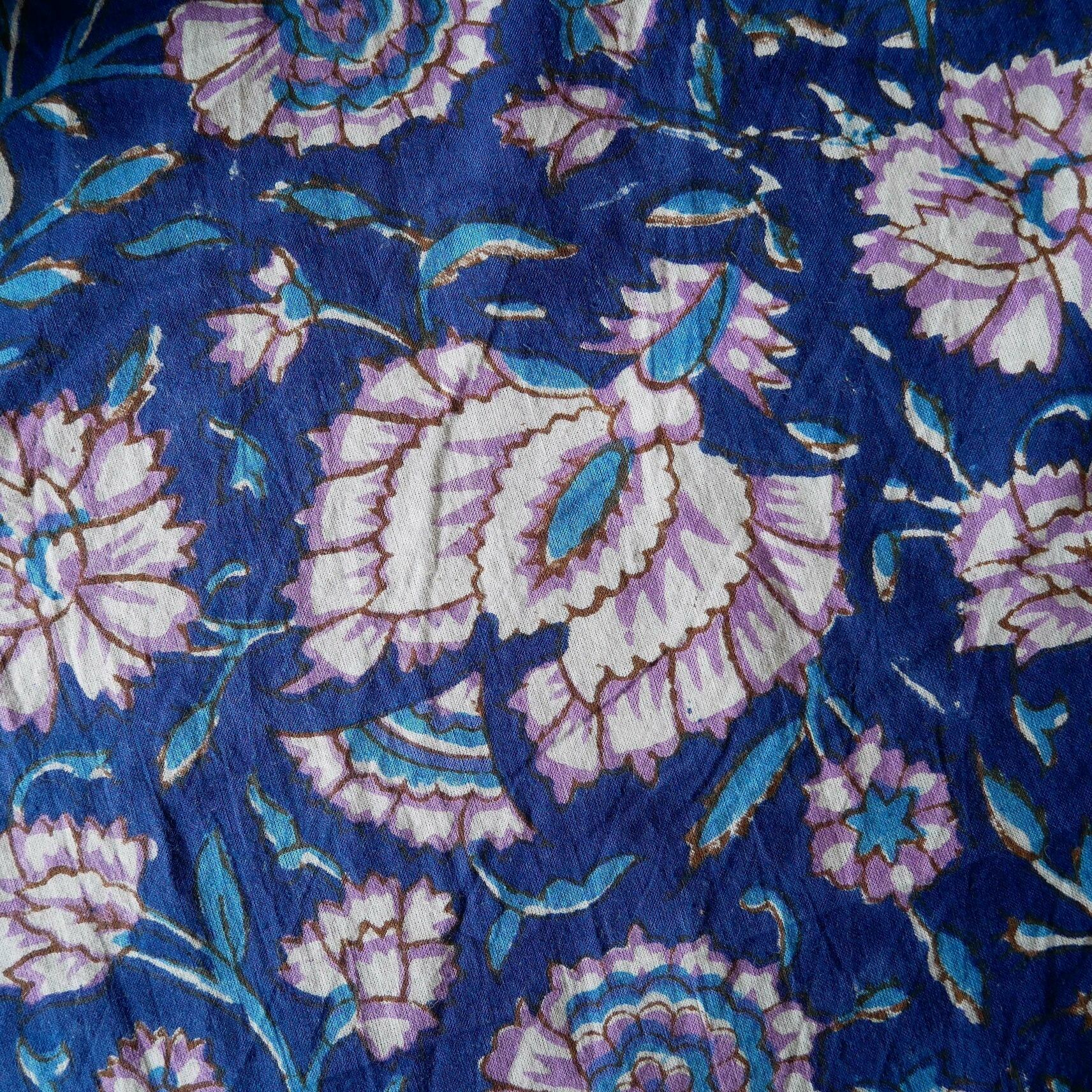 ◾️落ち着いたネイビーに、やさしいパープルの花々が映える、上品な印象のブロックプリント生地