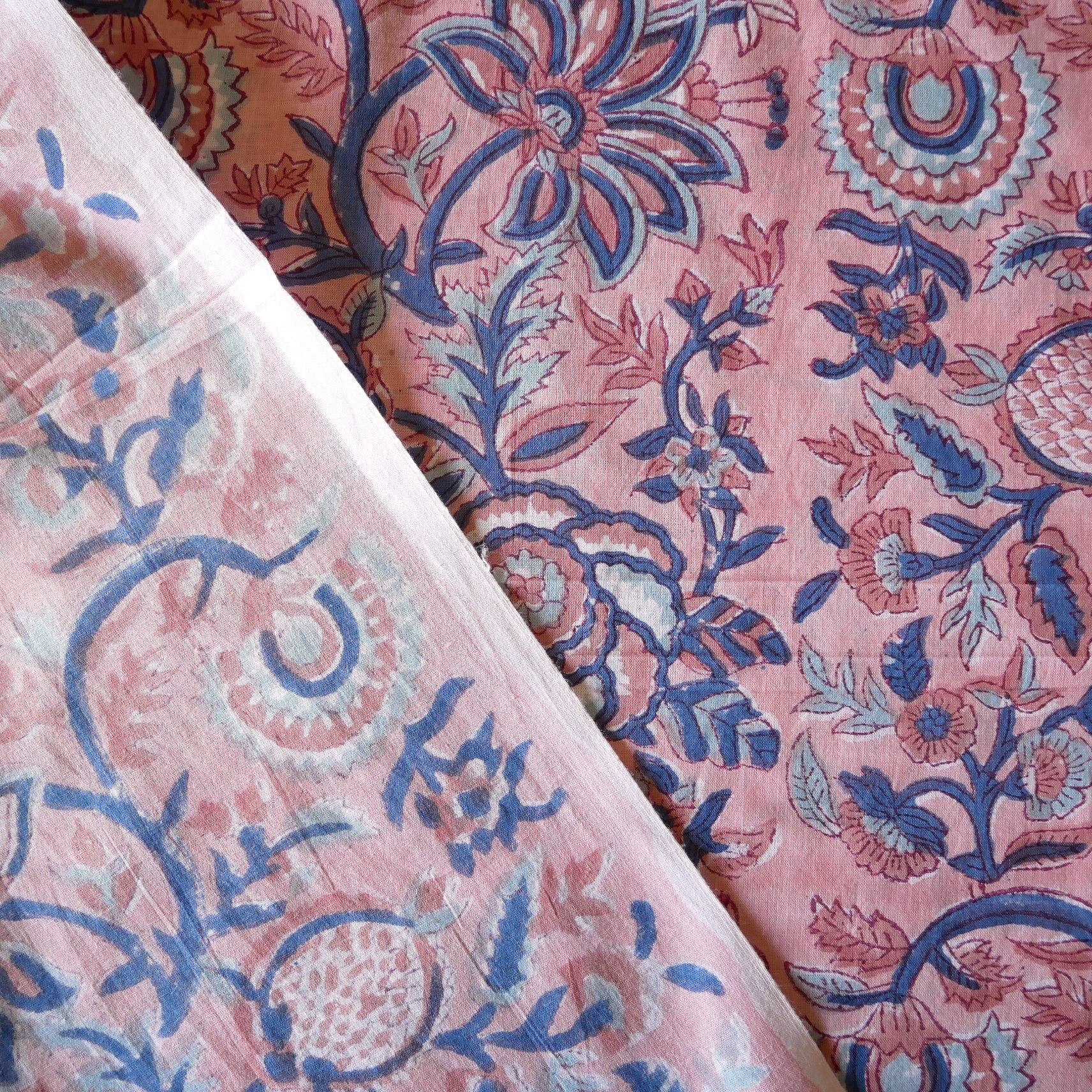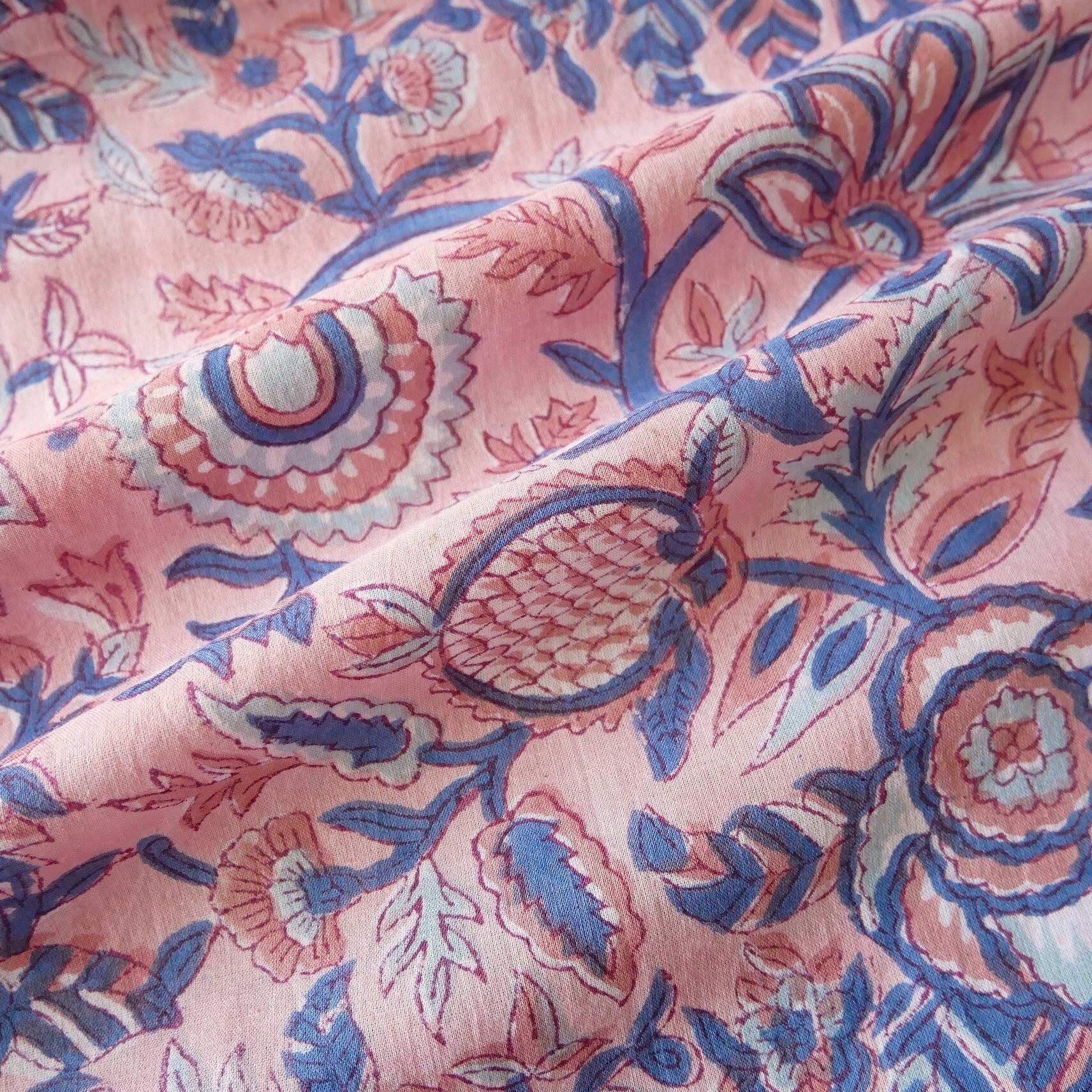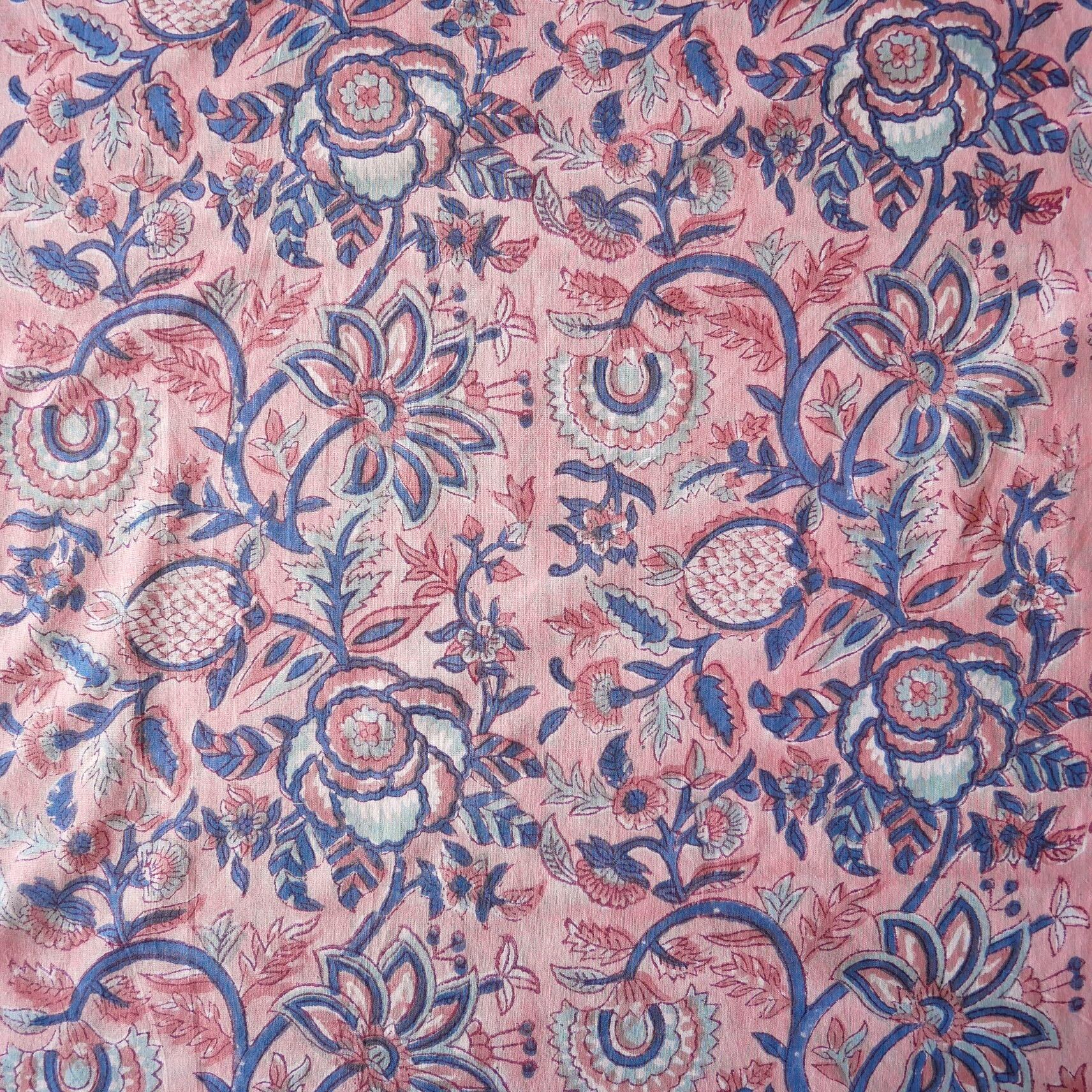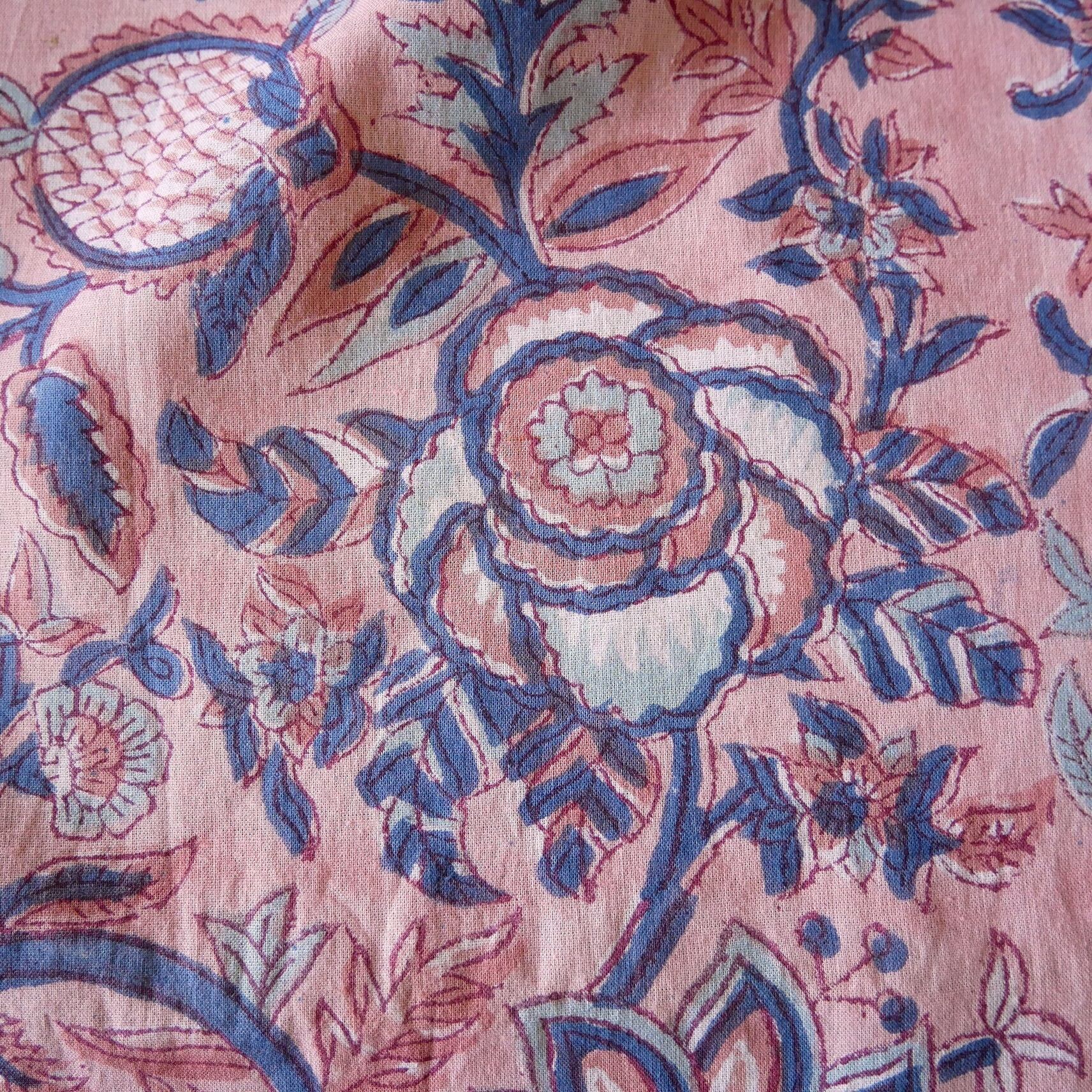 ラスト10点(約1m)ハンドブロックプリント生地 インド更紗 綿生地 ピンクベース×花と実のモチーフ 薄手コットンJE-250607