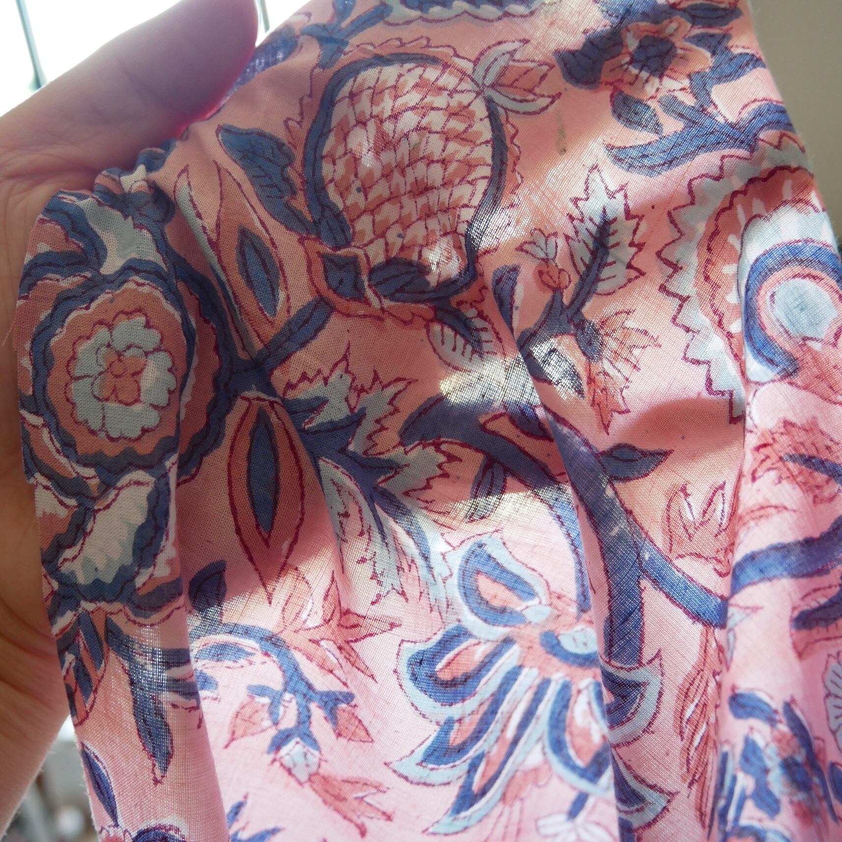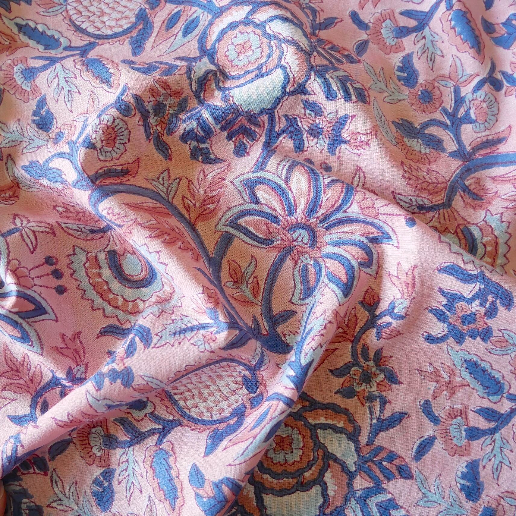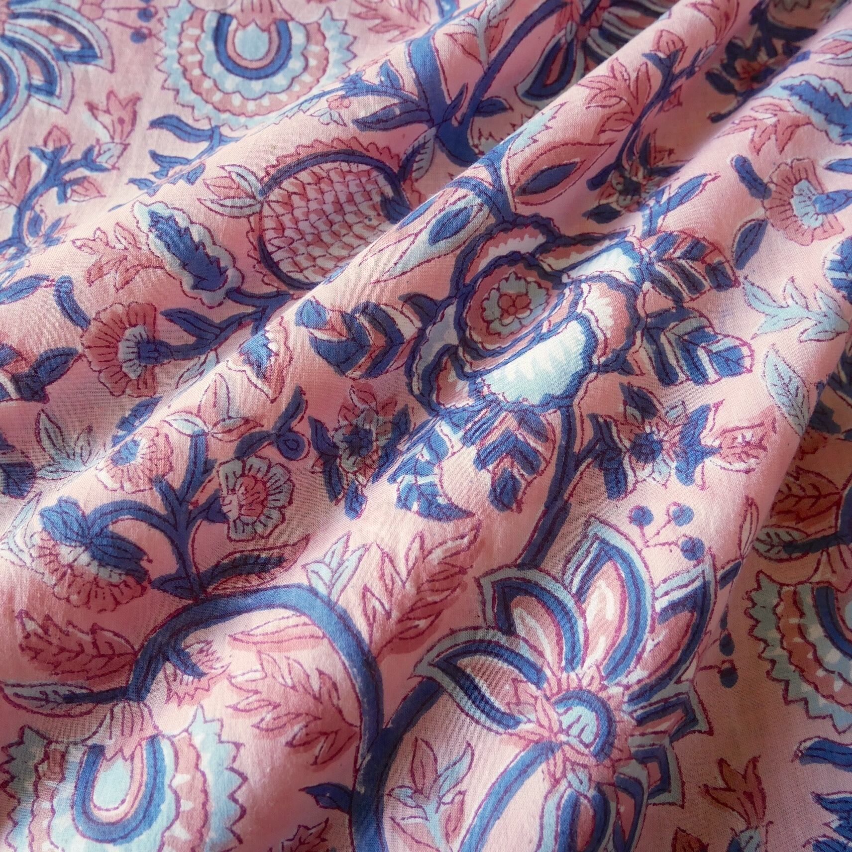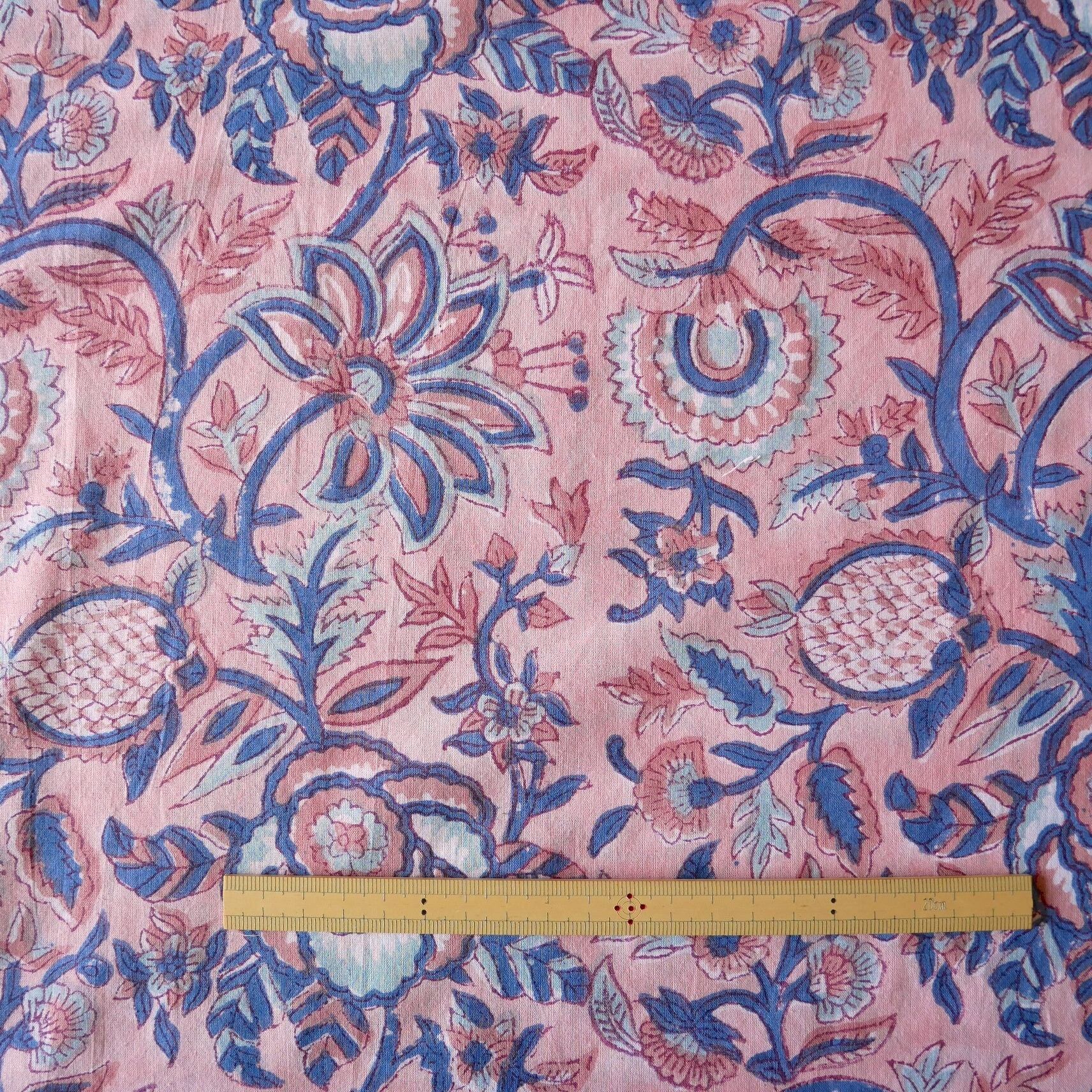ラスト10点(約1m)ハンドブロックプリント生地 インド更紗 綿生地 ピンクベース×花と実のモチーフ 薄手コットンJE-250607
