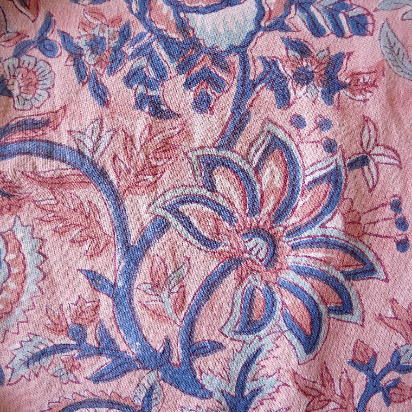この生地は、インドの工房で木版を使い、一版ずつ丁寧に手作業で染められた伝統的なハンドブロックプリント。