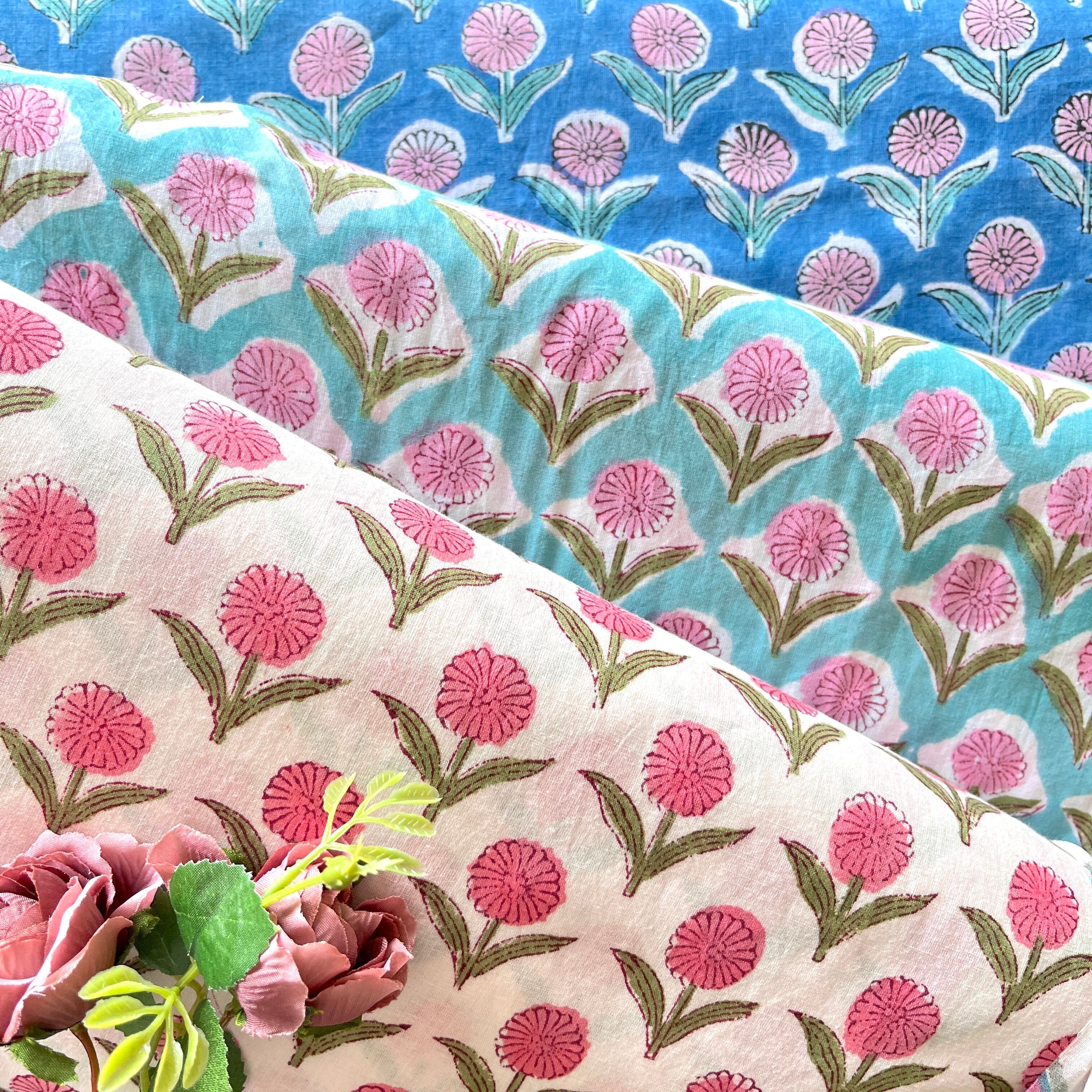 再入荷:ハンドブロックプリント生地 インド更紗 綿生地 ターコイズベース×ピンクフラワーモチーフ 薄手コットン LT-250851