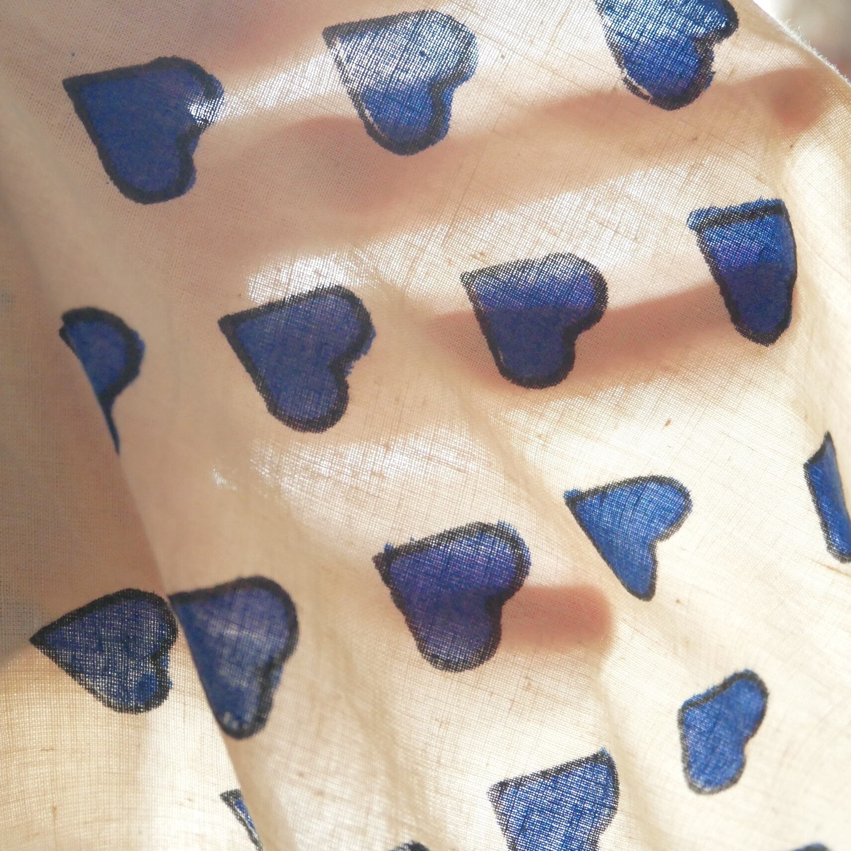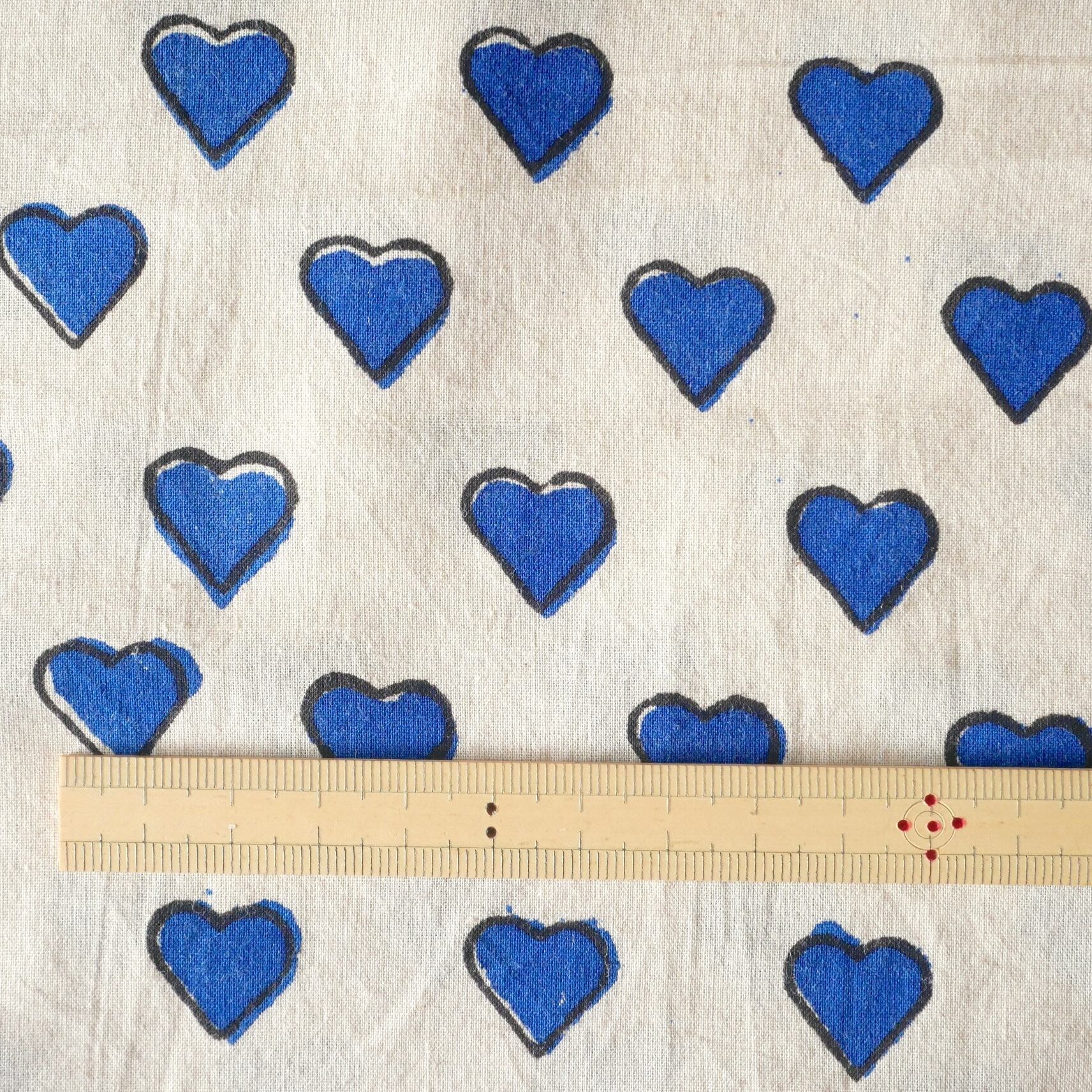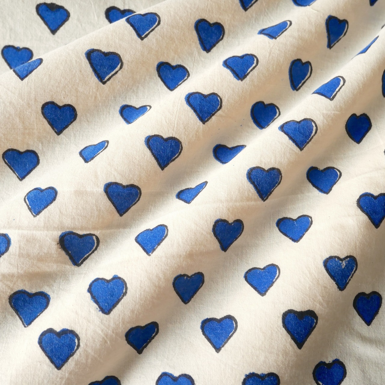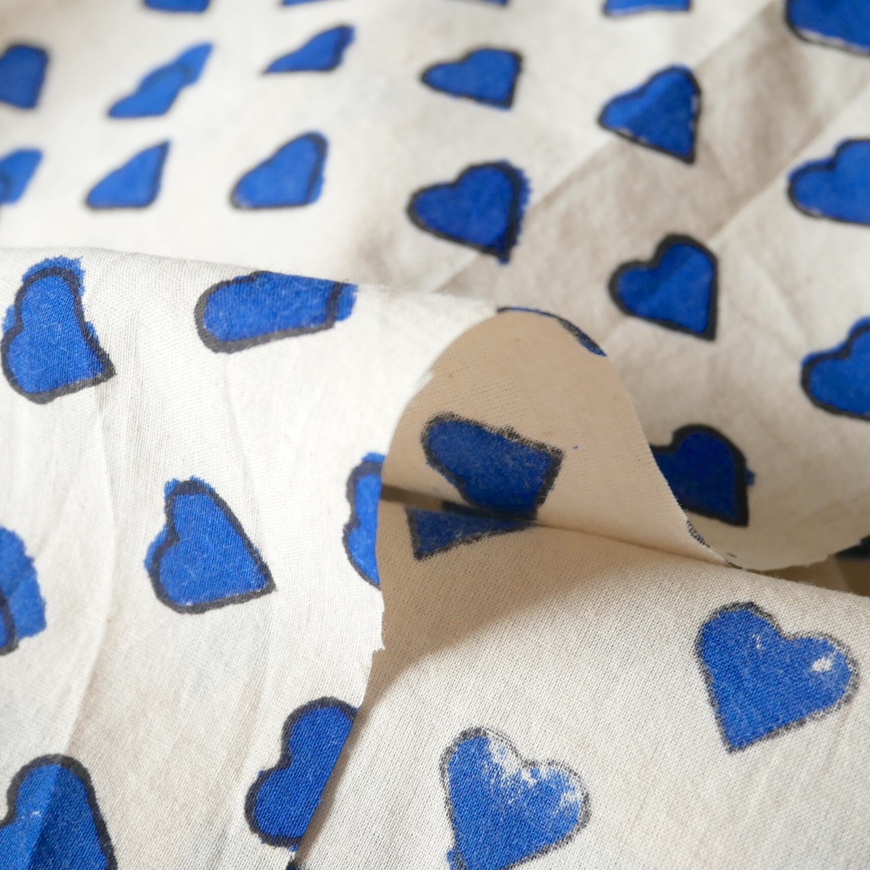ナチュラルな生成りベース(ほんのりベージュを含んだ自然なトーン)に、青一色のハートが並んだ、爽やかで優しい印象のブロックプリント生地が入荷しました!