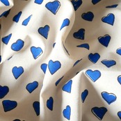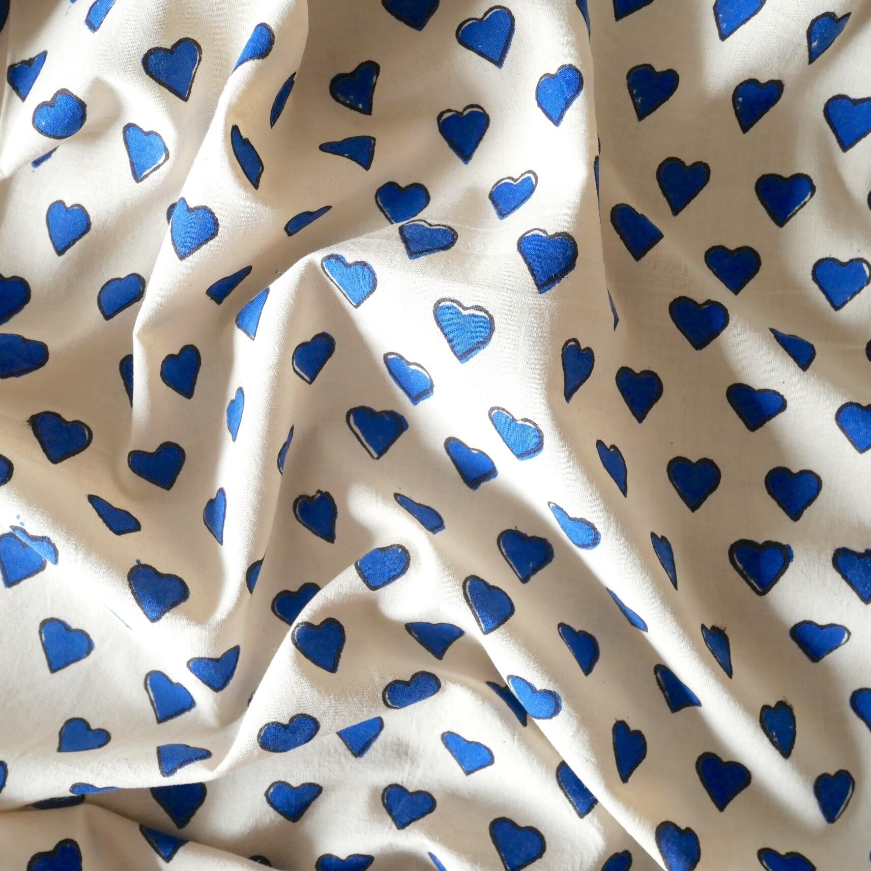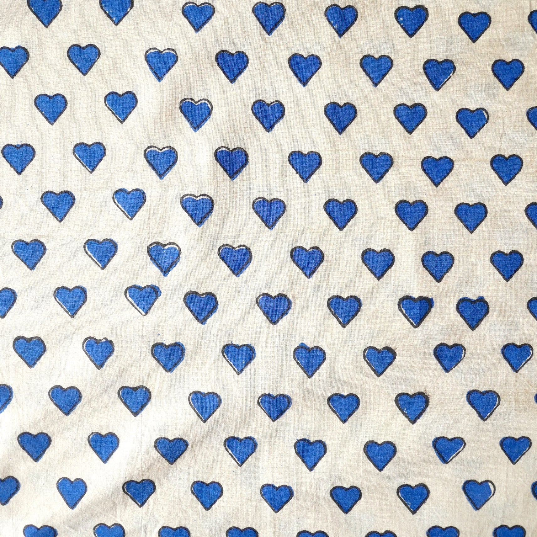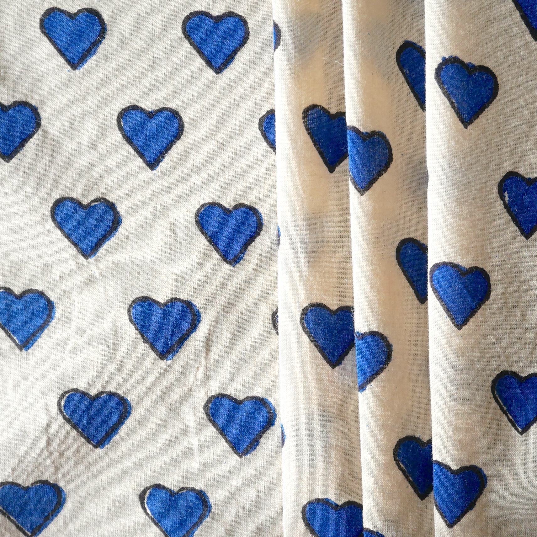 ナチュラルな生成りベース(ほんのりベージュを含んだ自然なトーン)に、青一色のハートが並んだ、爽やかで優しい印象のブロックプリント生地が入荷しました!