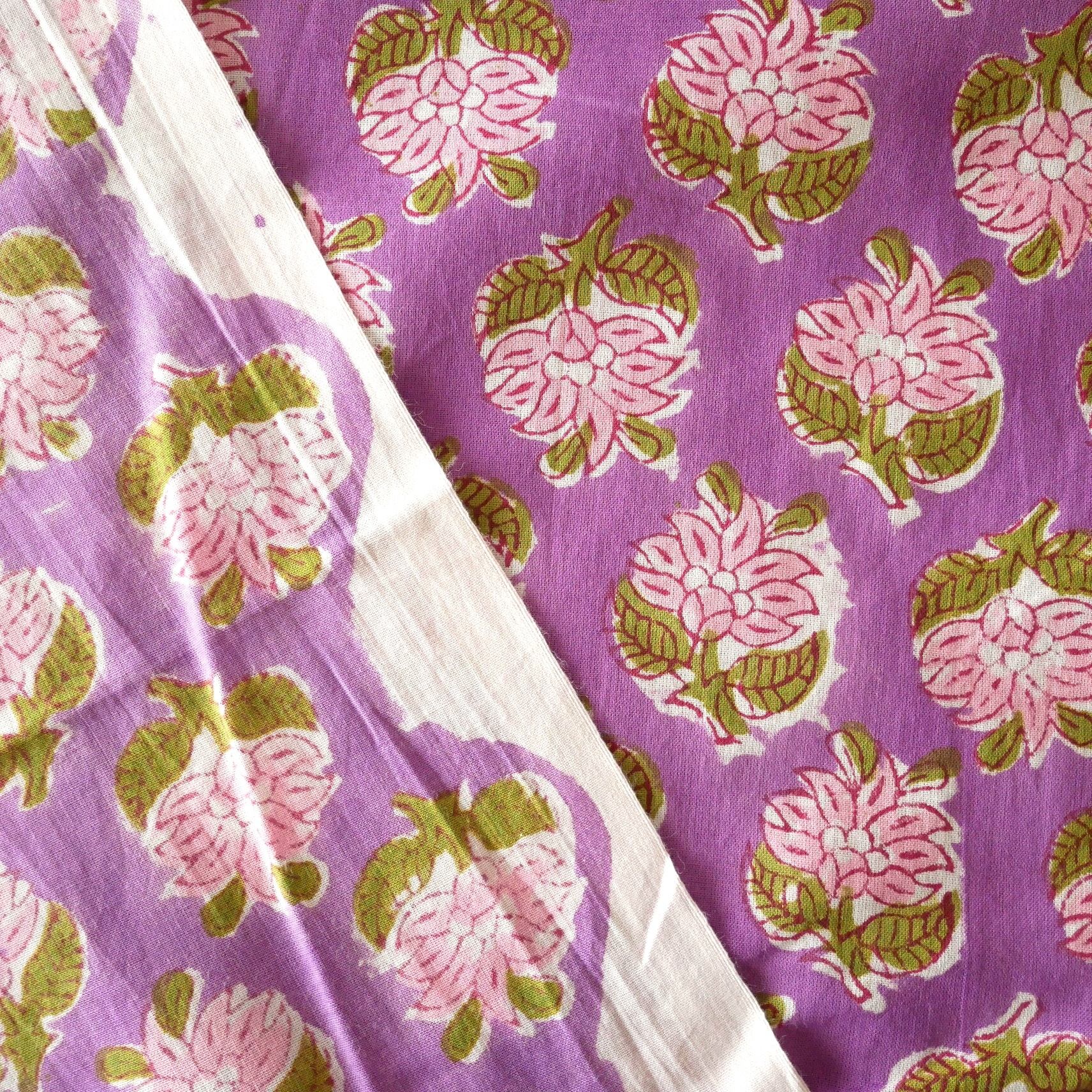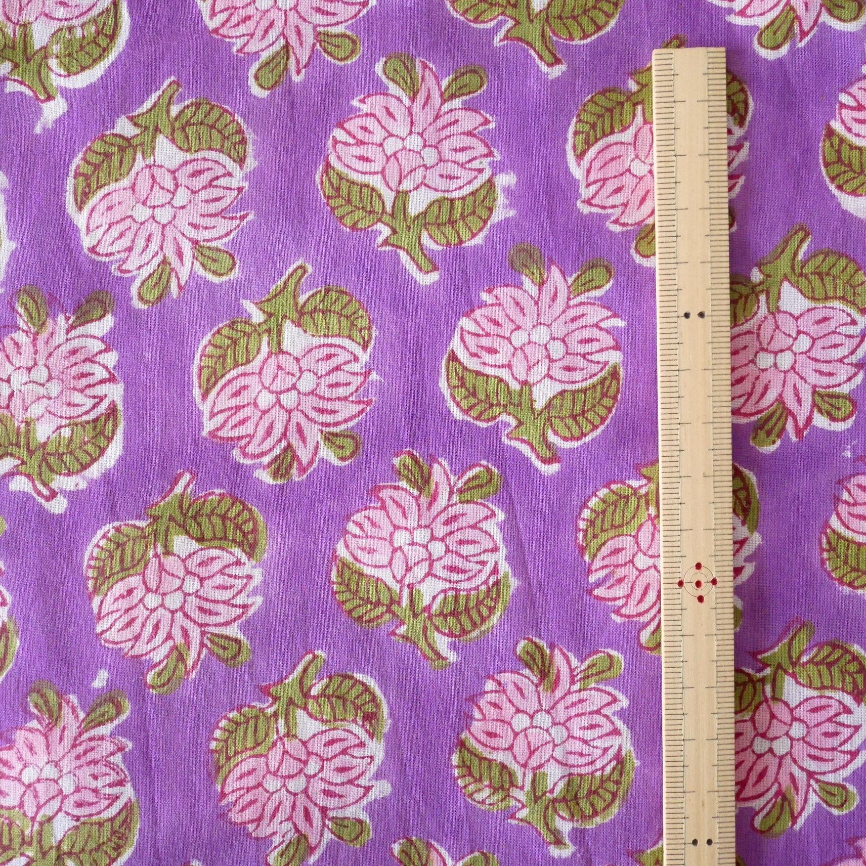 ラスト18点(約1.8cm) ハンドブロックプリント生地 インド更紗 綿生地 パープルベース×ピンクの花模様 薄手コットン LT-250638