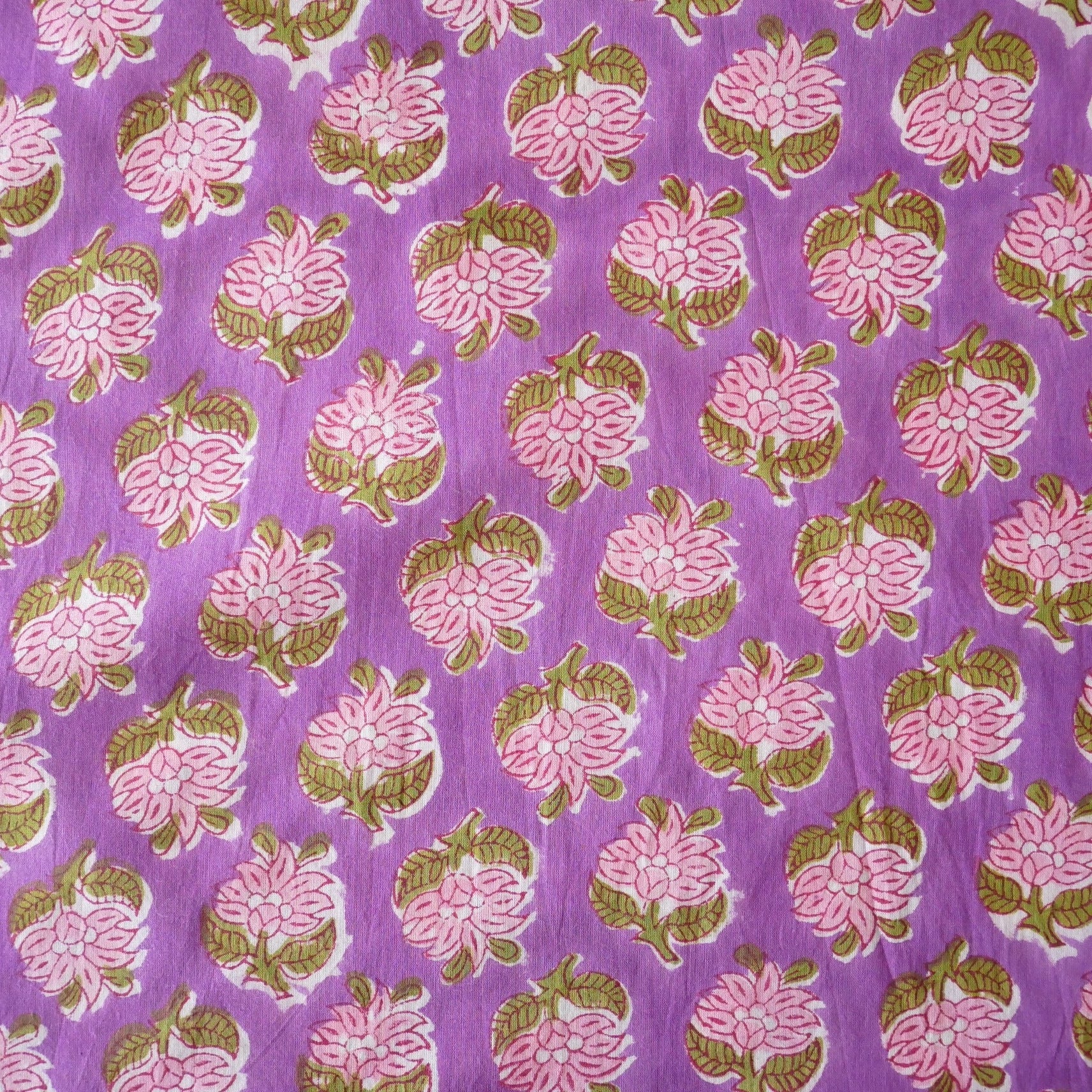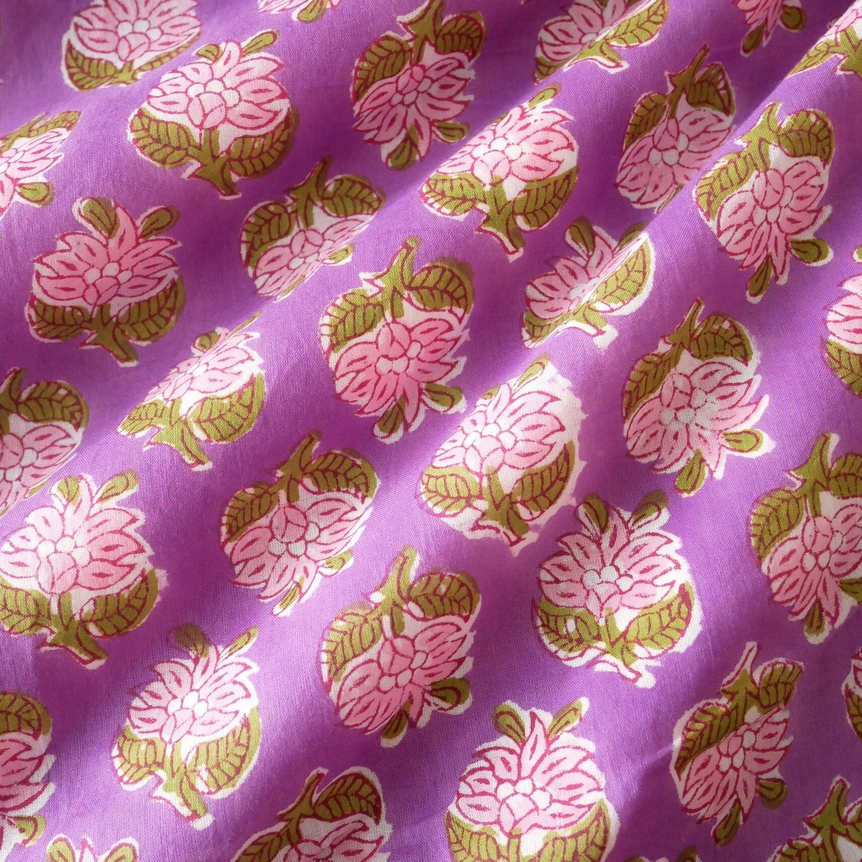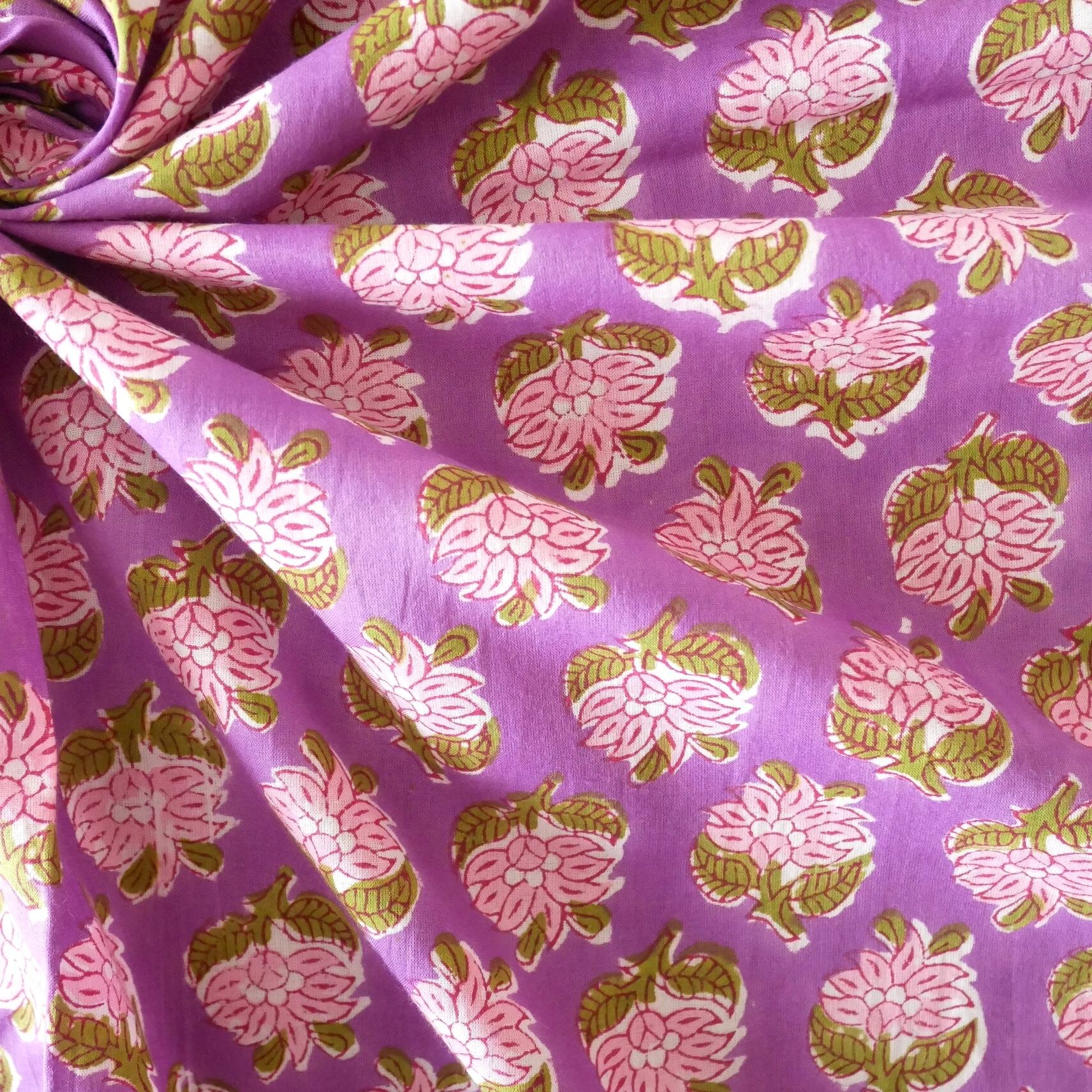 鮮やかなパープルをベースに、ピンクの花々とモスグリーンの葉がリズムよく並ぶ、インドのハンドブロックプリント生地が入荷しました!
