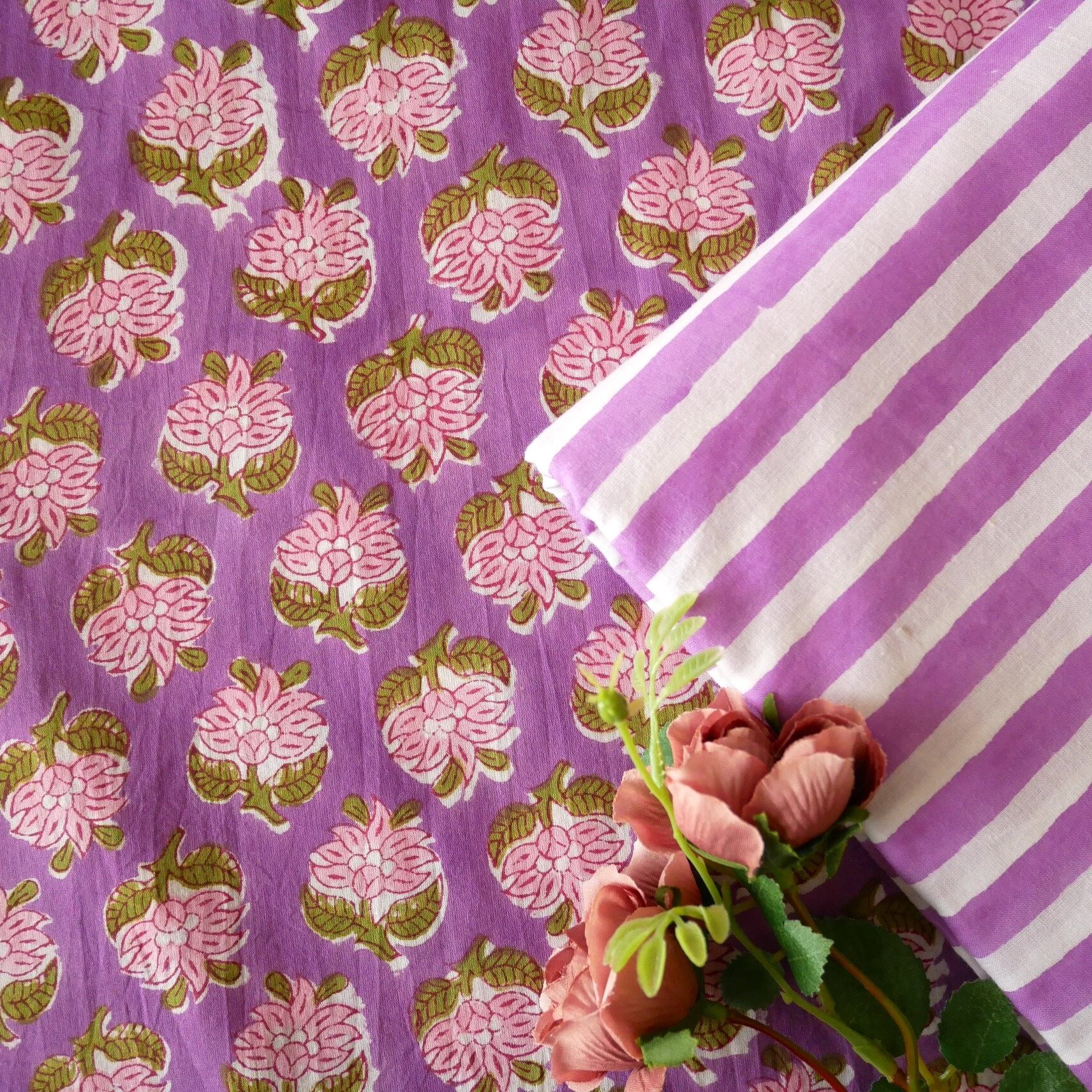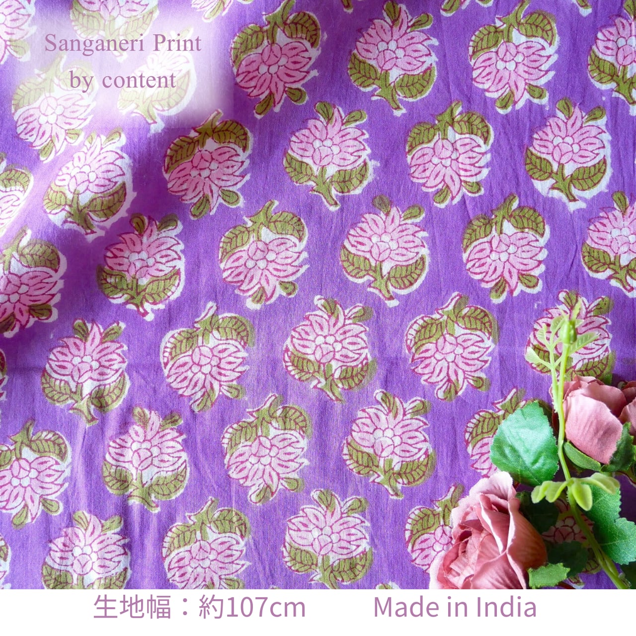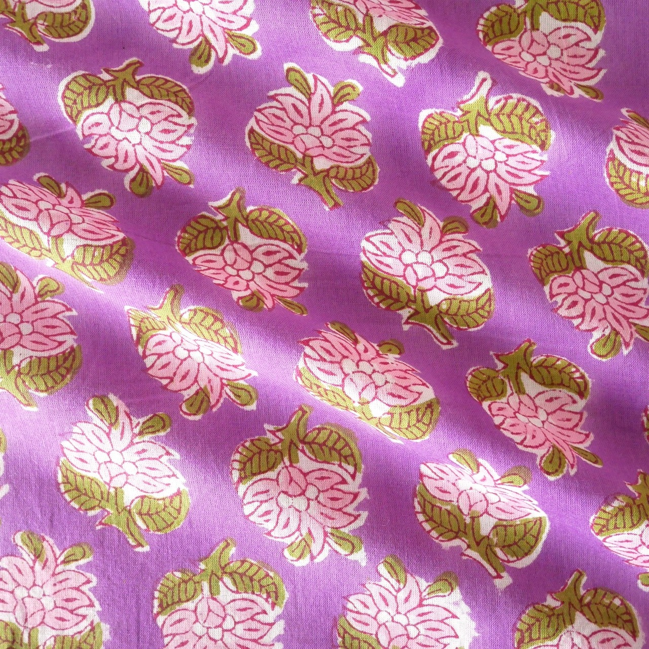 鮮やかなパープルをベースに、ピンクの花々とモスグリーンの葉がリズムよく並ぶ、インドのハンドブロックプリント生地が入荷しました!