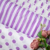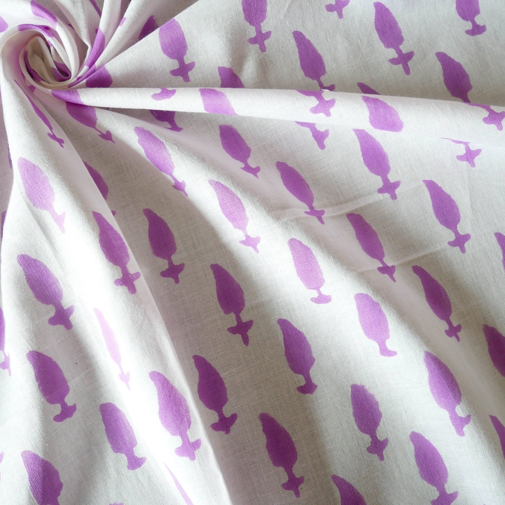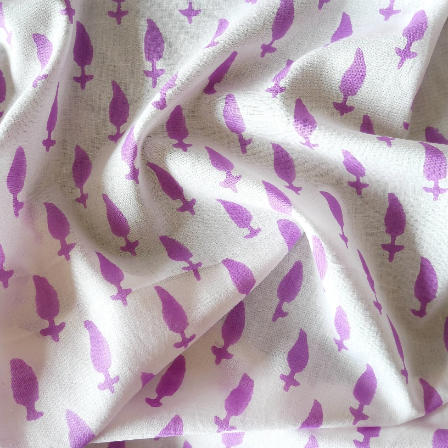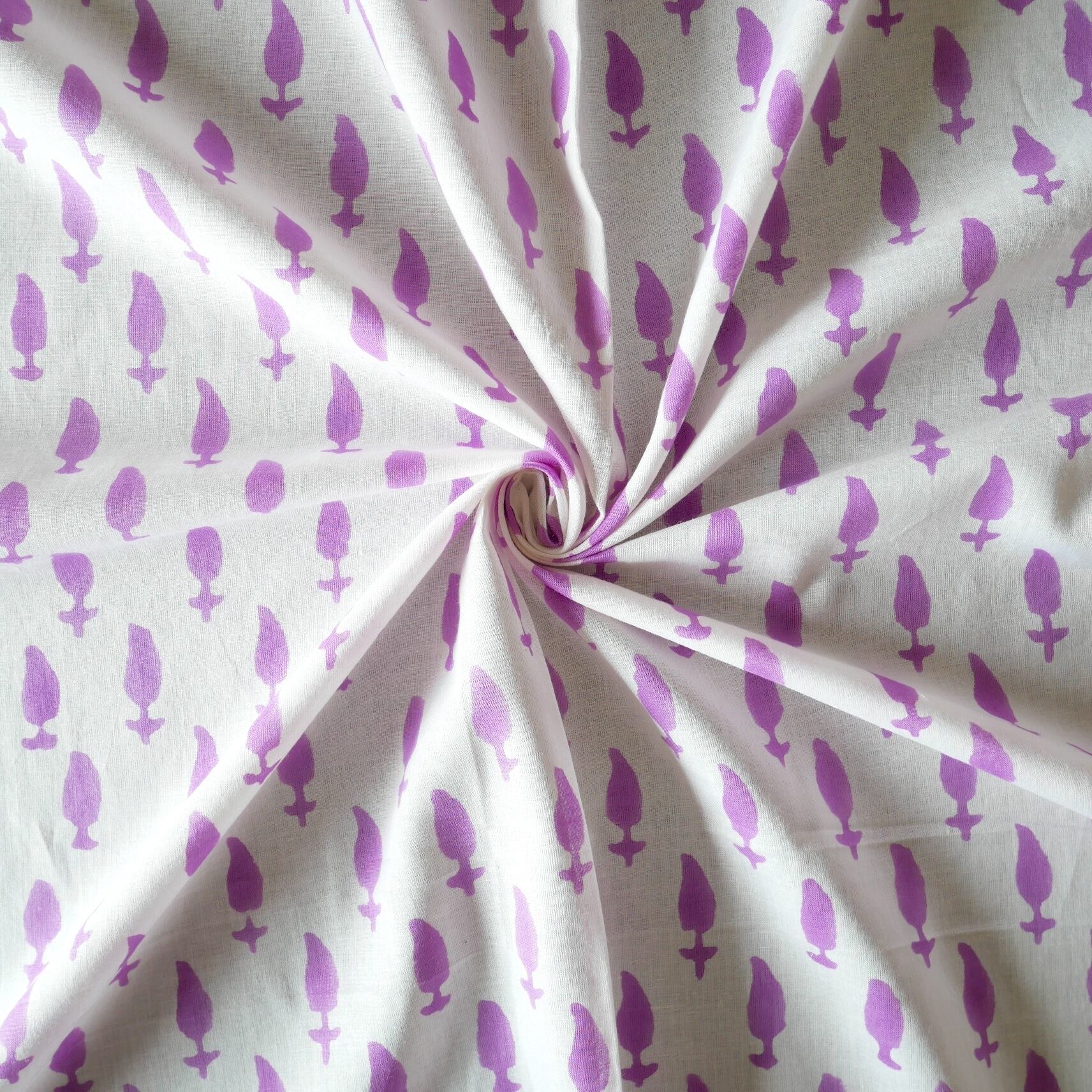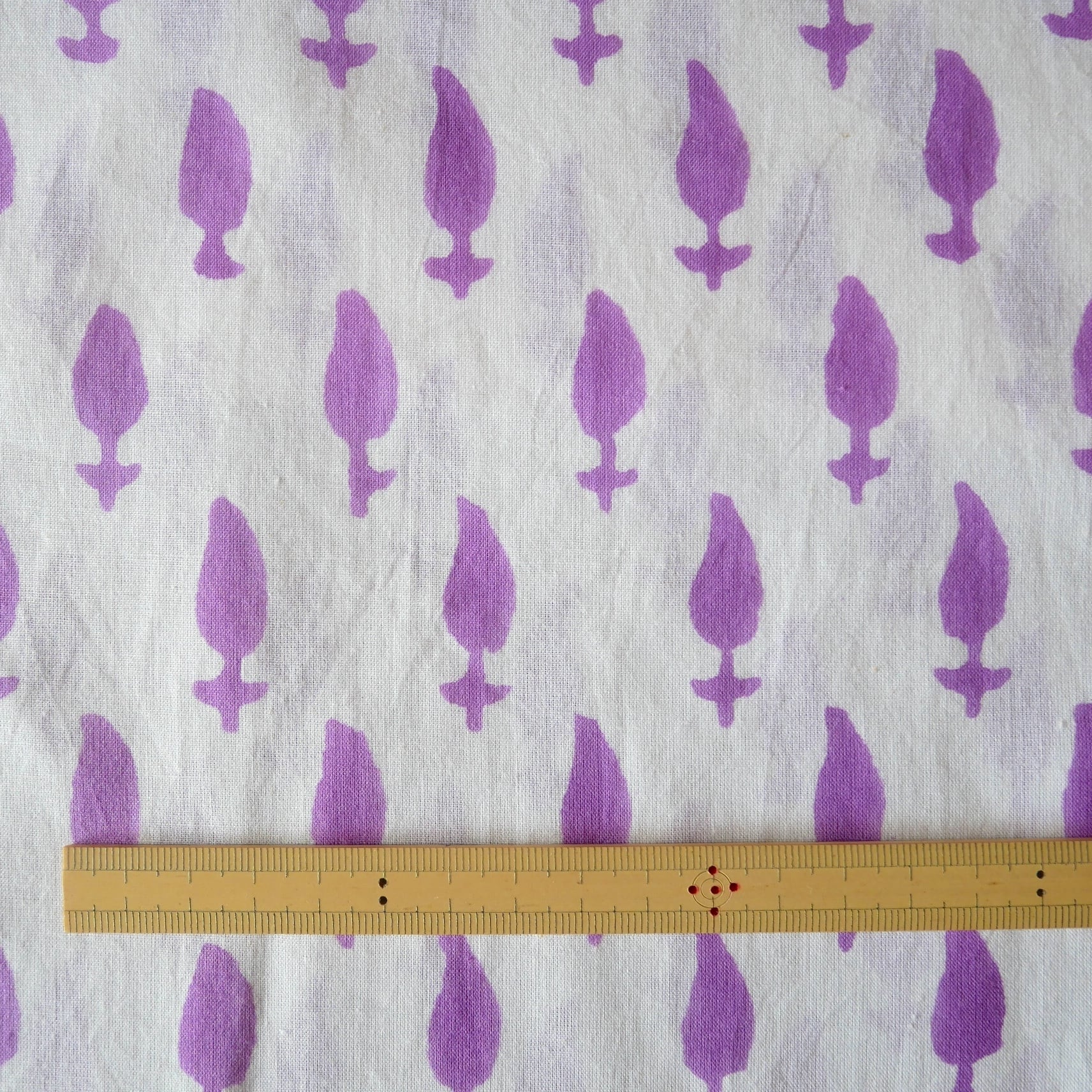 ハンドブロックプリント生地 インド更紗 綿生地 ホワイトベース×ラベンダーパープルの植物モチーフ 薄手コットン JE-250706