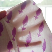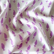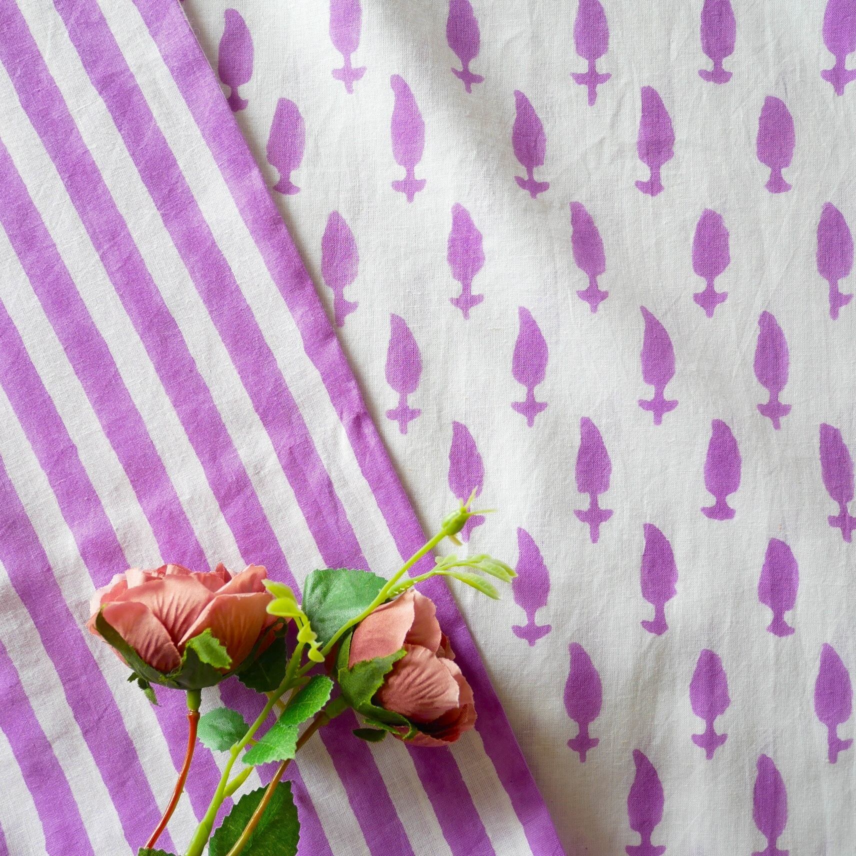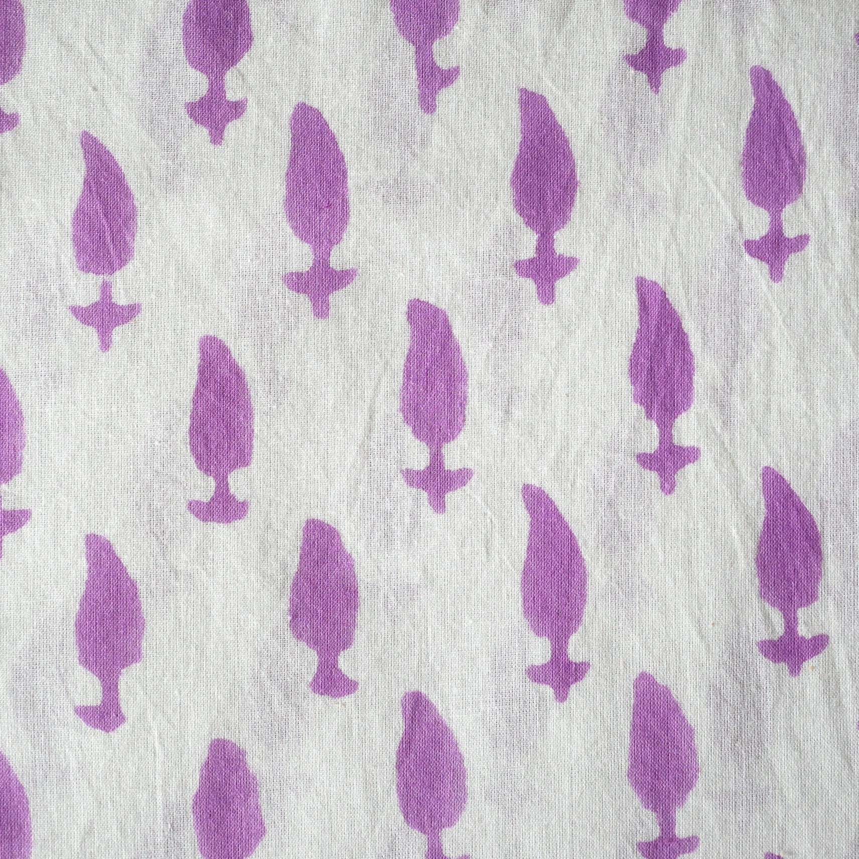 ホワイトベースに、ピンク味のあるパープルで描かれた植物の小さなシルエットが可愛らしく並ぶ、インドのハンドブロックプリント生地が入荷しました!