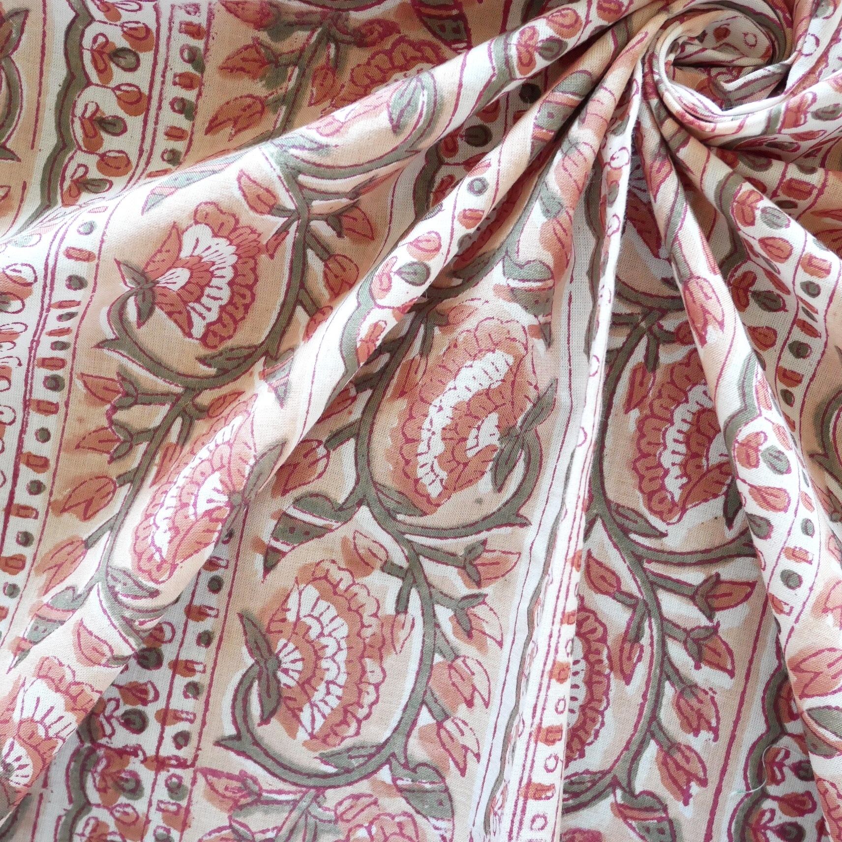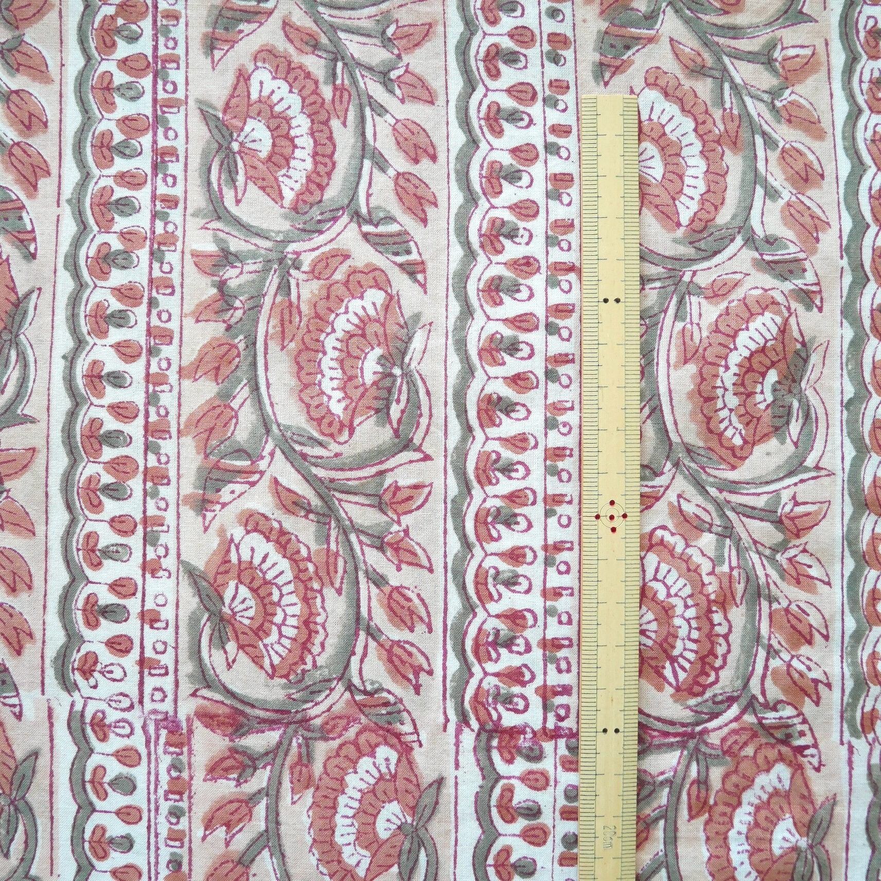 ハンドブロックプリント生地 インド更紗 綿生地 ベージュベース×フラワーストライプ模様 薄手コットン JE-250720