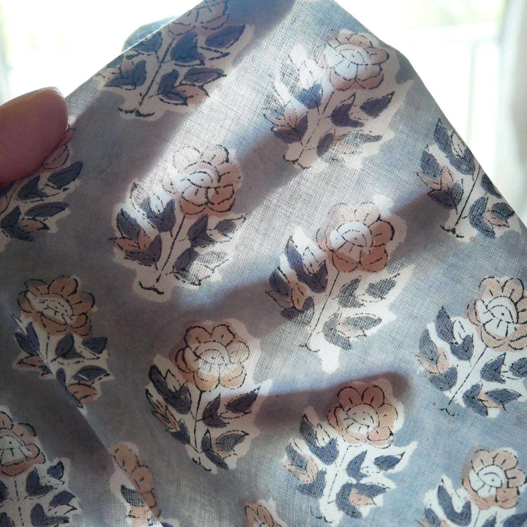 淡いグレーベースに、ベージュの小花を丁寧に並べた、可愛らしくも落ち着いた雰囲気のブロックプリント生地が入荷しました!