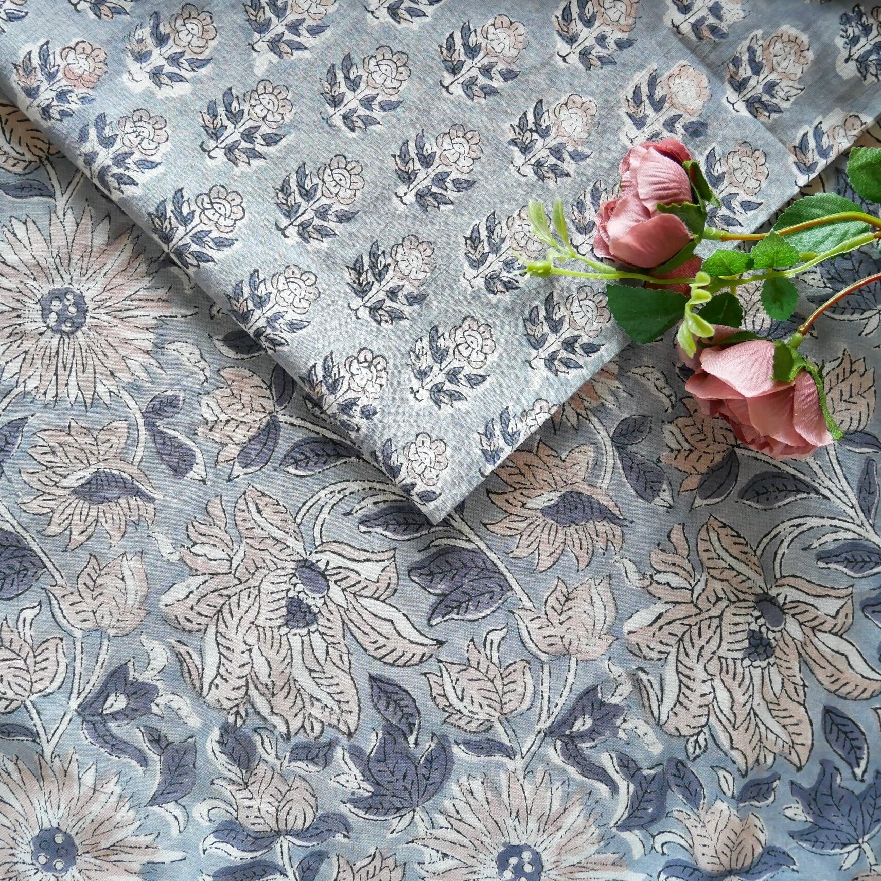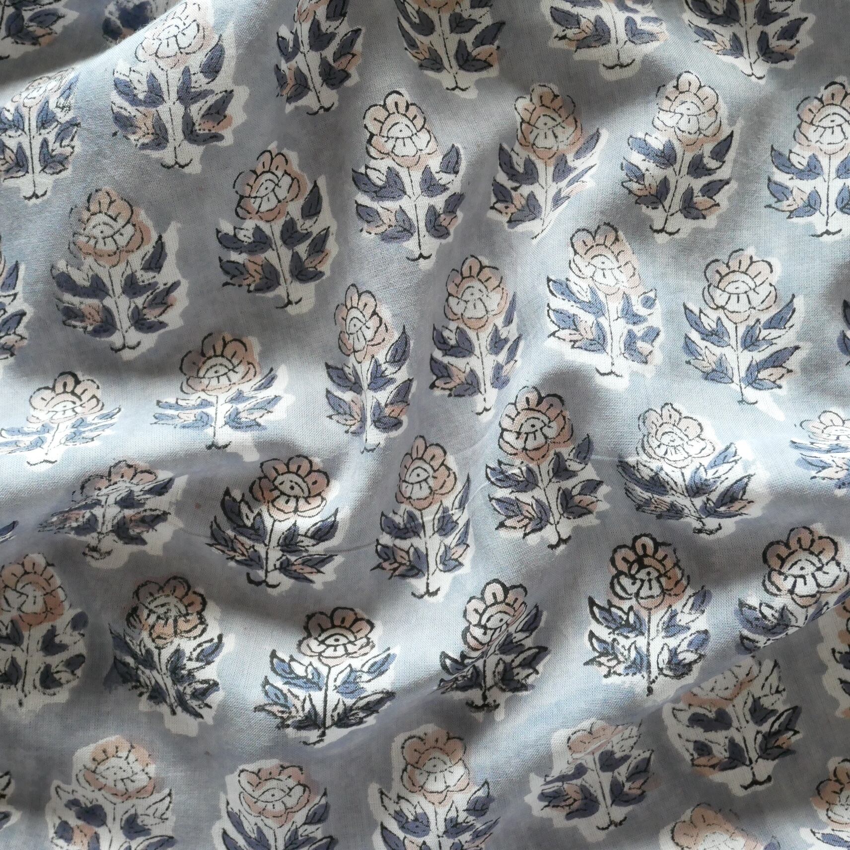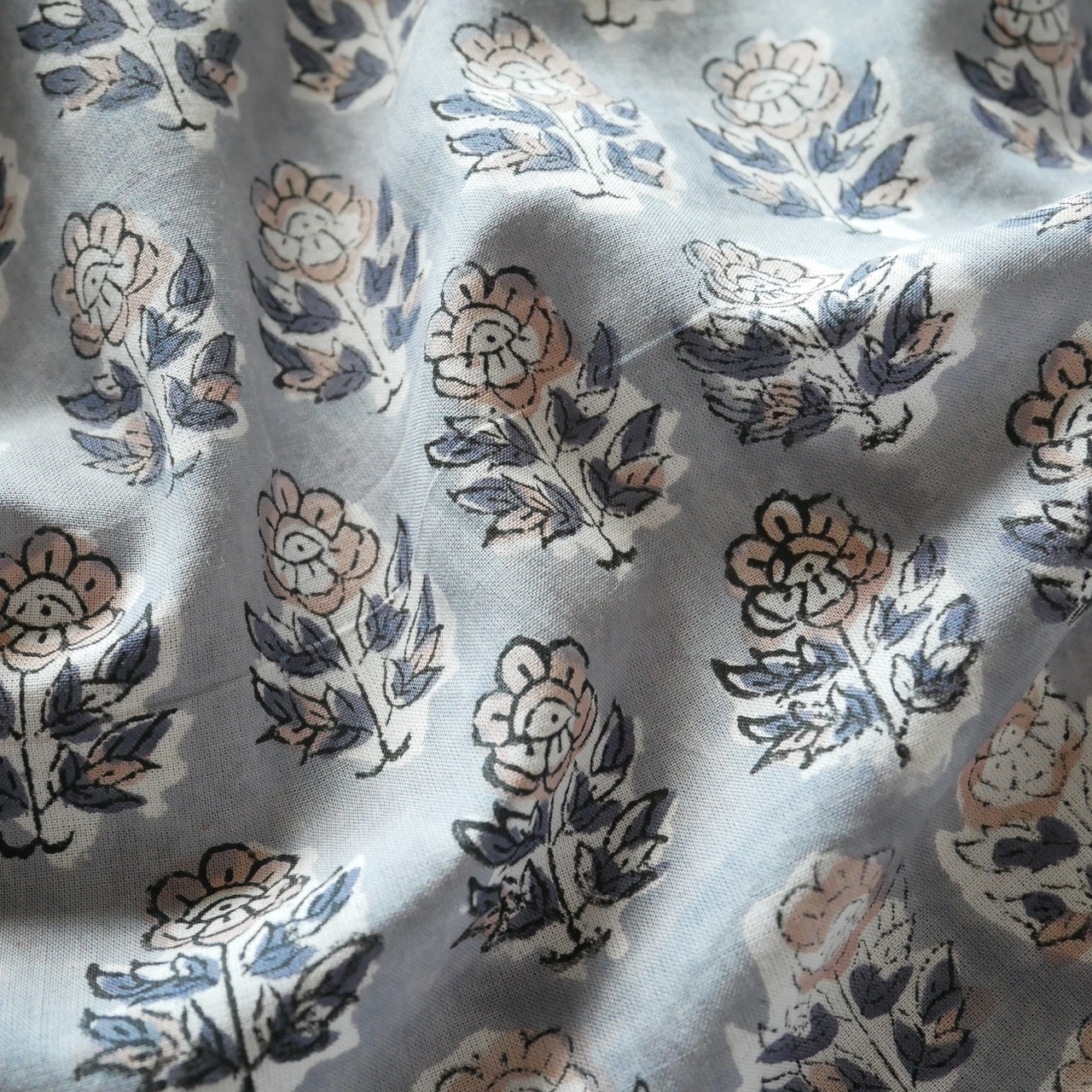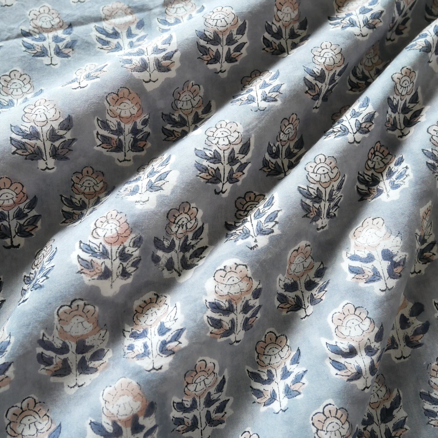 ハンドブロックプリント生地 インド更紗 綿生地 グレーベース×ベージュ小花模様(Buti柄)薄手コットン JE-250709