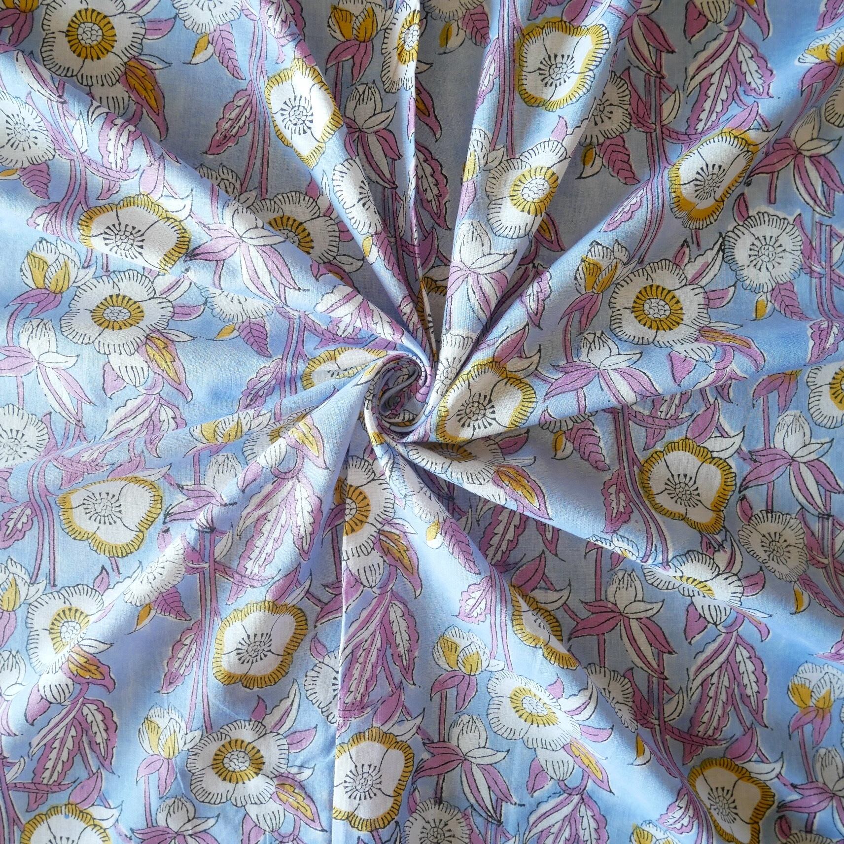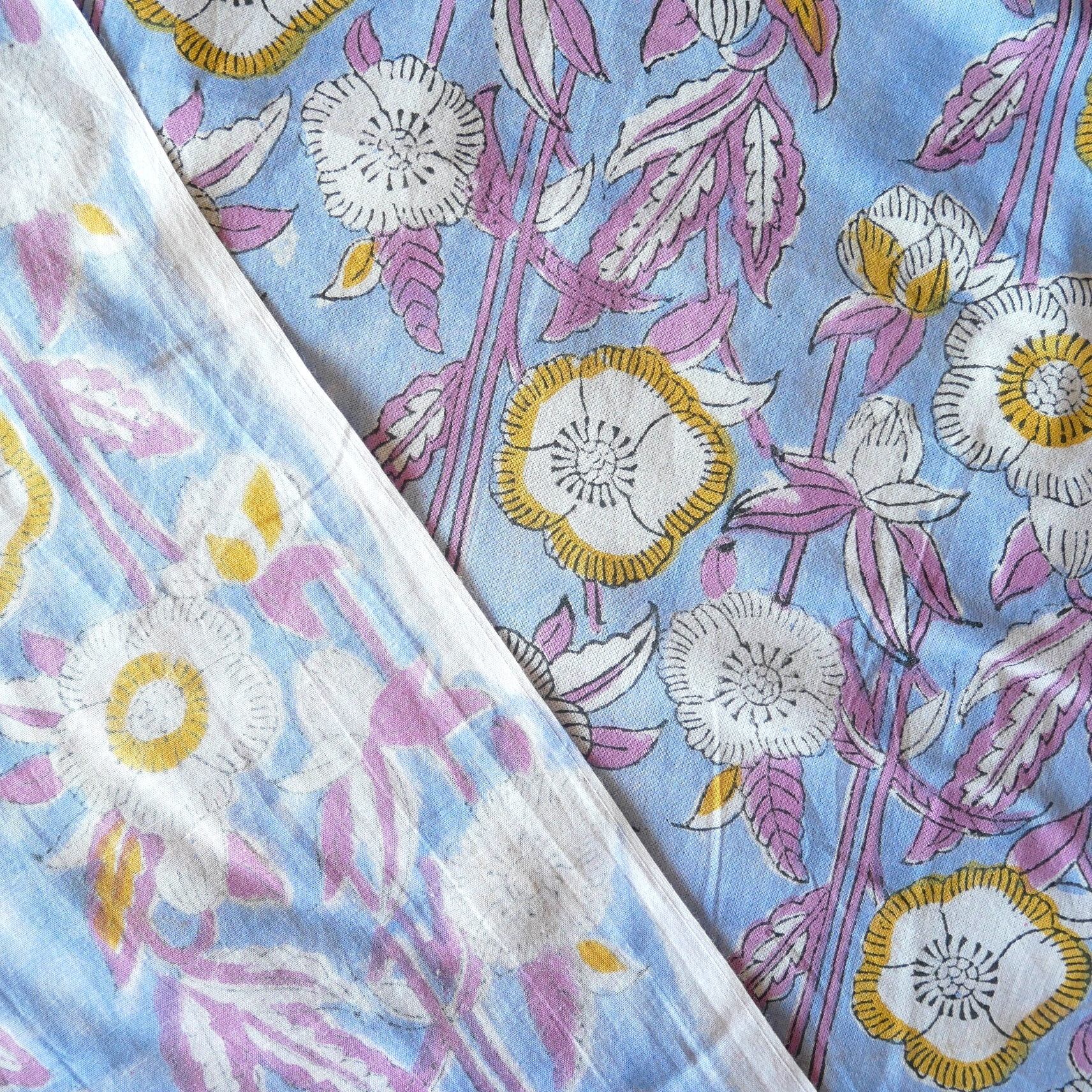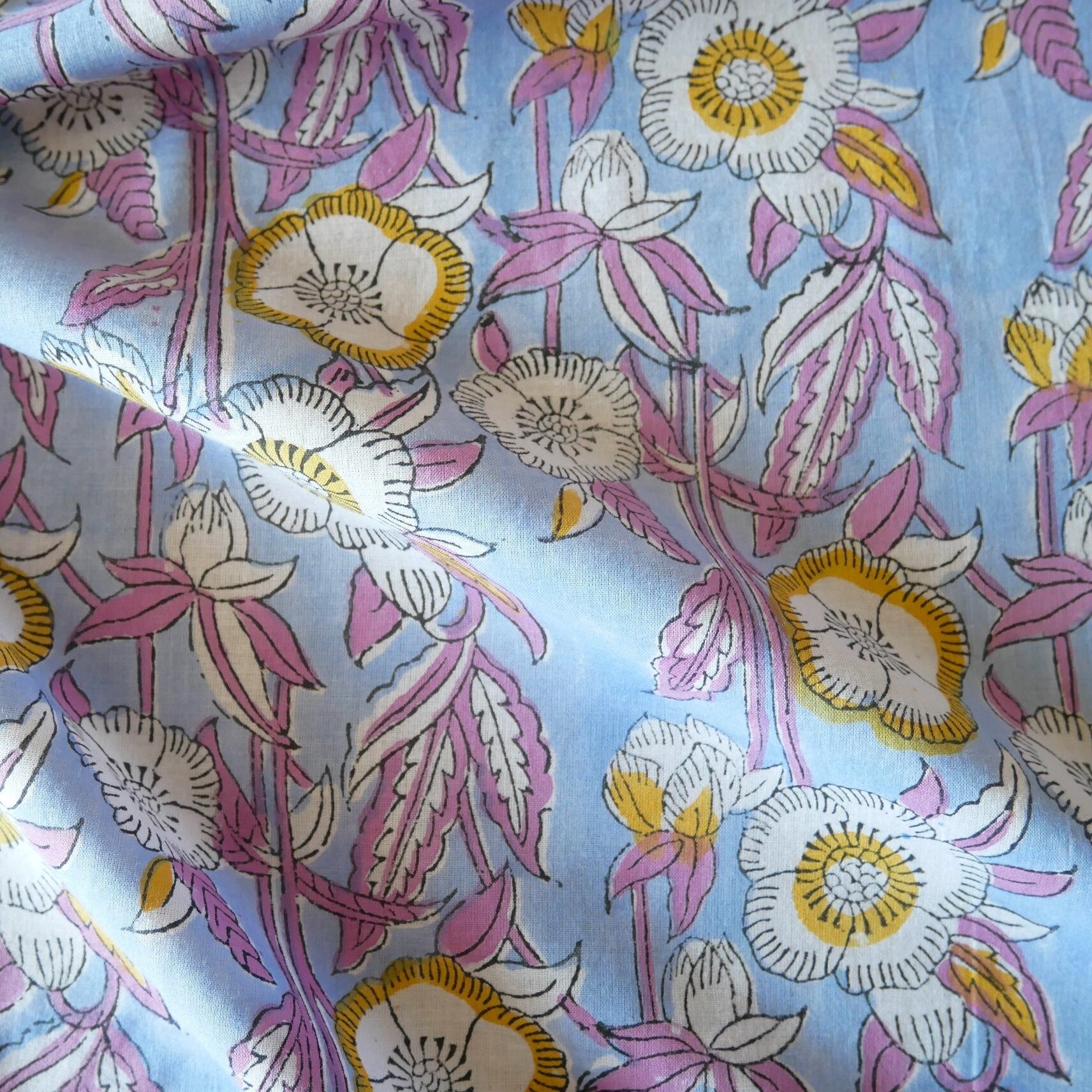 ハンドブロックプリント生地 インド更紗 綿生地 サックスブルー×紫とイエローの花模様 薄手コットン JE-250716