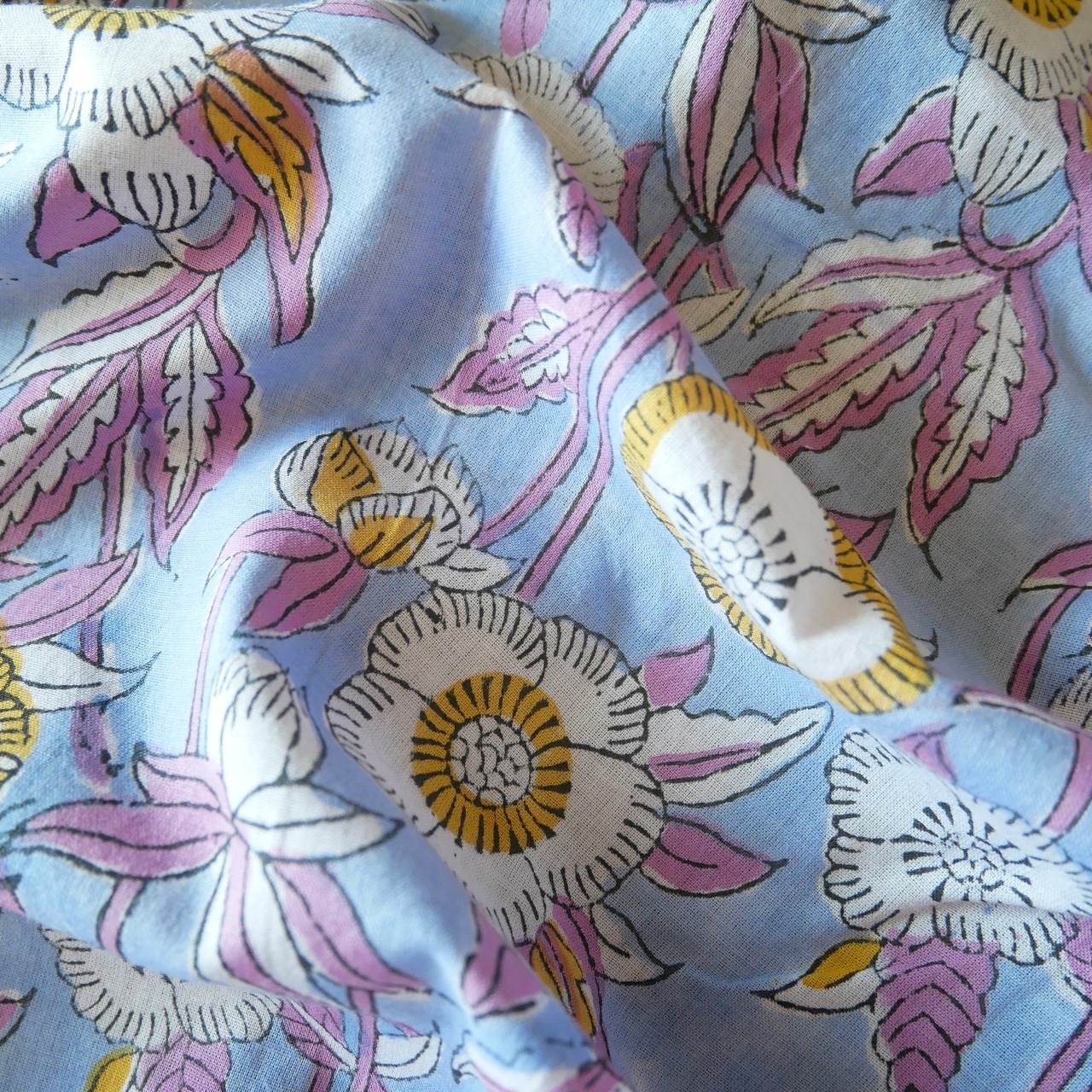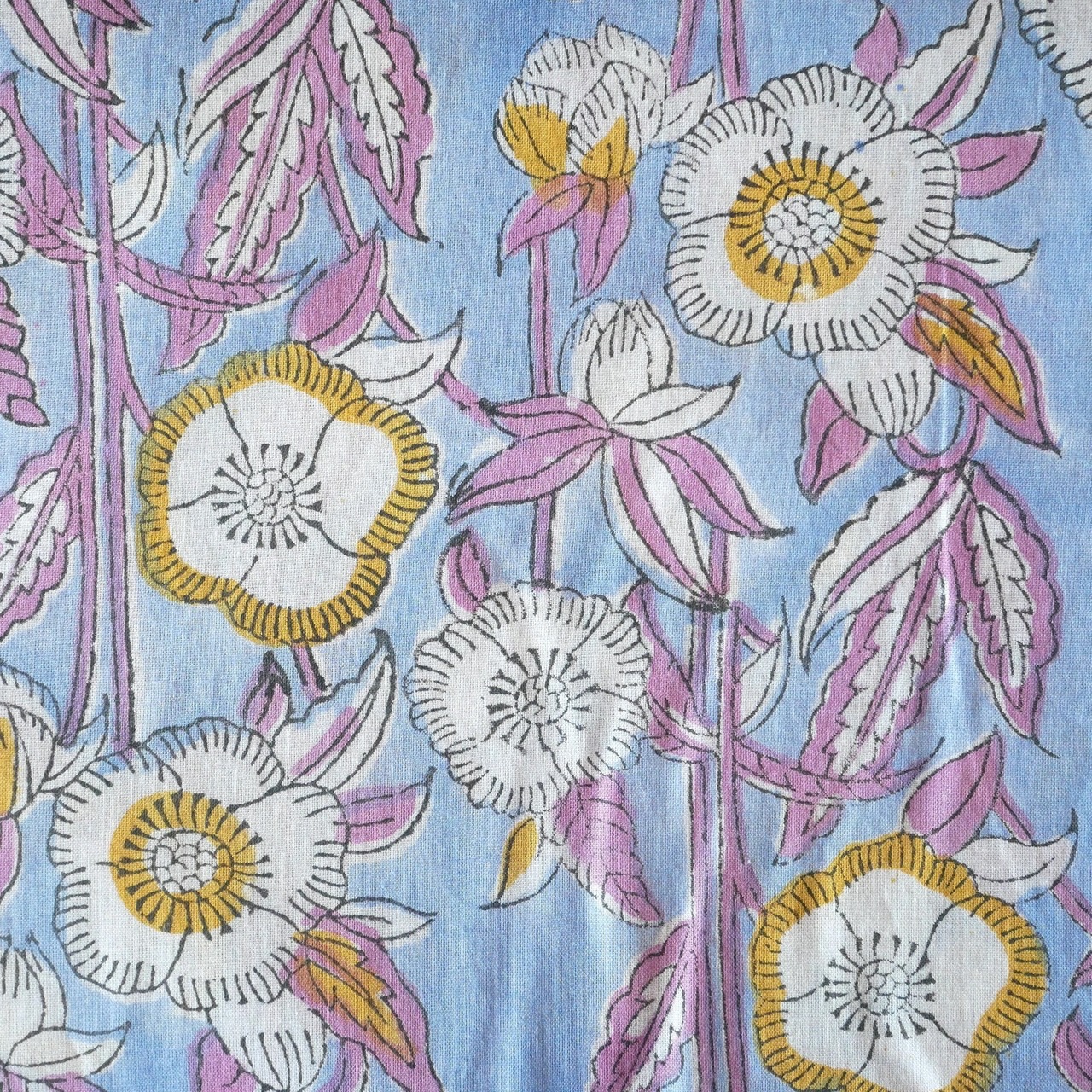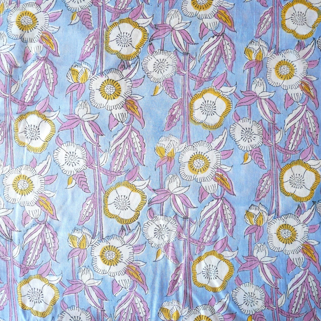 ハンドブロックプリント生地 インド更紗 綿生地 サックスブルー×紫とイエローの花模様 薄手コットン JE-250716