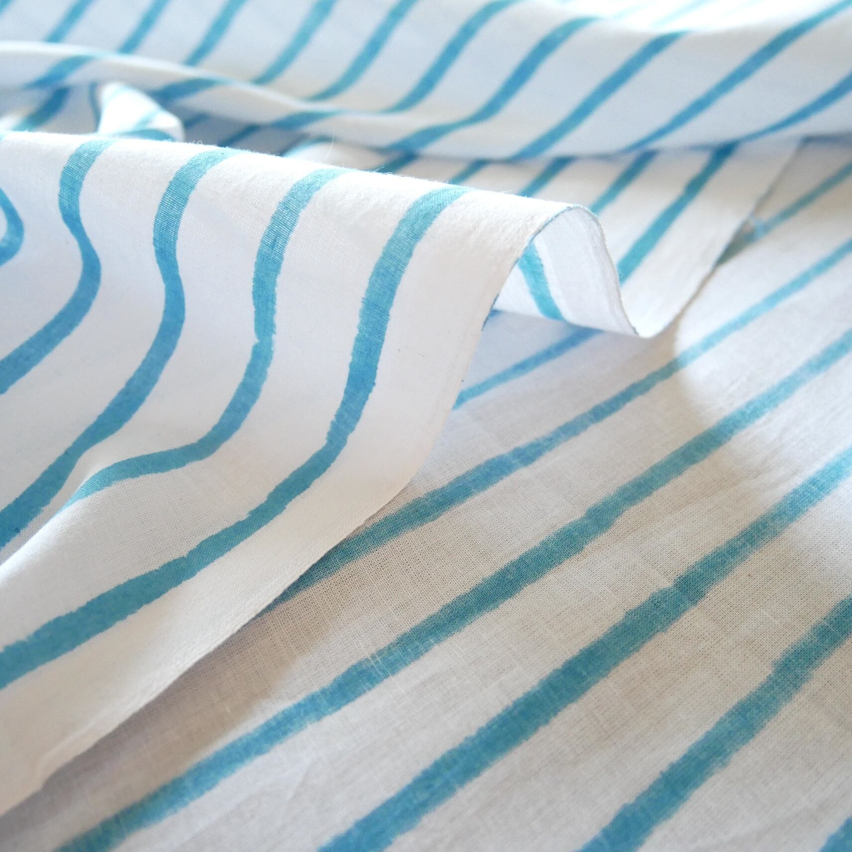 真っ白なコットンに、ターコイズブルーのストライプが軽やかに並ぶ、爽やかなブロックプリント生地が入荷しました!
