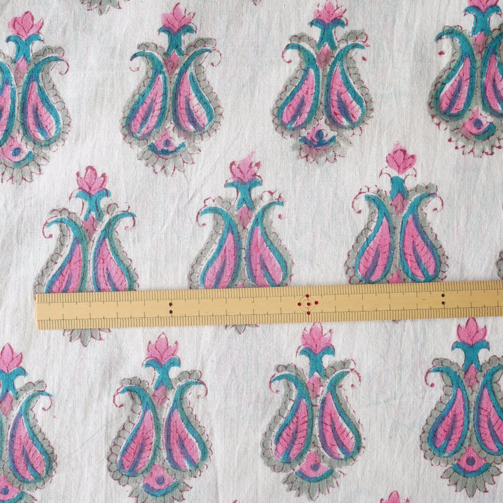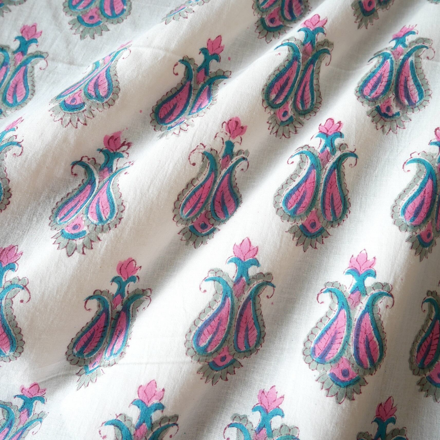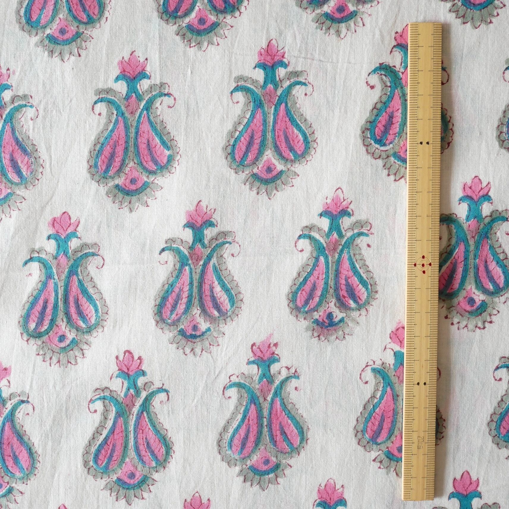 ハンドブロックプリント生地 インド更紗 綿生地 ホワイトベース×ピンク&ターコイズのペイズリーフラワー柄 薄手コットン GP-250727
