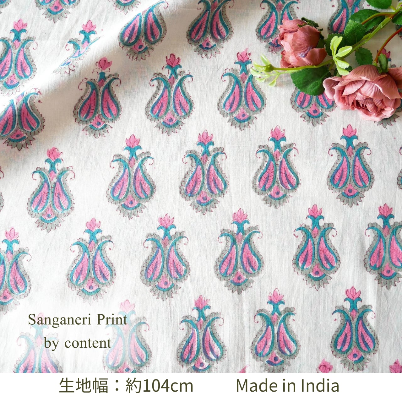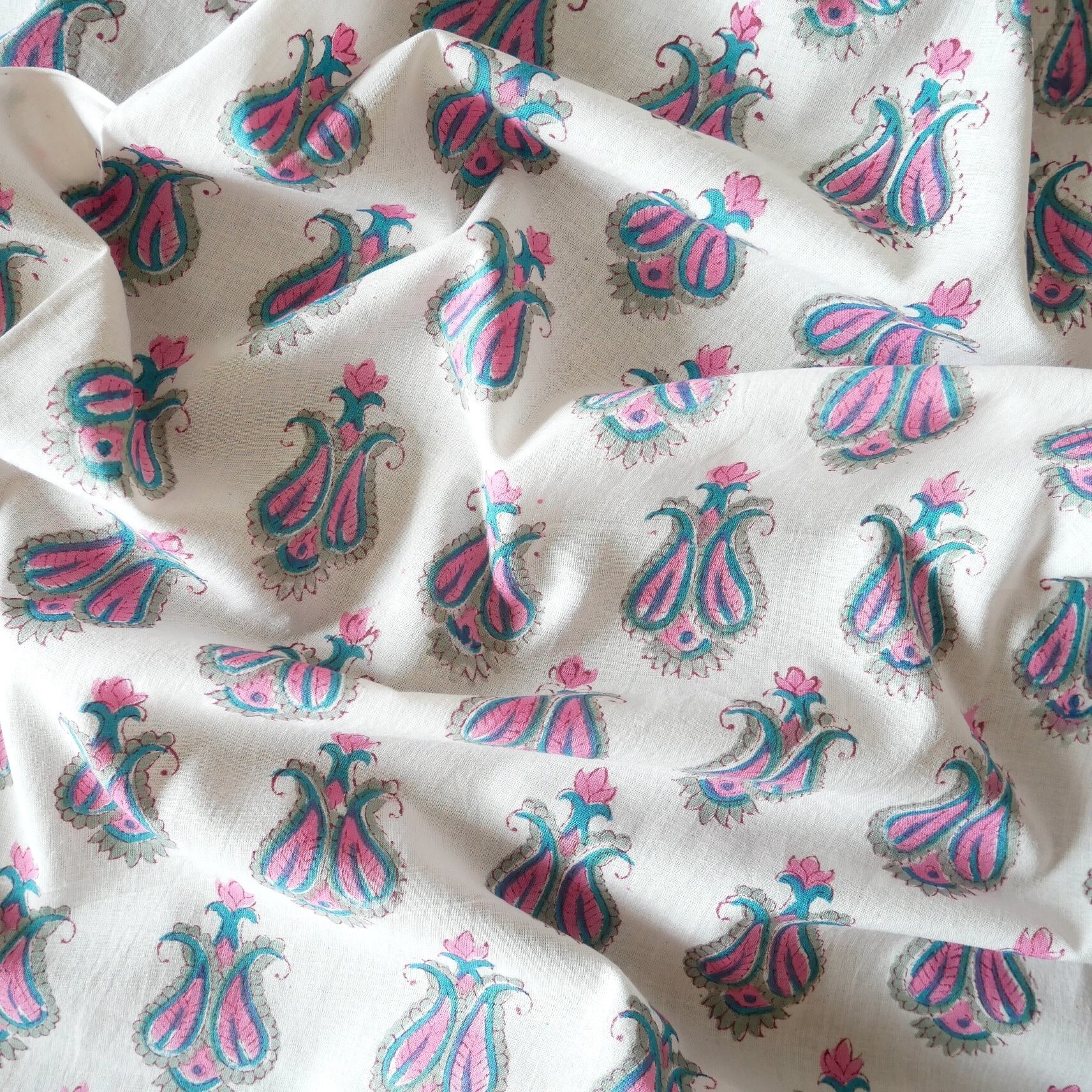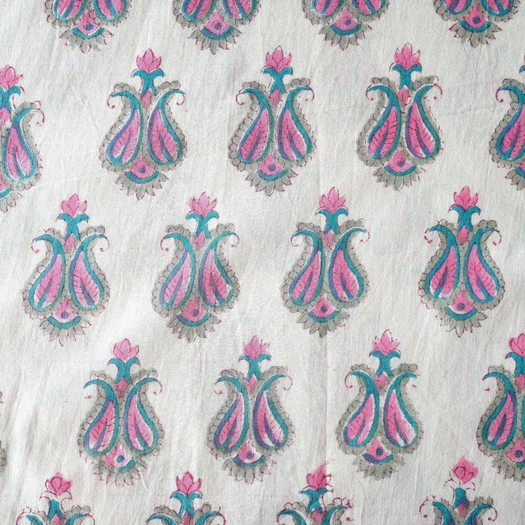 ハンドブロックプリント生地 インド更紗 綿生地 ホワイトベース×ピンク&ターコイズのペイズリーフラワー柄 薄手コットン GP-250727