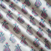ホワイトベースに、鮮やかなピンクとターコイズブルーで描かれたモチーフが並ぶブロックプリント生地が入荷しました!