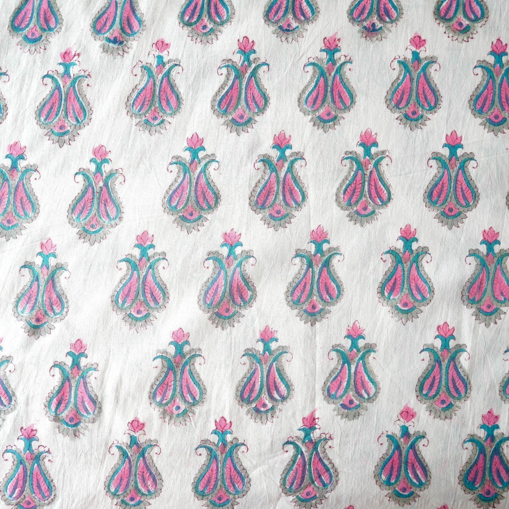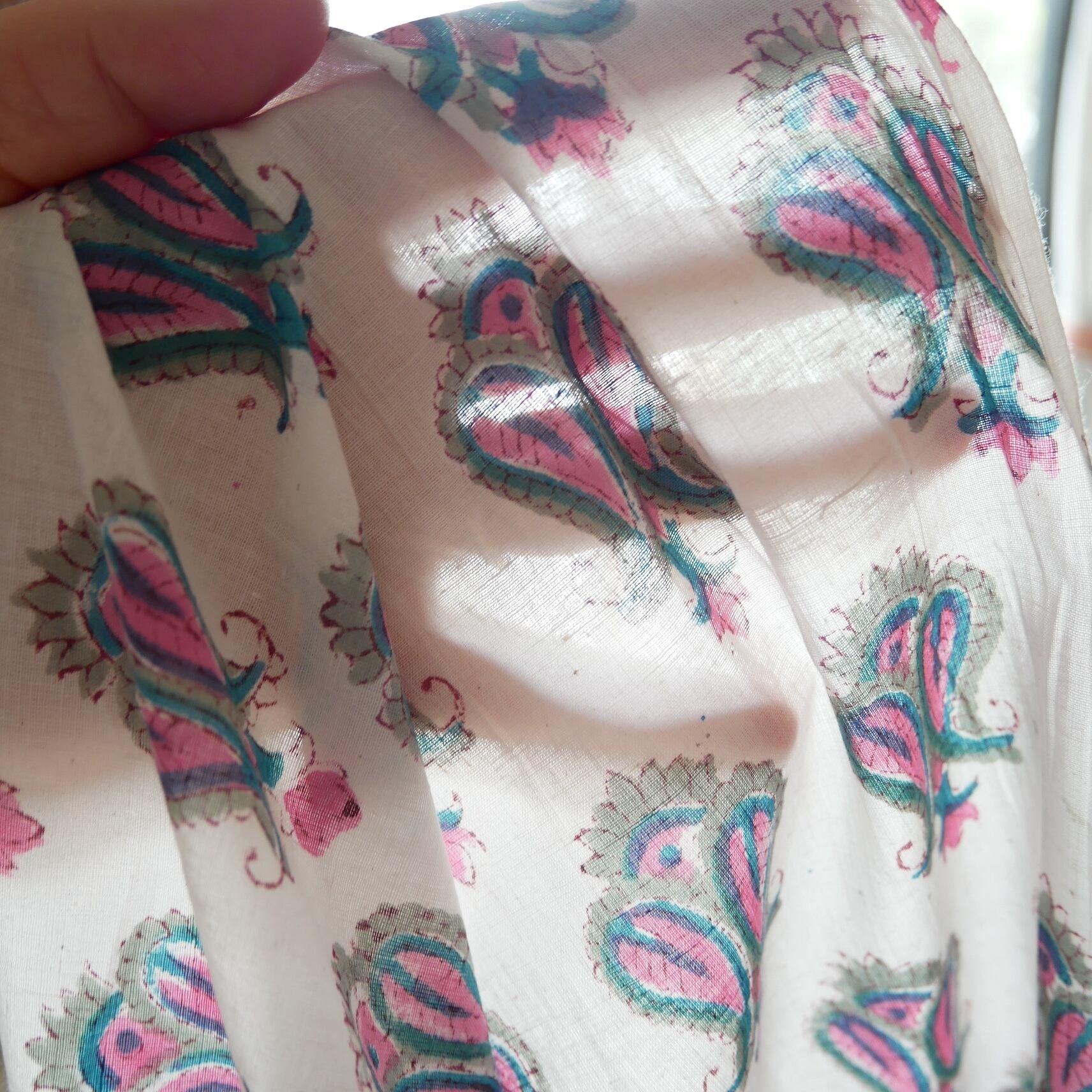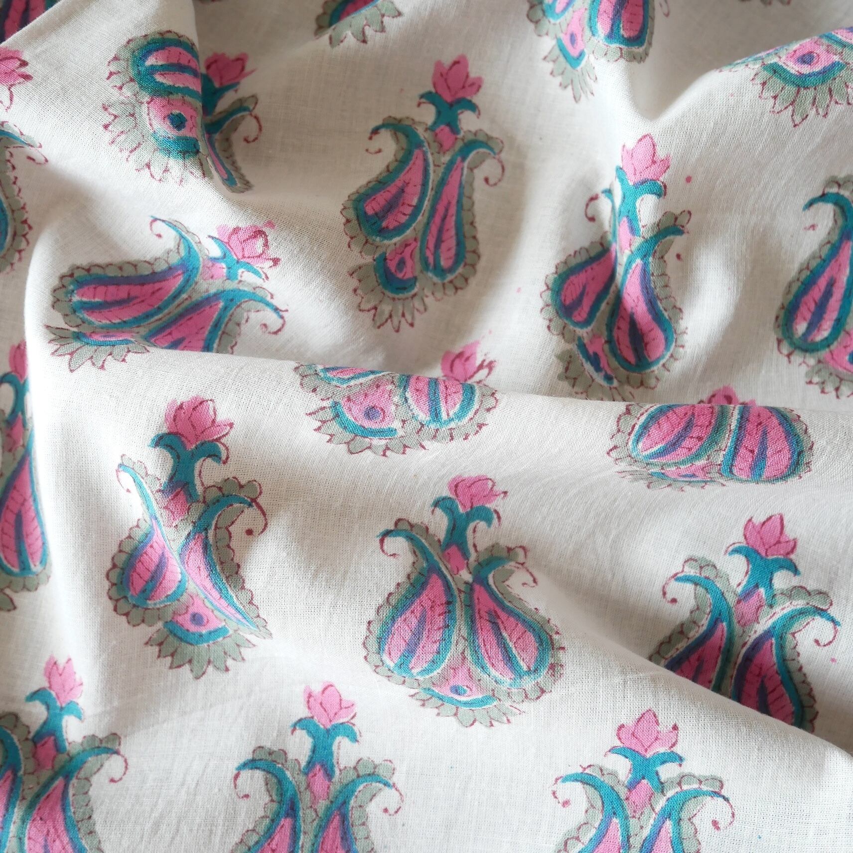 ◾️ピンクとターコイズが織りなす愛らしさ。ペイズリーフラワー柄のブロックプリント生地