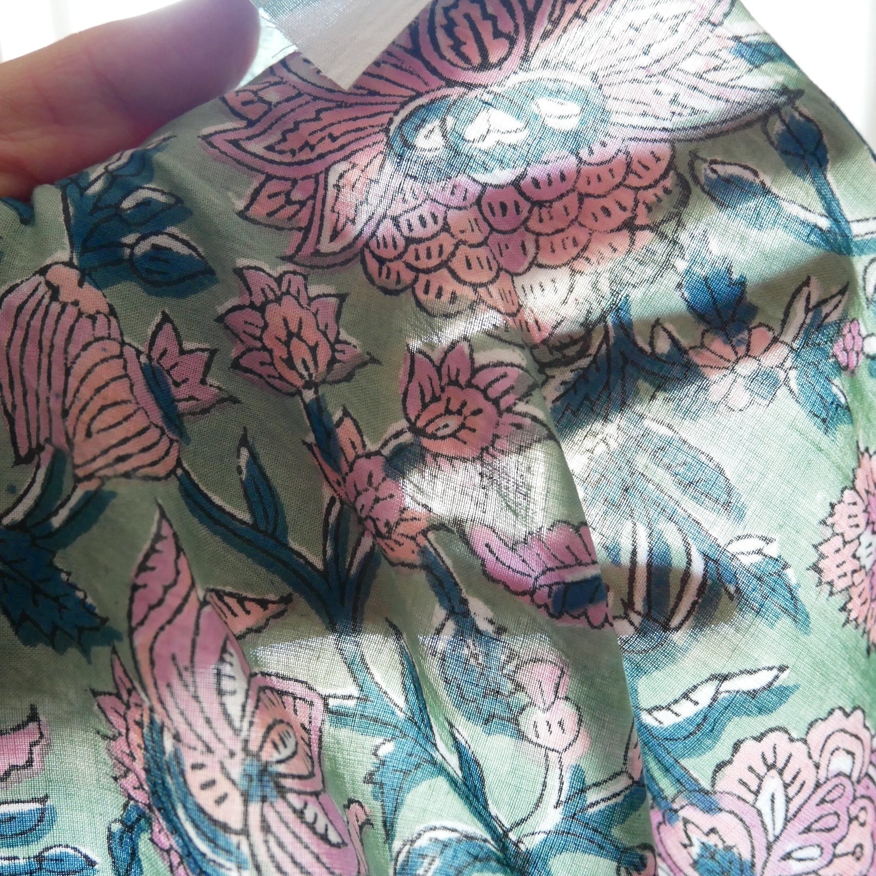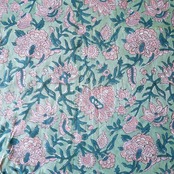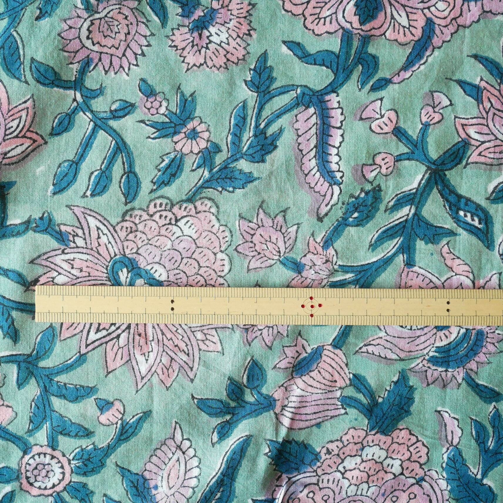 ハンドブロックプリント生地 インド更紗 綿生地 グレイッシュグリーンベース×ピンクフラワー 薄手コットン LT-250640