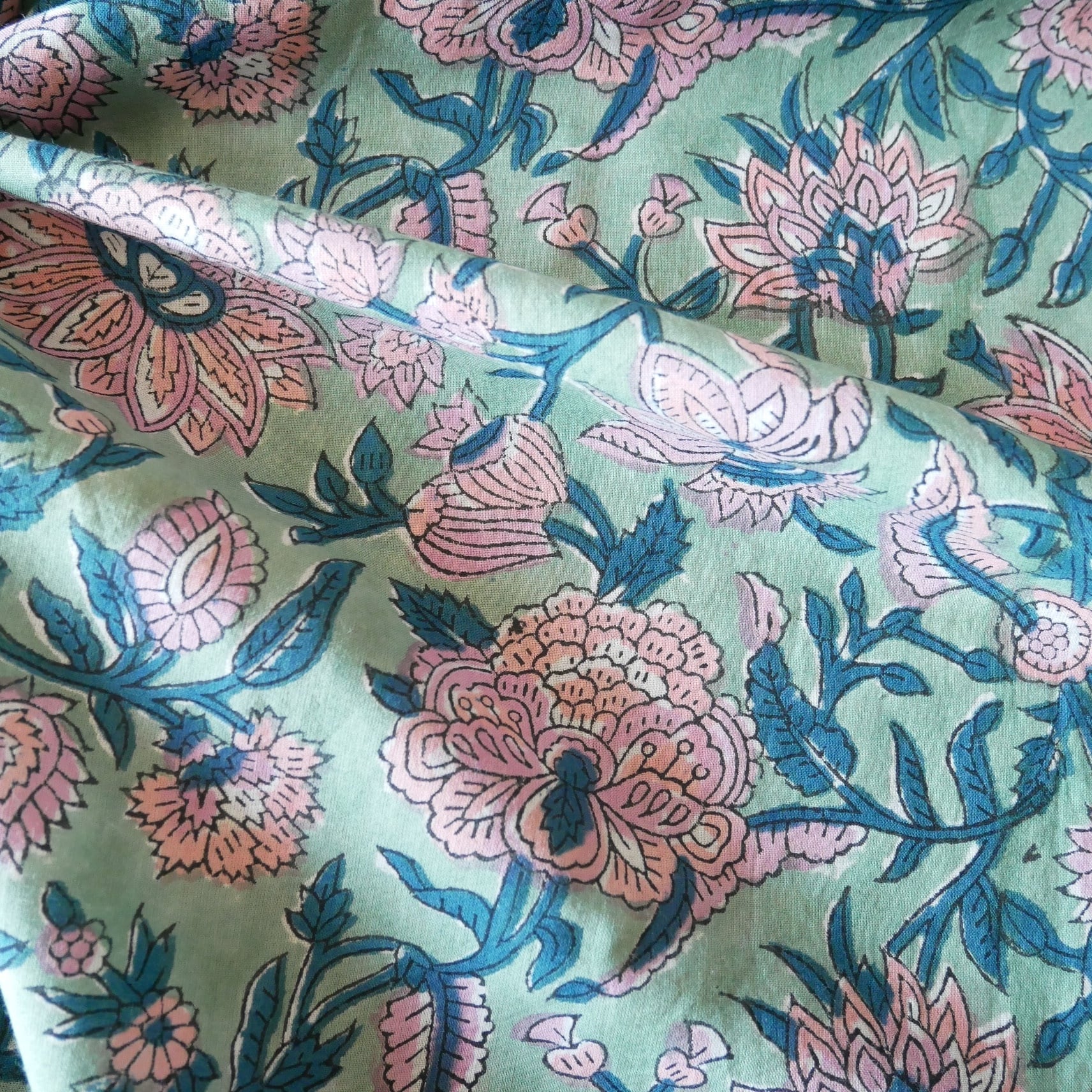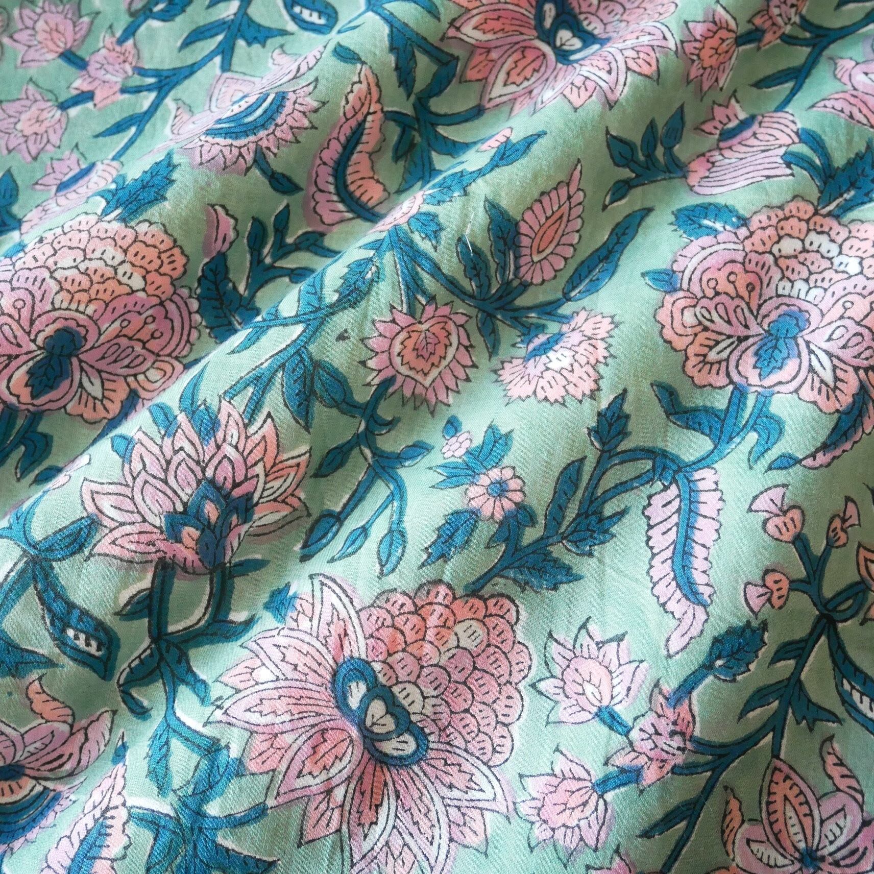 落ち着いたグレイッシュグリーンのベースに、2色のピンクで描かれた花々が咲き誇るブロックプリント生地です。