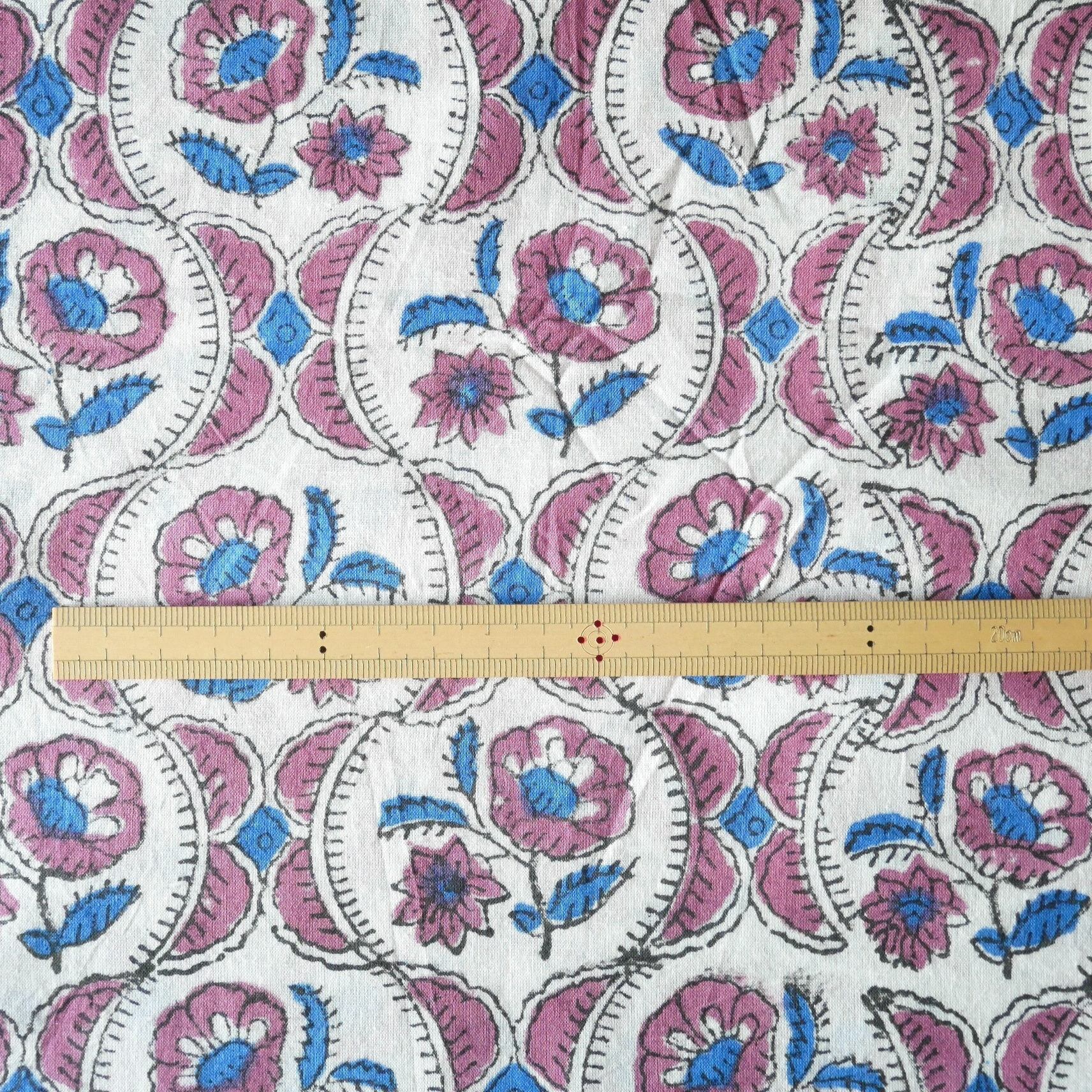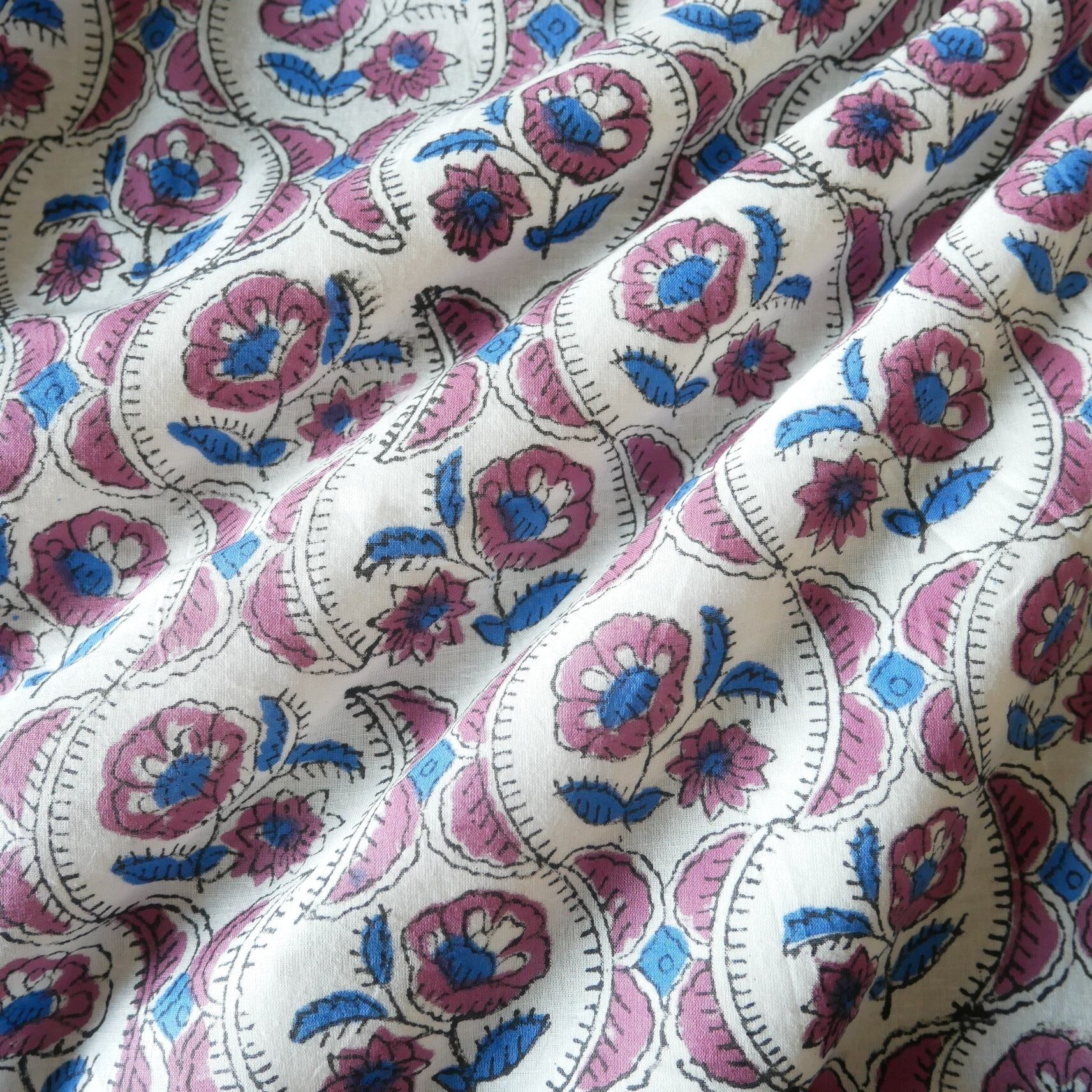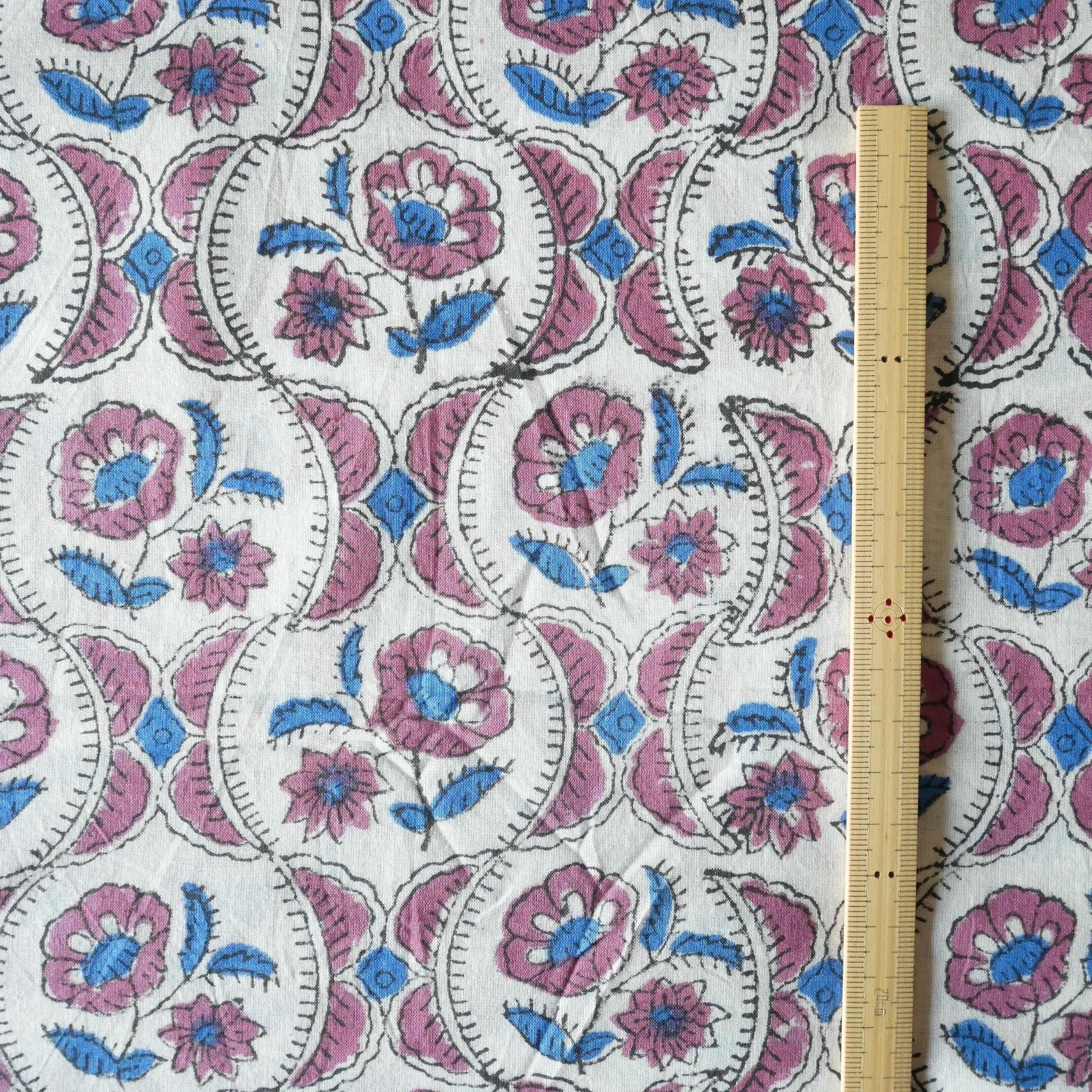 ラスト17点(約1.7m) ハンドブロックプリント生地 インド更紗 綿生地 ナチュラルホワイトベース×アンティークレッド&ブルー 花模様 薄手コットン GP-250728