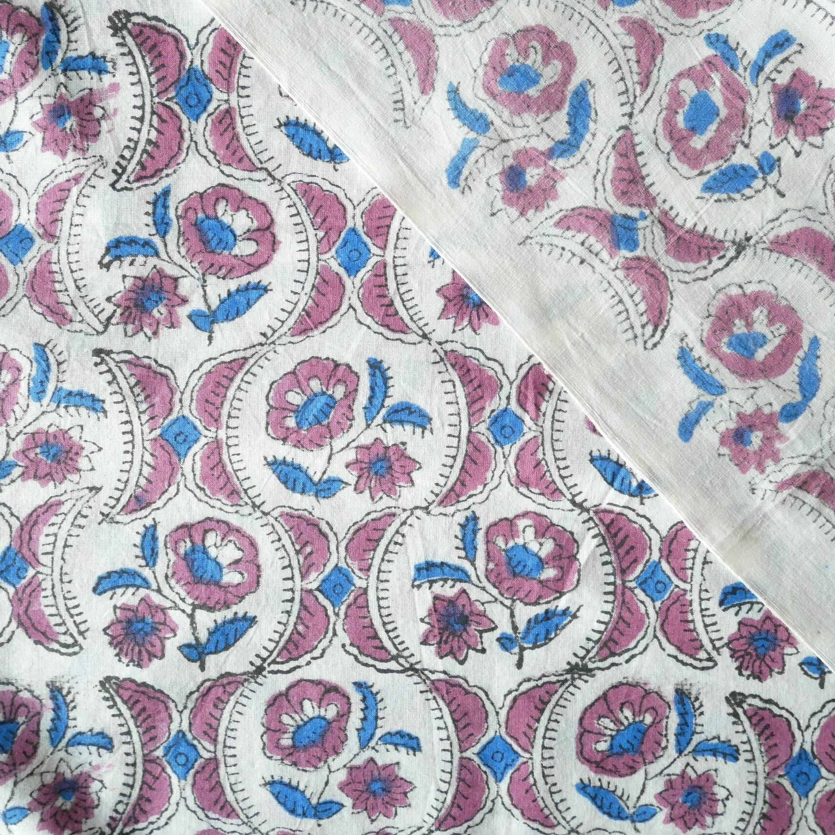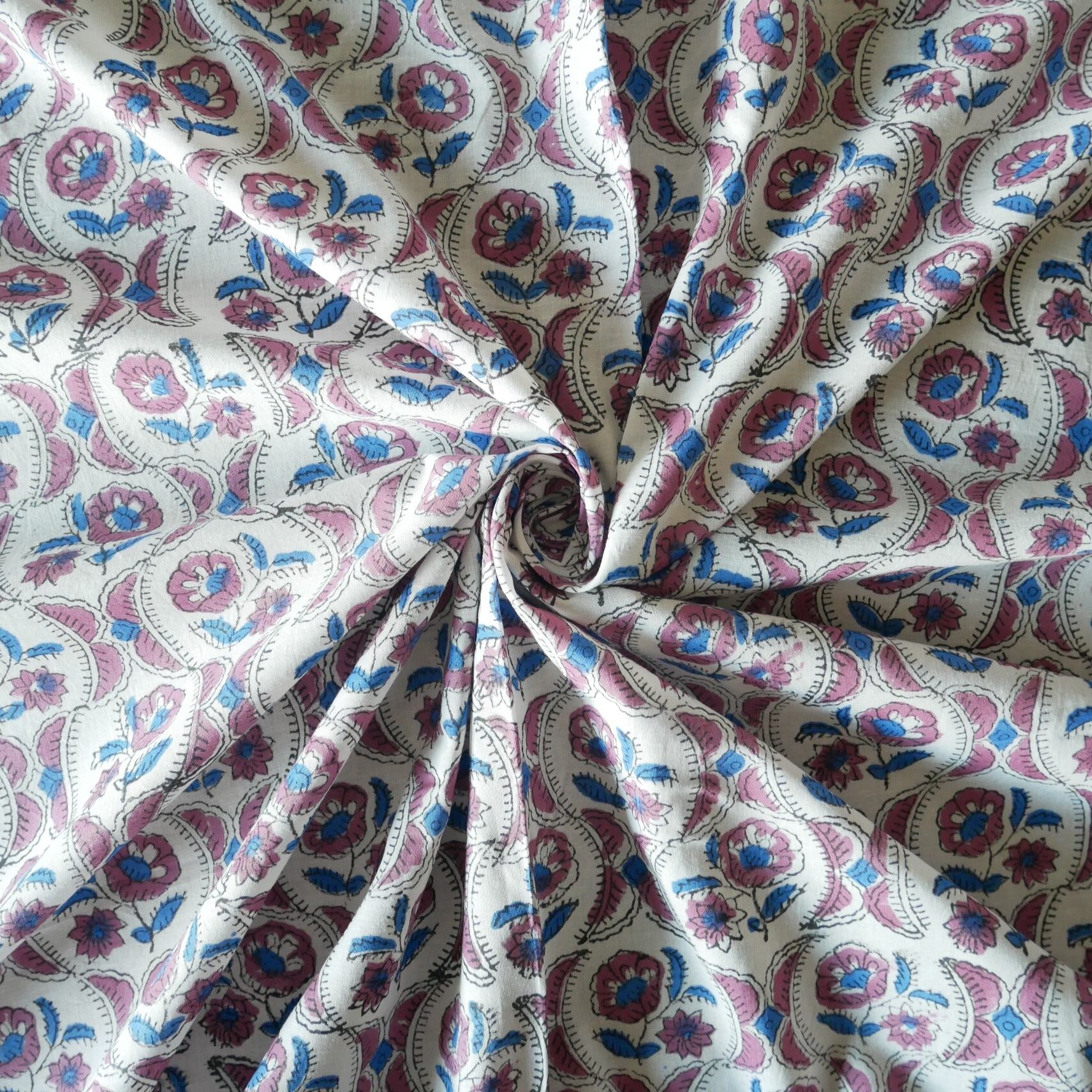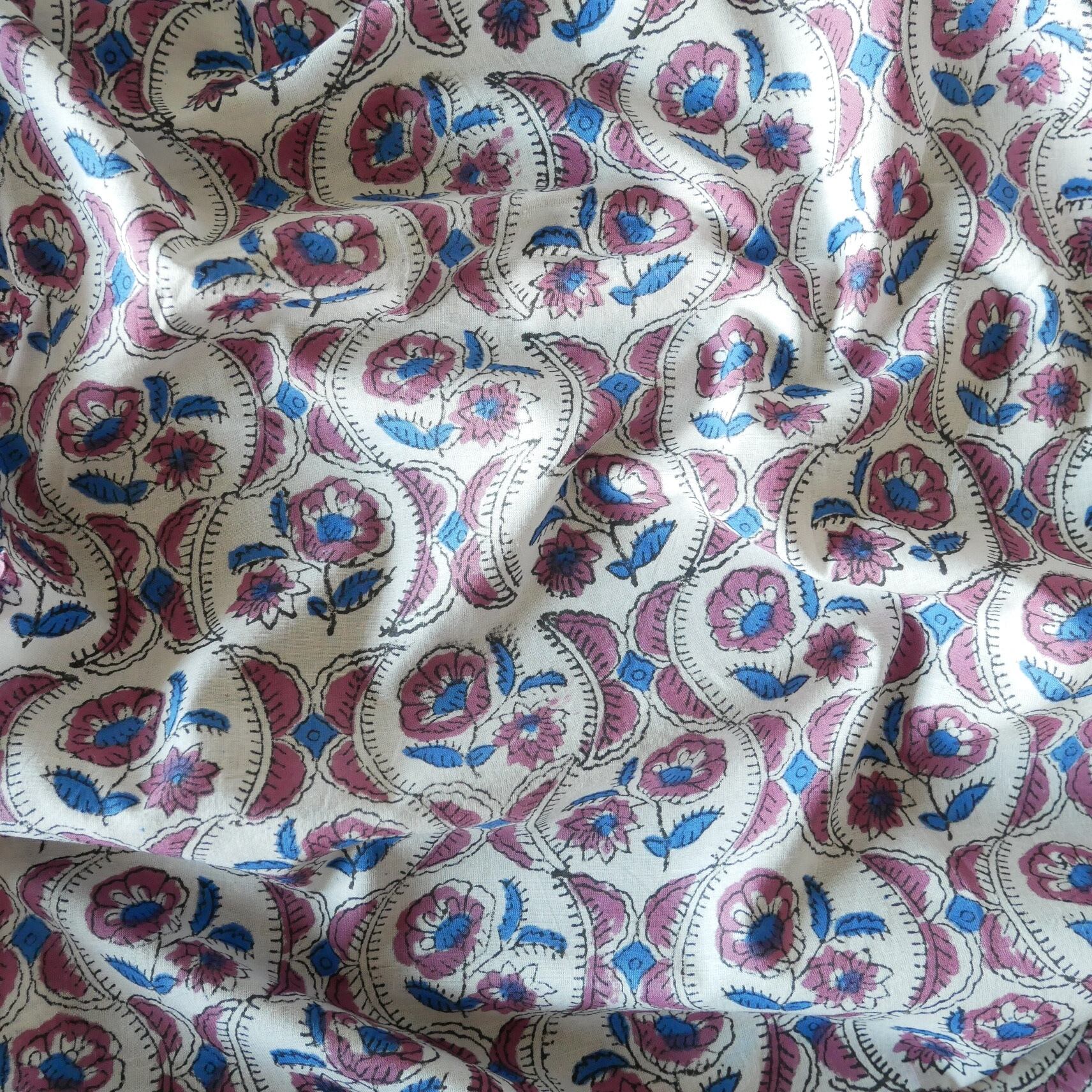 ラスト17点(約1.7m) ハンドブロックプリント生地 インド更紗 綿生地 ナチュラルホワイトベース×アンティークレッド&ブルー 花模様 薄手コットン GP-250728