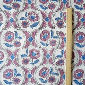 ナチュラルホワイトのベースに、アンティークレッドとブルーで描かれた花模様が並ぶレトロな雰囲気のブロックプリント生地です。