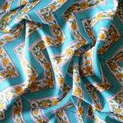 明るいターコイズブルーをベースに、ジグザグ模様の中に可愛らしい花々がリズミカルに並んだブロックプリント生地です。