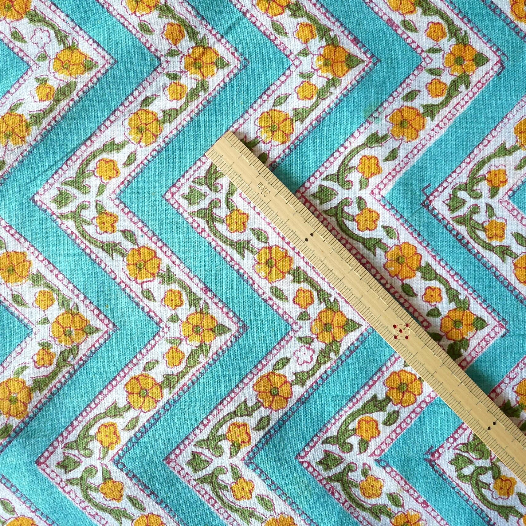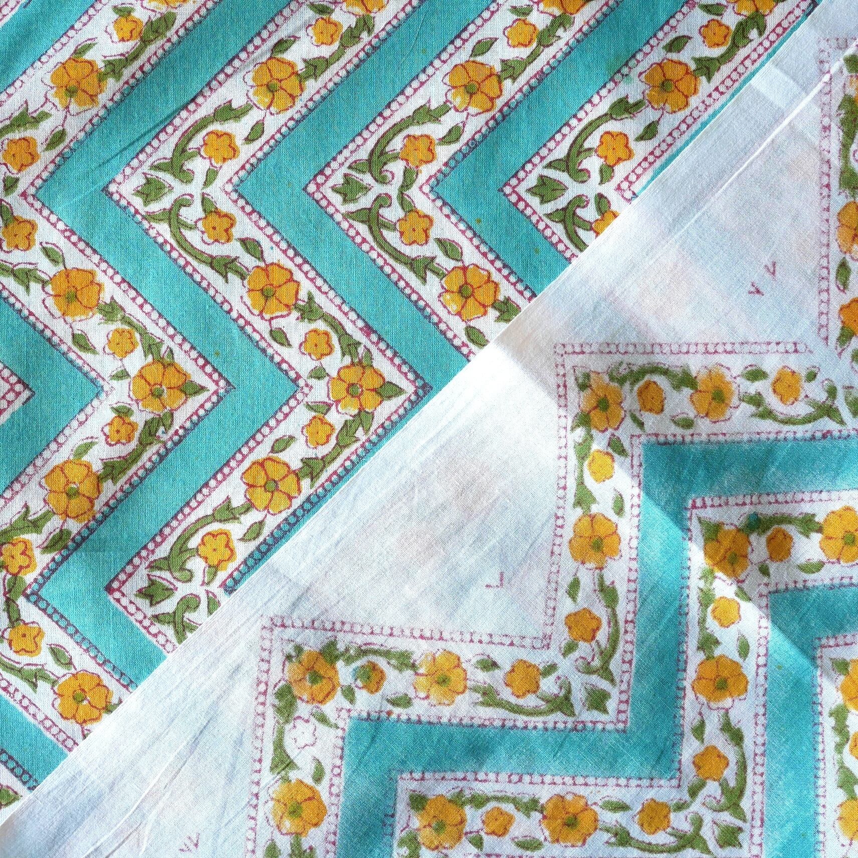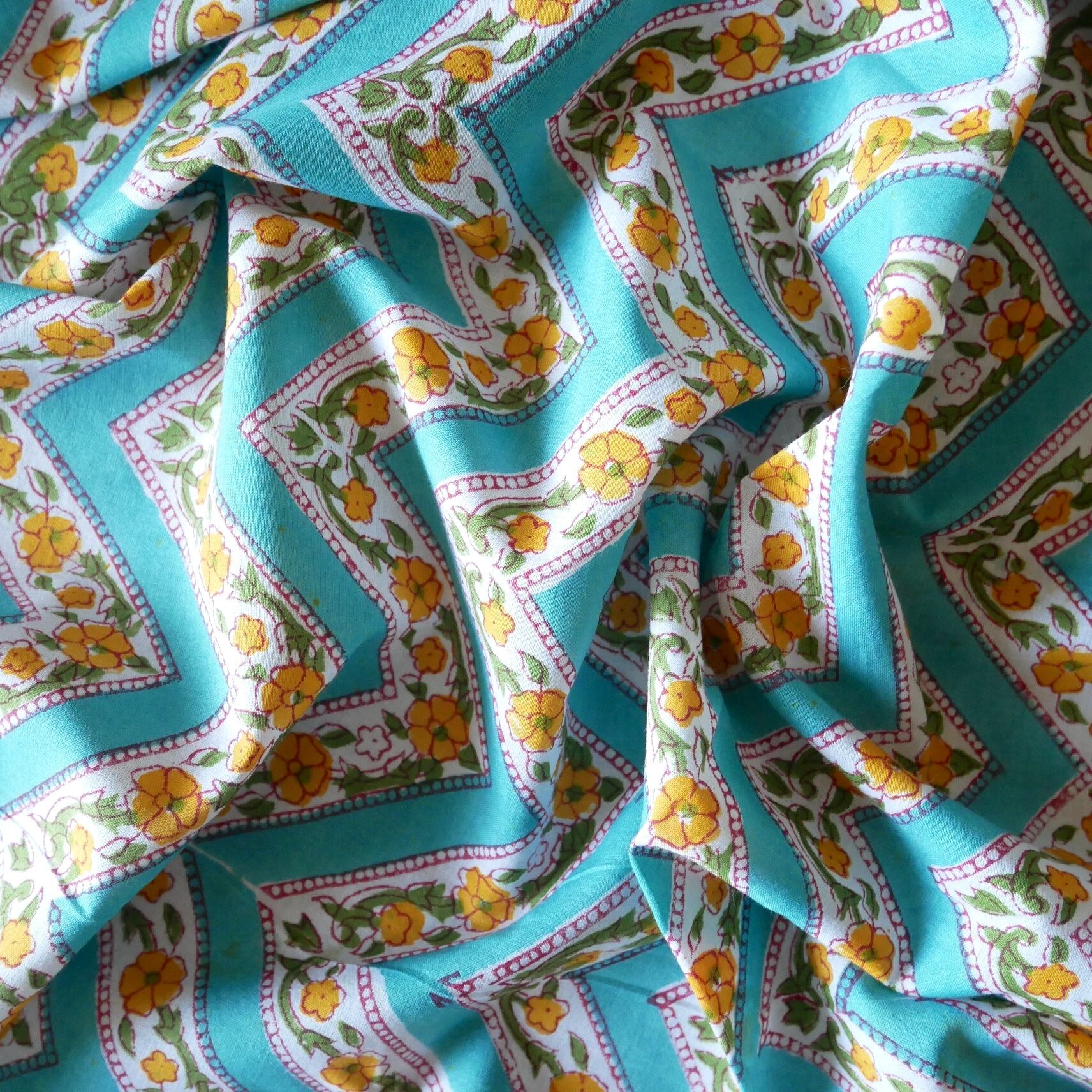 ◾️ターコイズブルーに映えるジグザグライン。可憐な花模様が軽やかに踊るブロックプリント生地