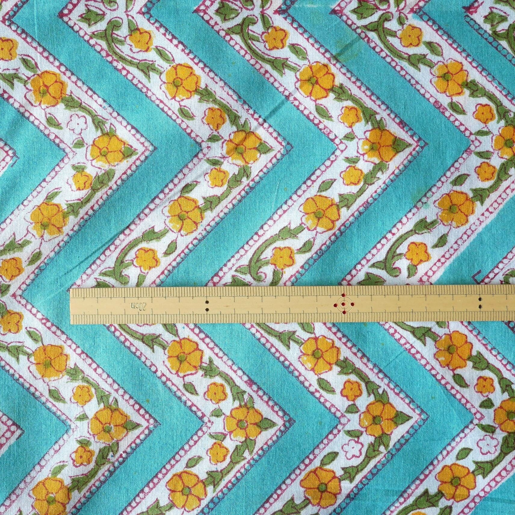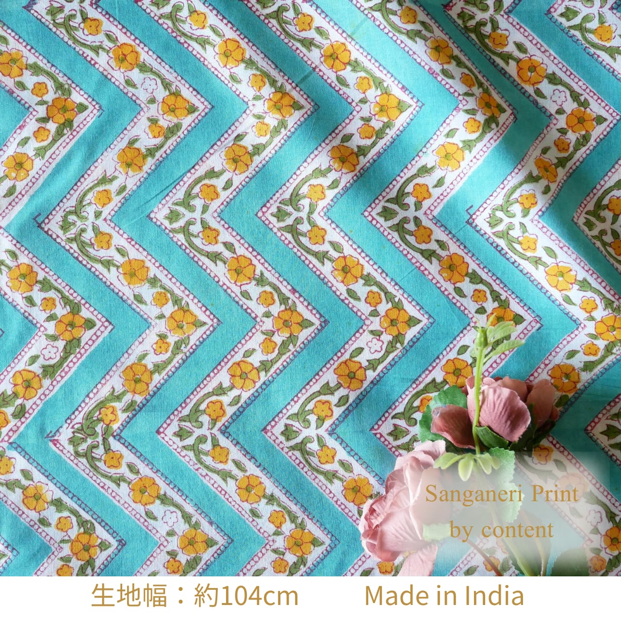 ハンドブロックプリント生地 インド更紗 綿生地 ターコイズブルーベース×ジグザグ模様と花柄 薄手コットン LT-250844
