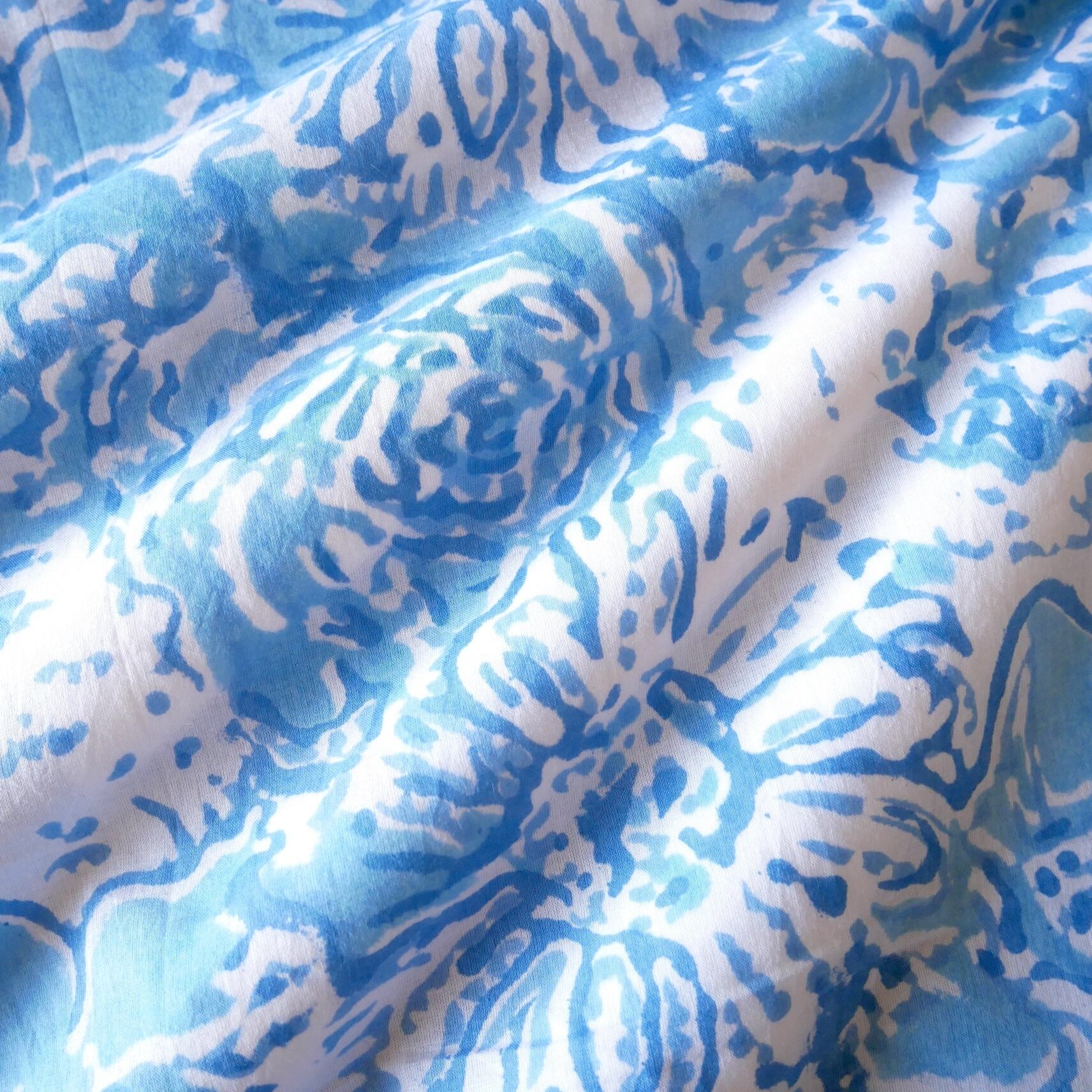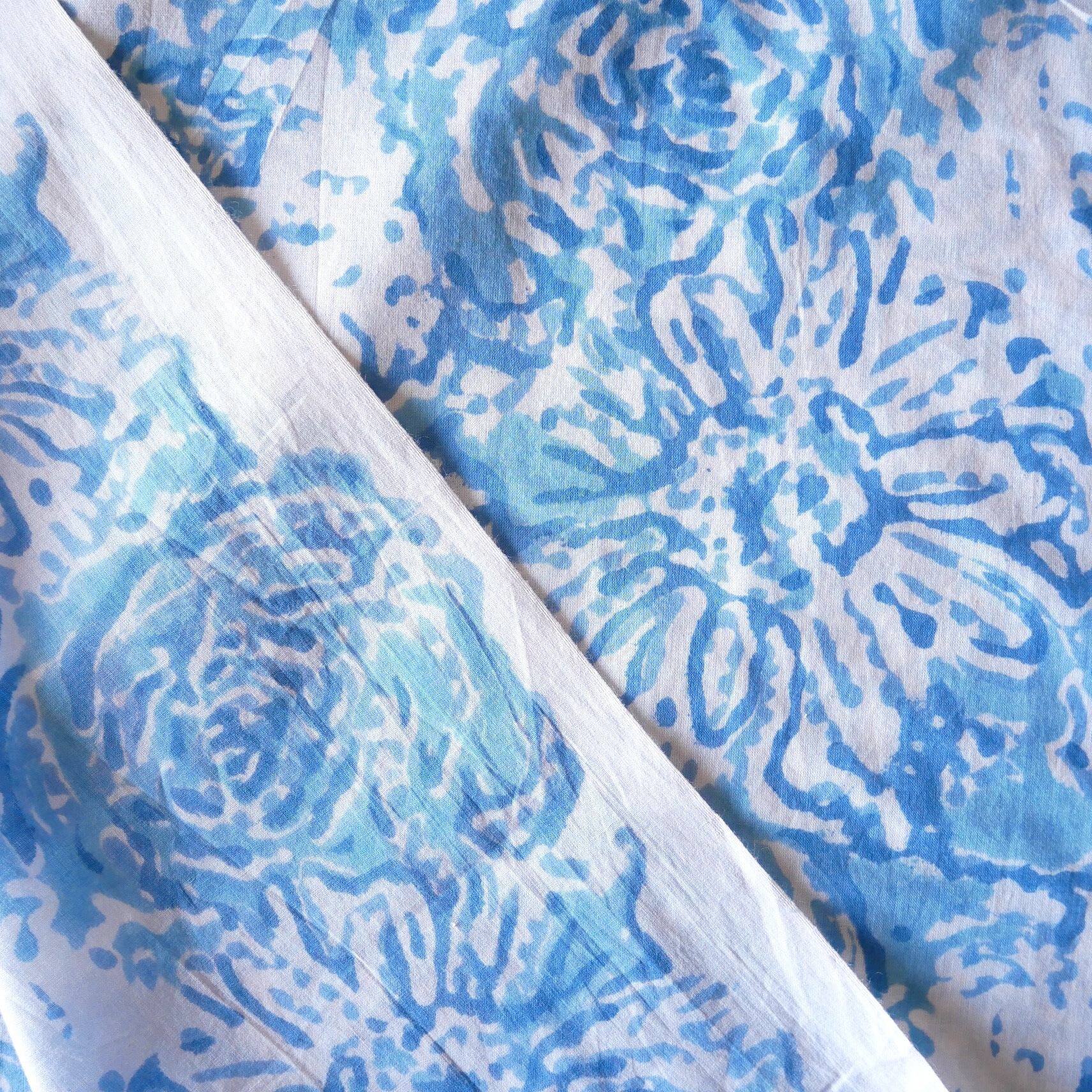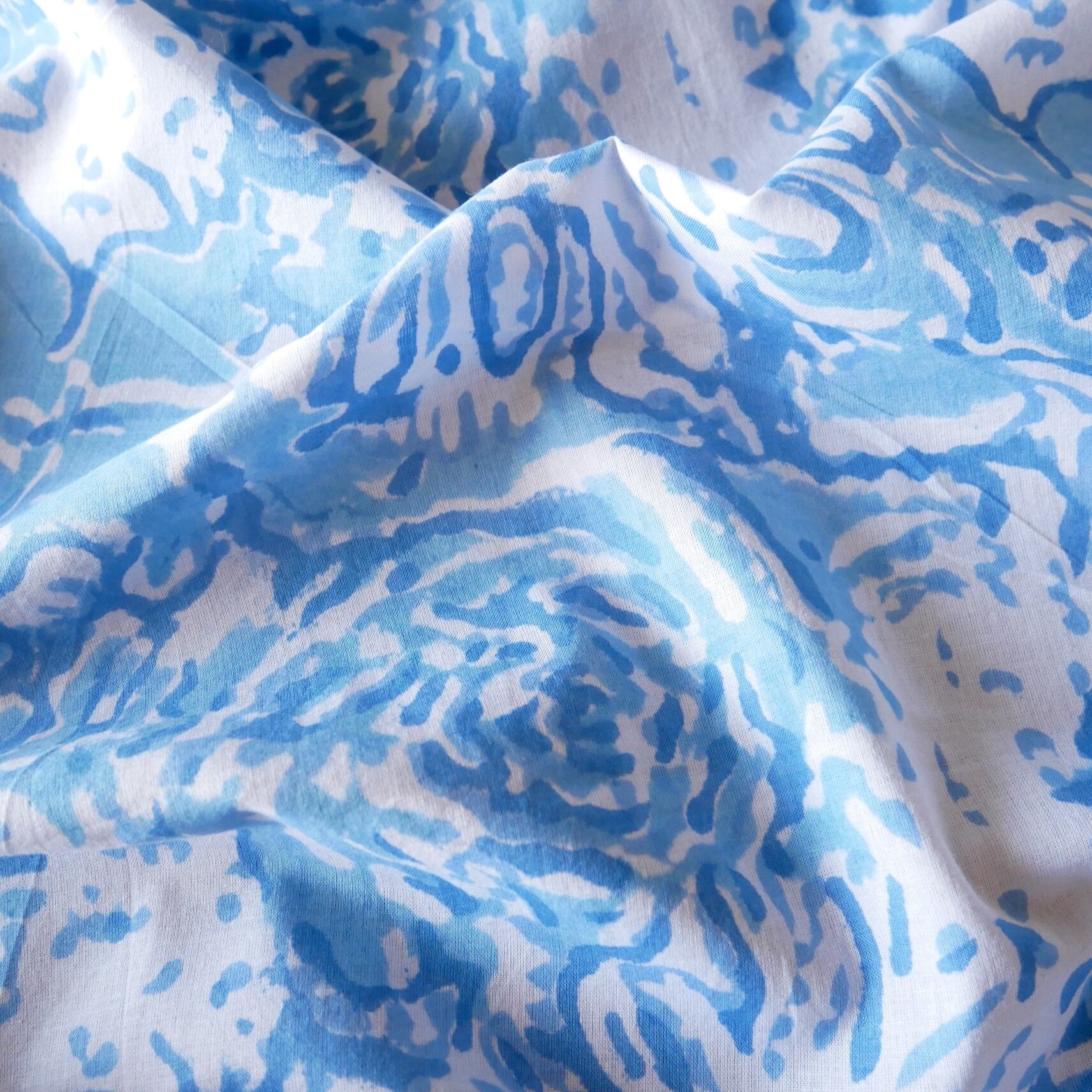 ◾️ブルーの濃淡が描くマーブル調の花々。爽やかに纏うブロックプリント生地
