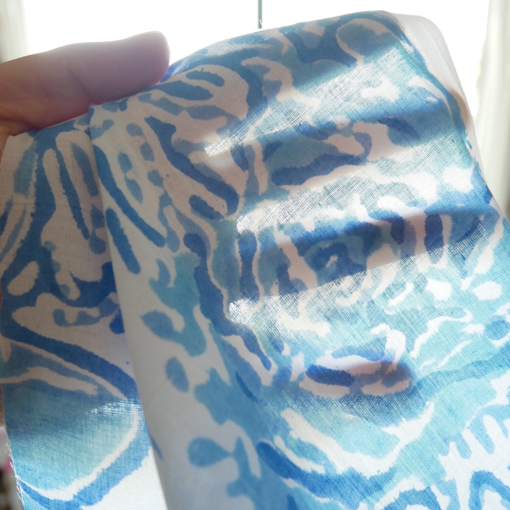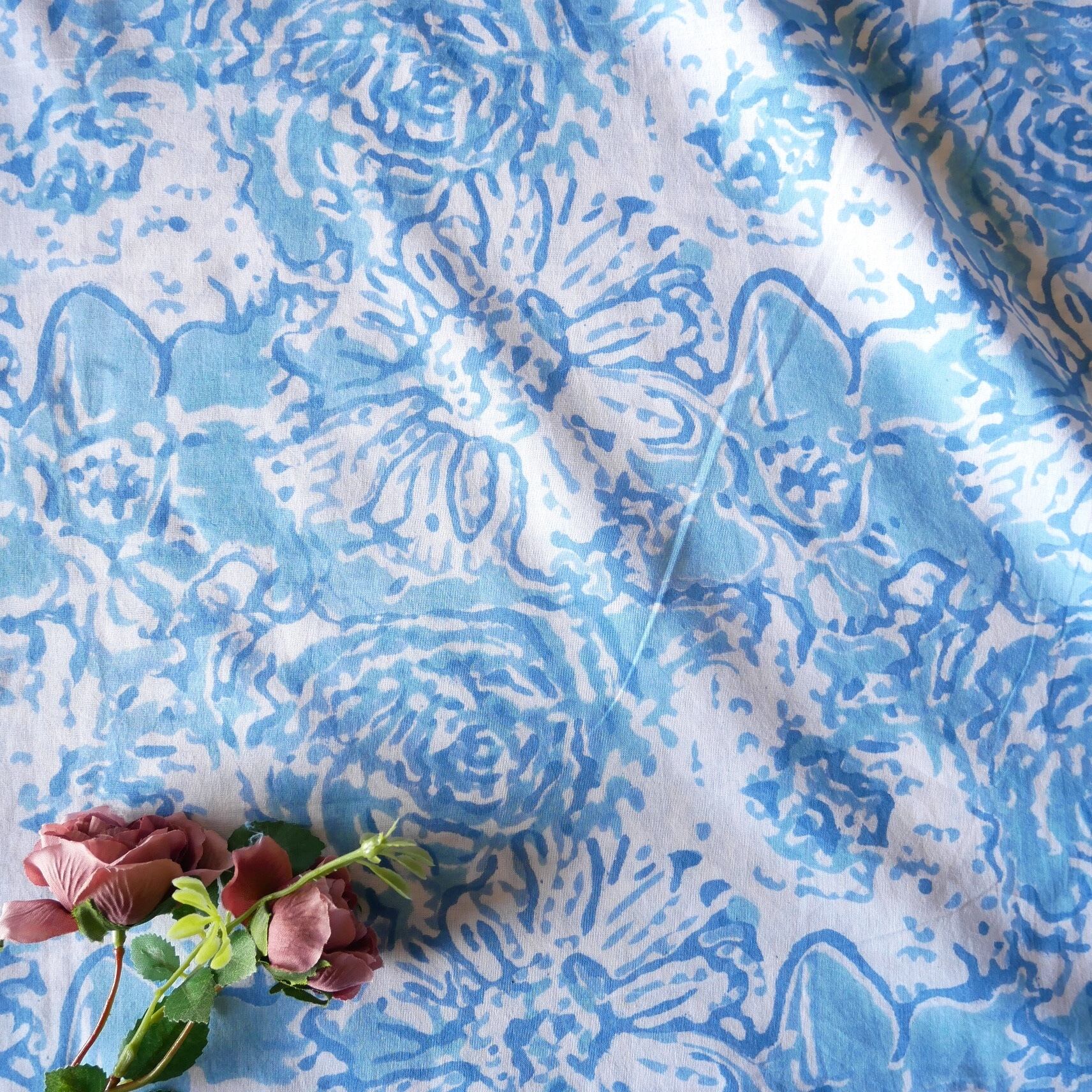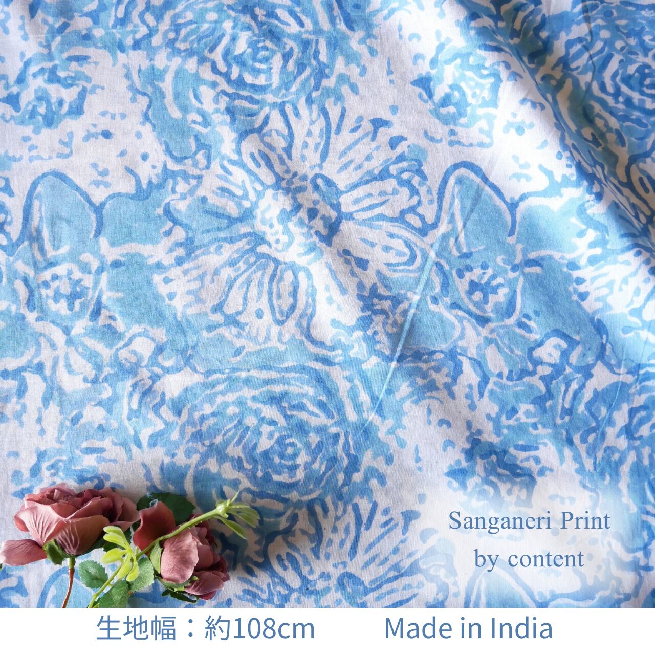 清涼感のあるホワイトベースに、大きめの花がブルーの濃淡で描かれたブロックプリント生地です。