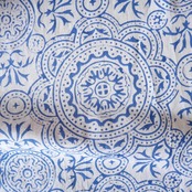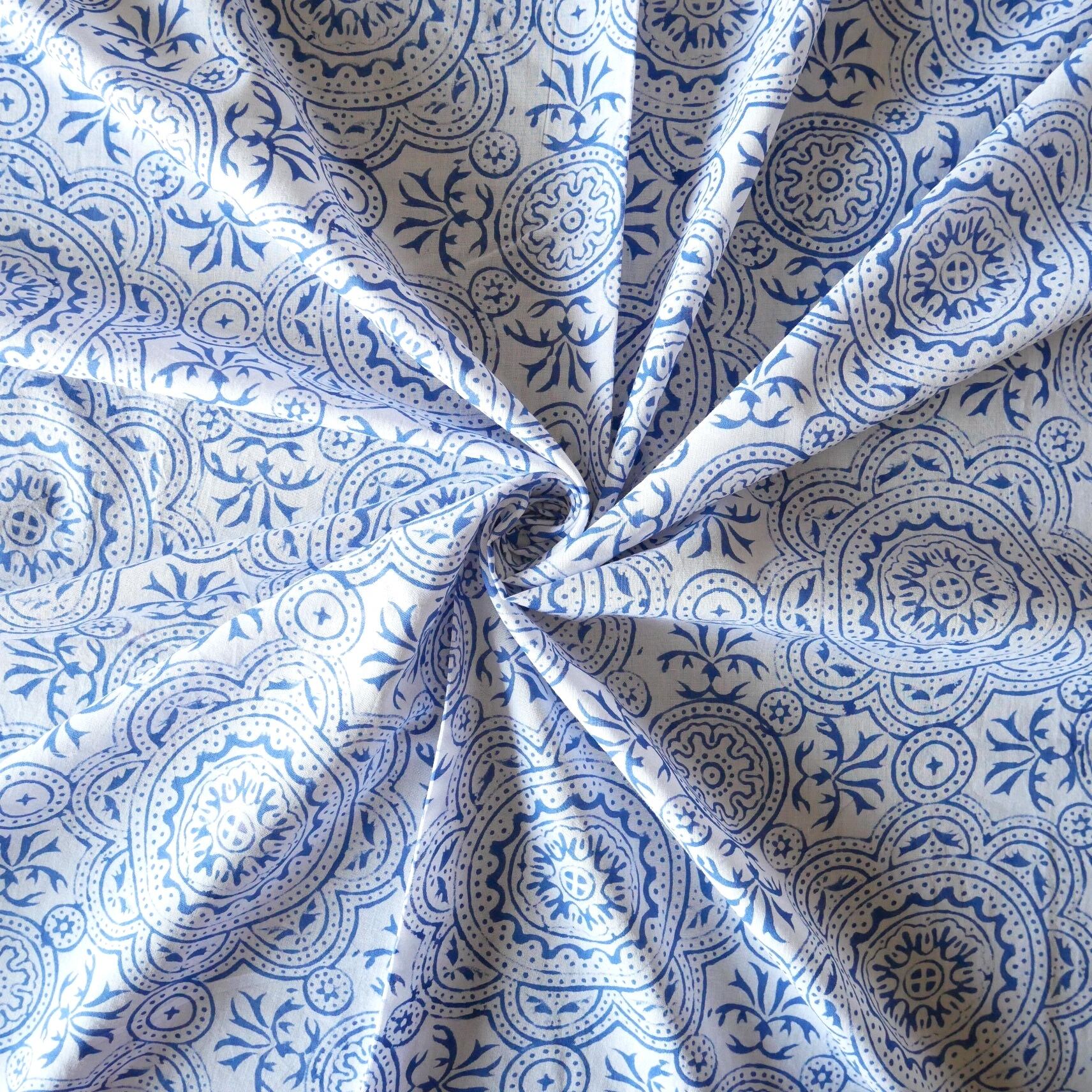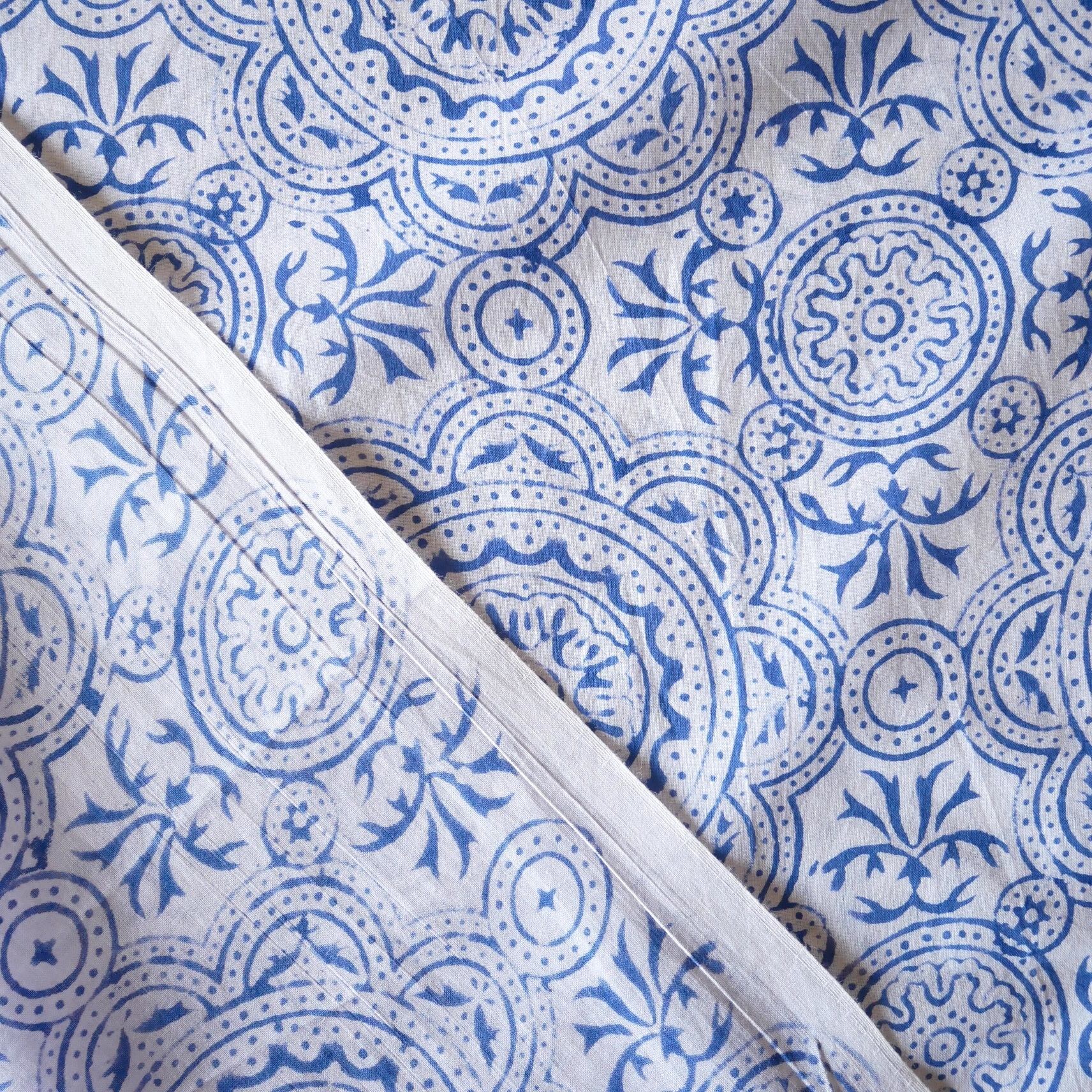 ハンドブロックプリント生地 インド更紗 綿生地 ホワイトベース×ブルーの花モチーフ幾何学模様 薄手コットン LT-250846