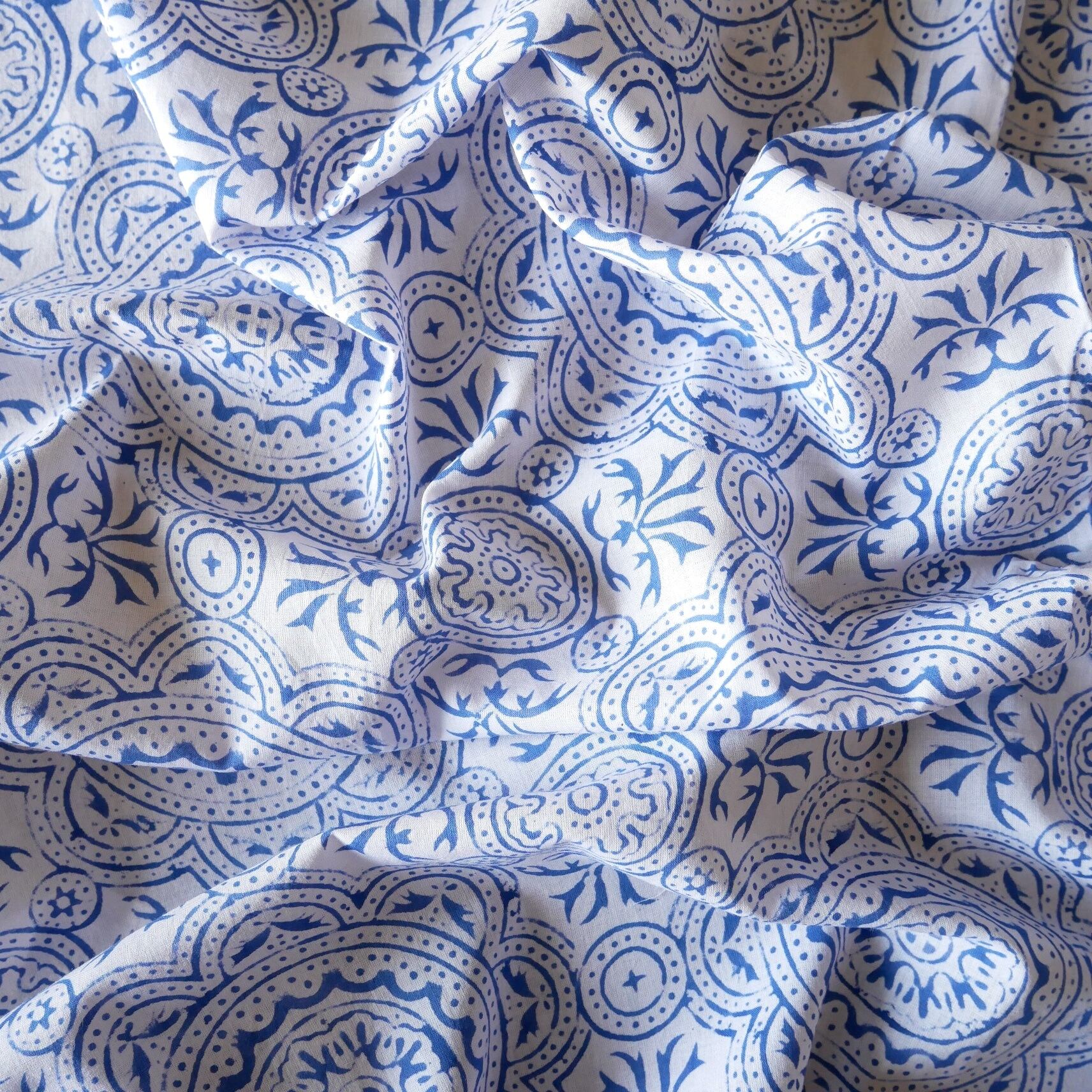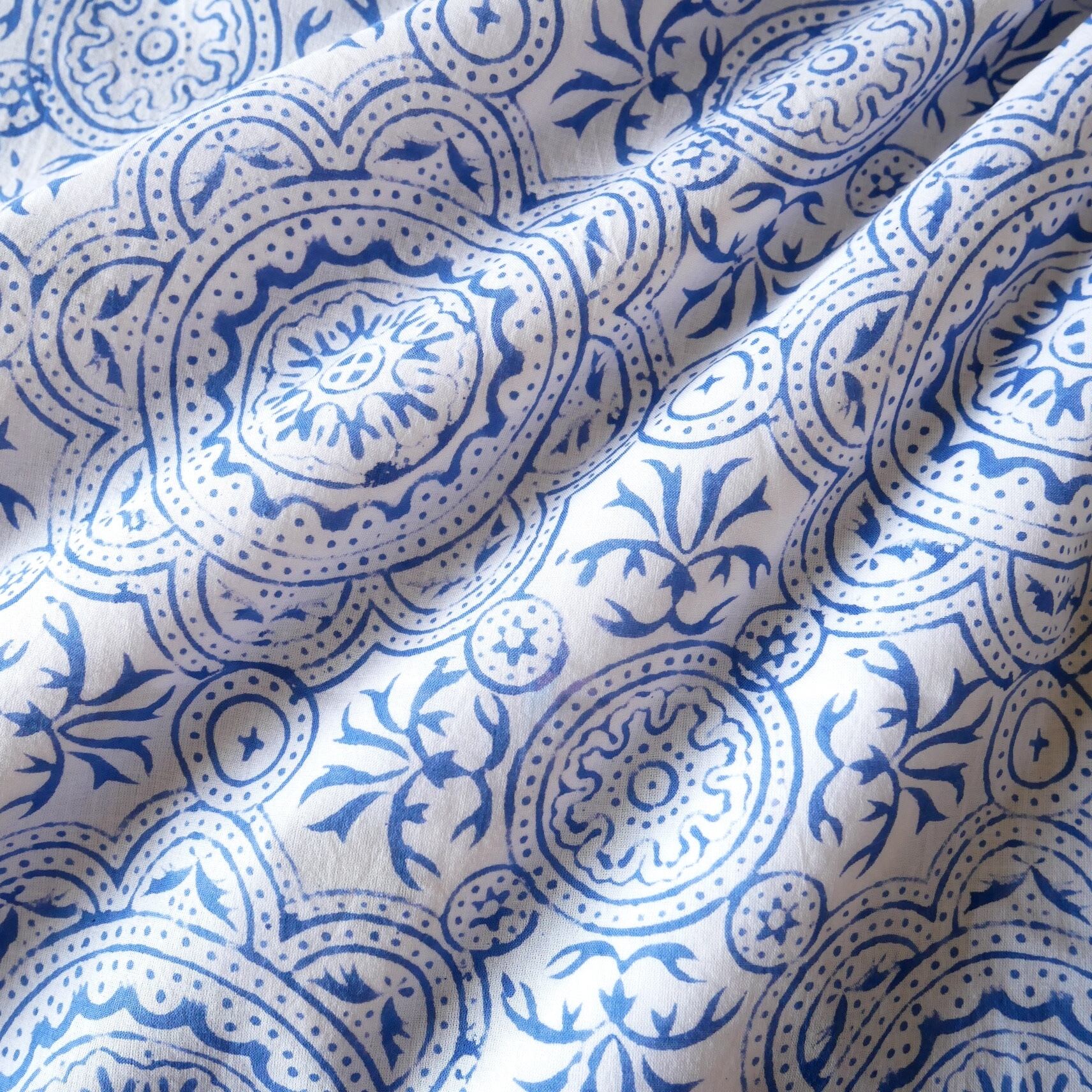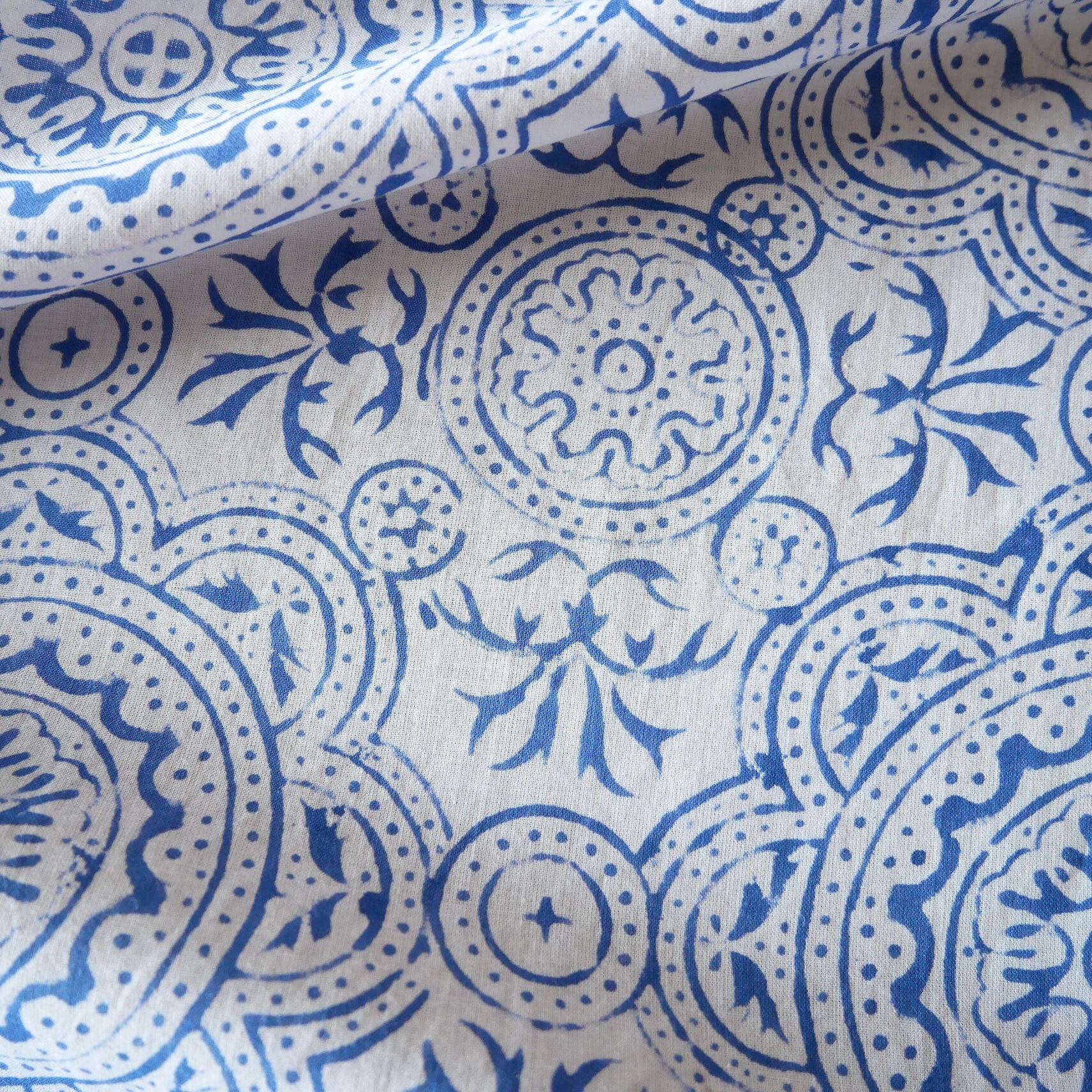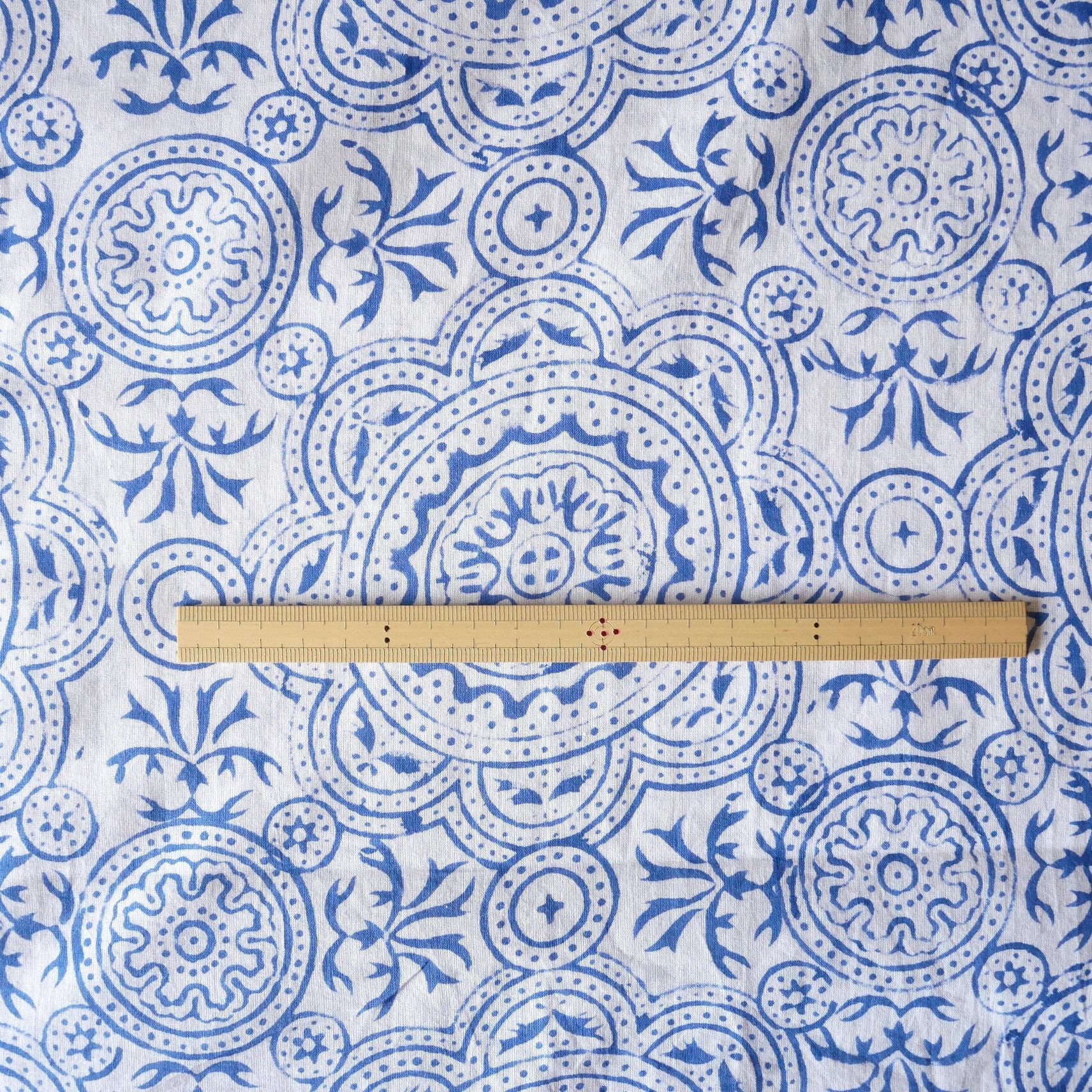 ホワイトのベースに、涼やかなブルーで描かれたモチーフが並ぶブロックプリント生地です。