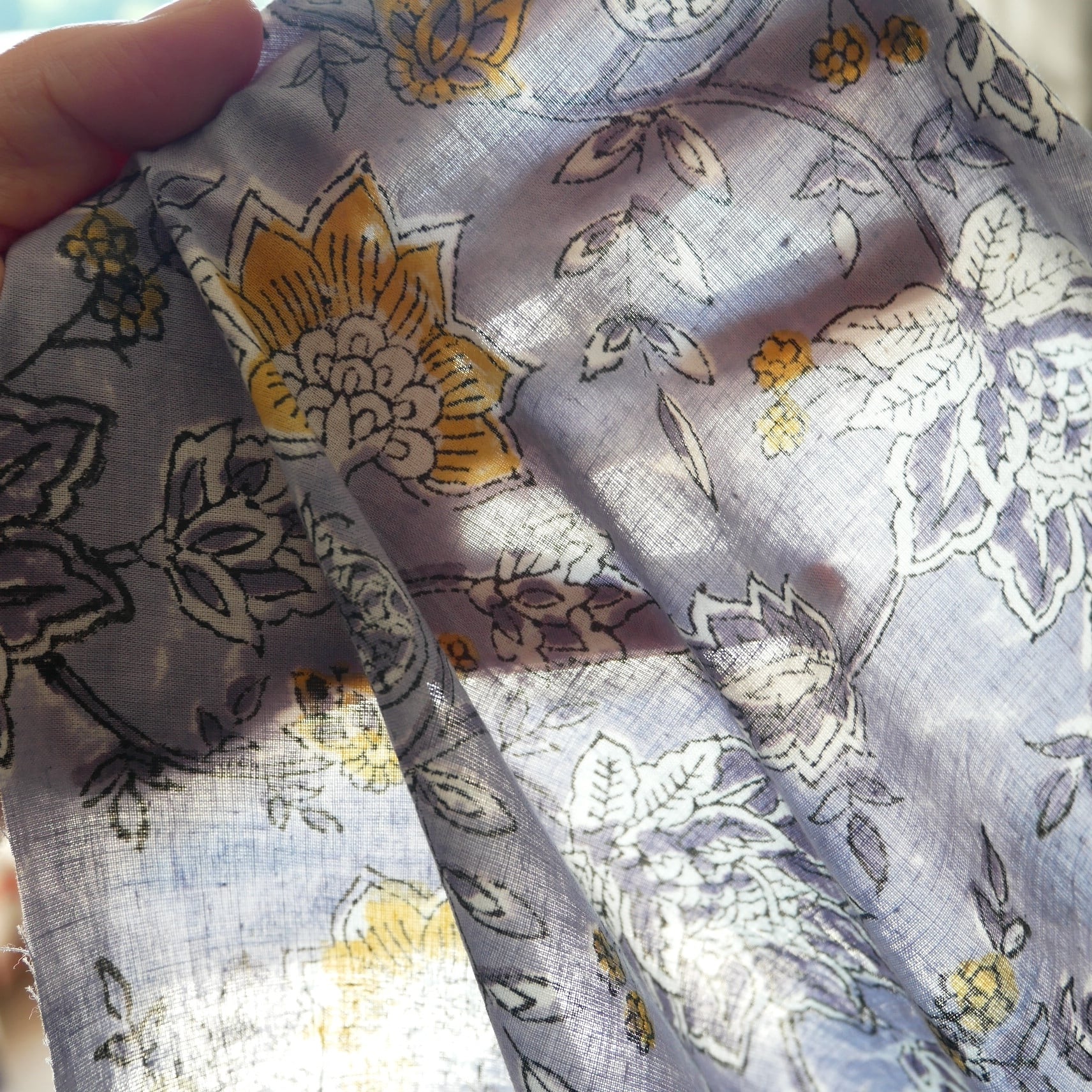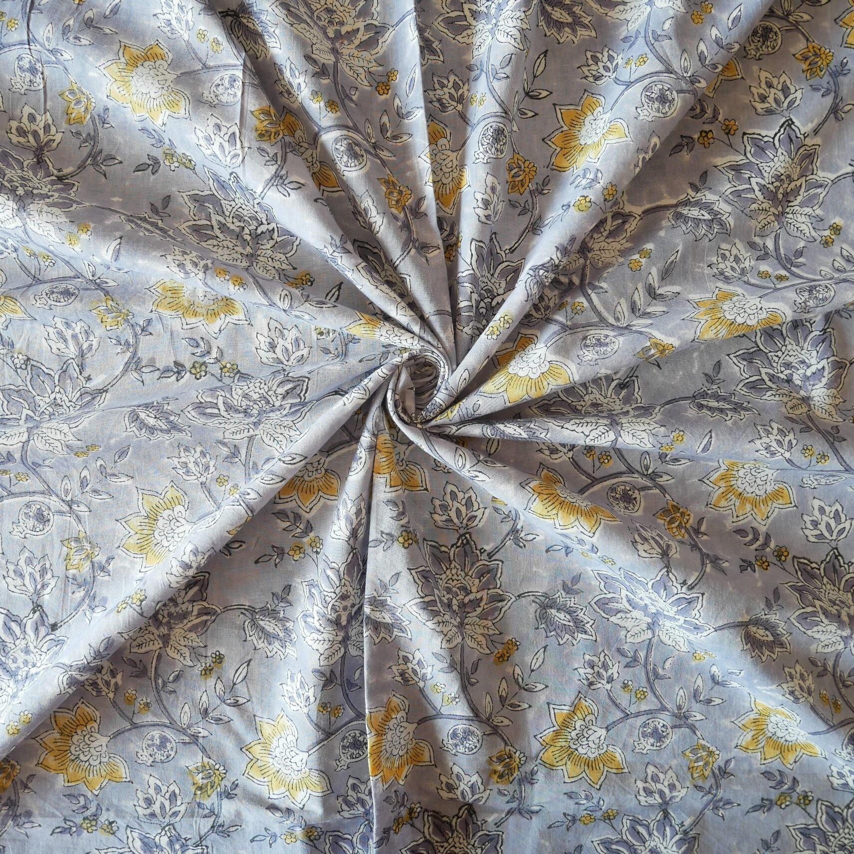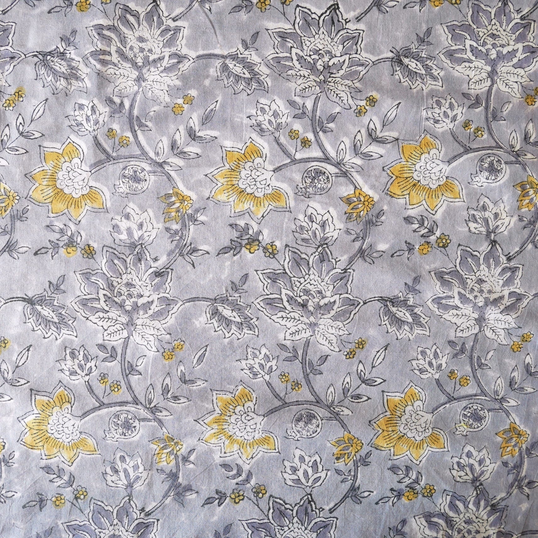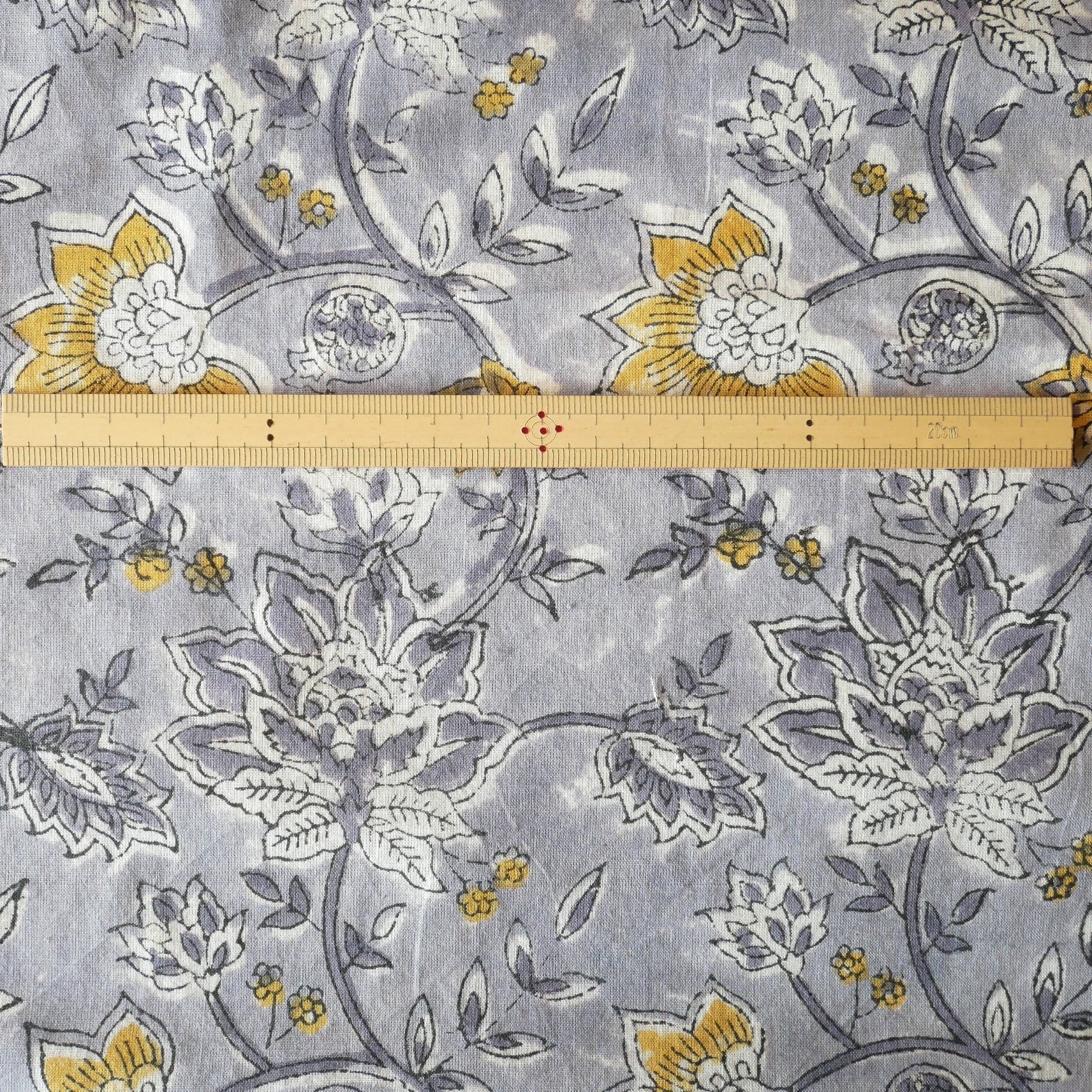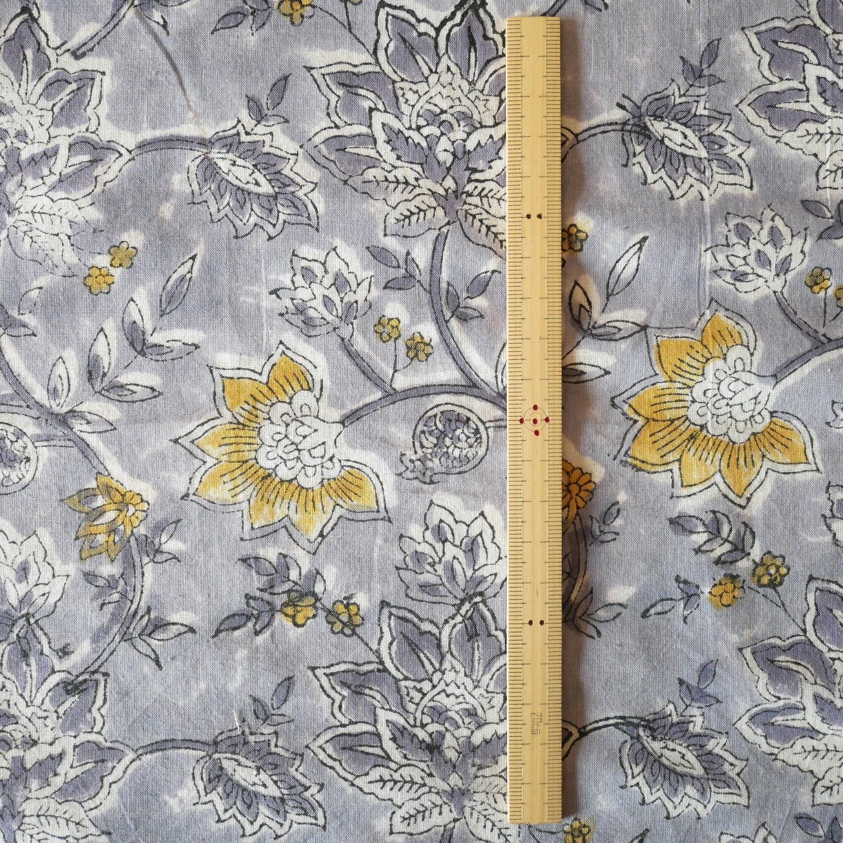 ラスト10点(約1m) ハンドブロックプリント生地 インド更紗 綿生地 グレーベース×イエロー&グレーのフラワー柄 薄手コットン JE-250849