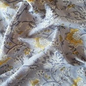 落ち着いたグレーのベースに、流れるように花々が描かれたブロックプリント生地です。