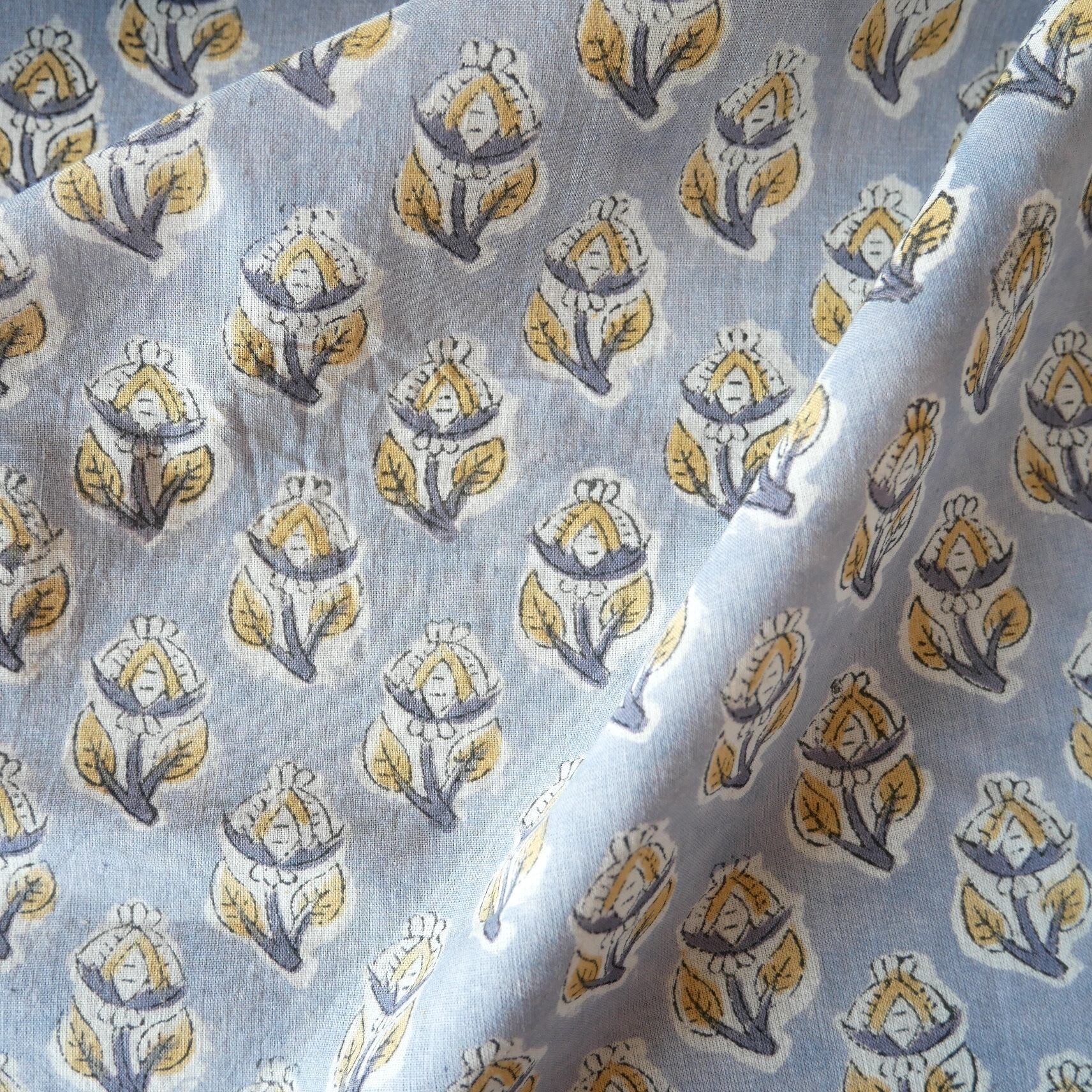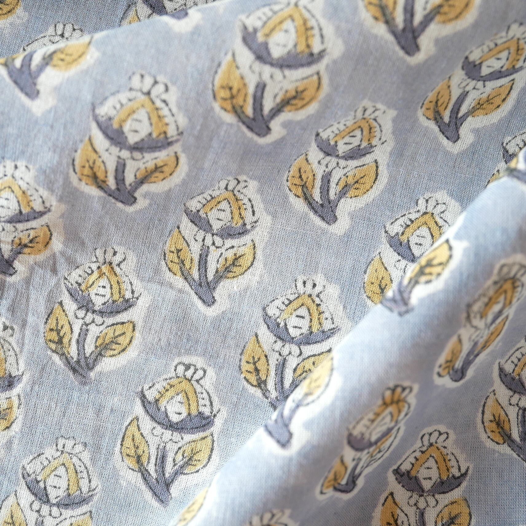 落ち着いたグレーのベースに、やわらかなイエローで描かれた小花柄が並ぶブロックプリント生地です。