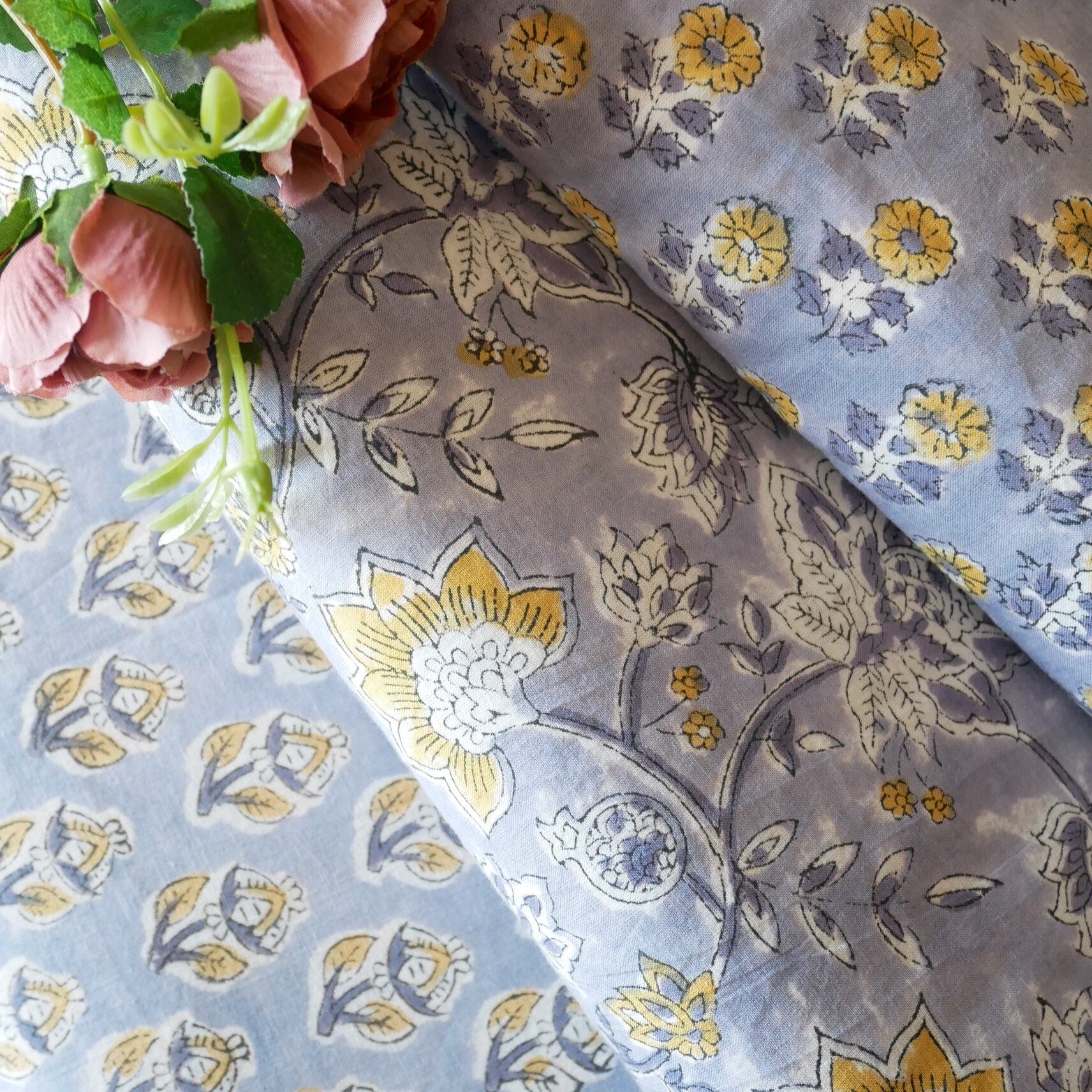 ◾️グレーに映えるイエローの小花。控えめで上品なブロックプリント生地