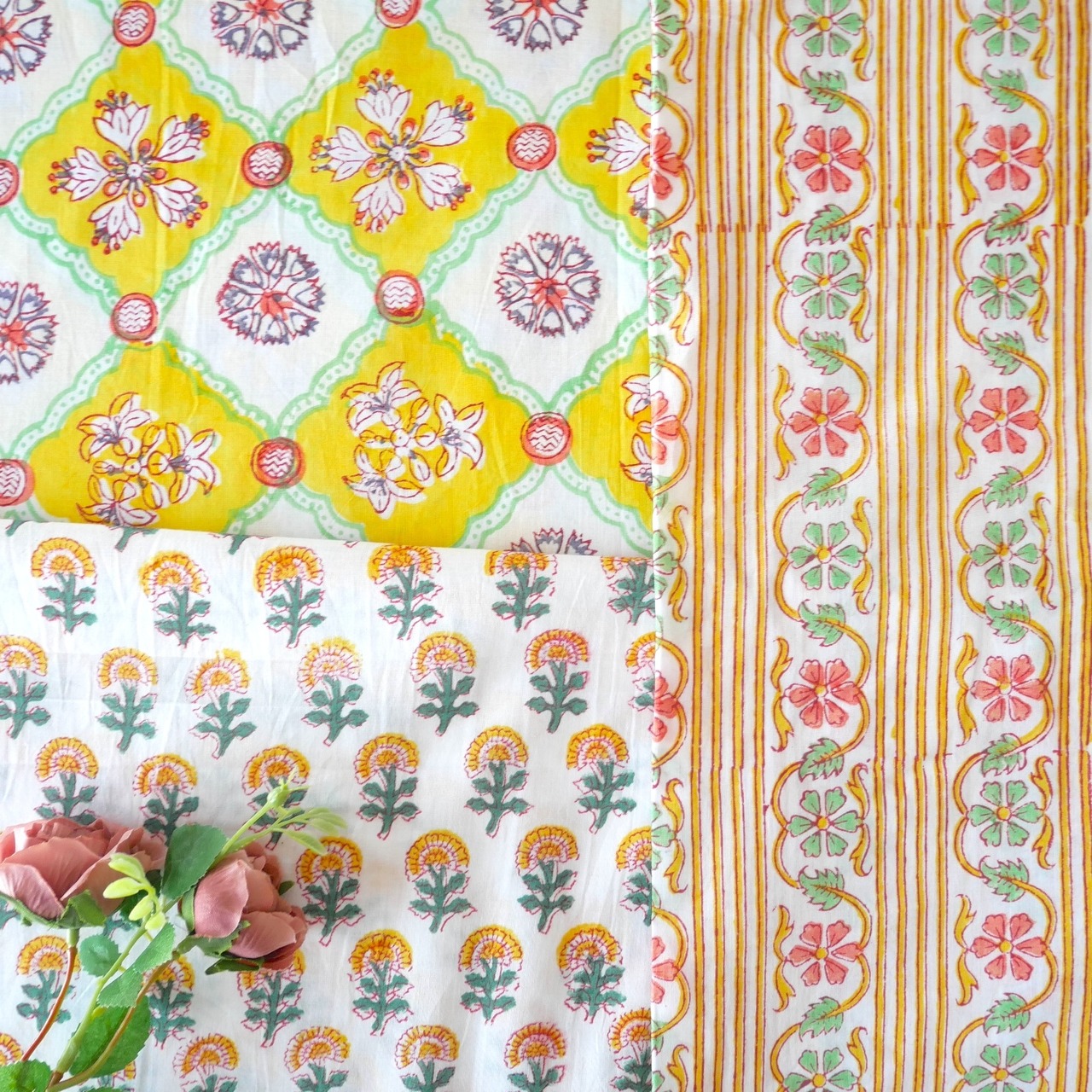 content(小さな幸せ)は、インドのハンドブロックプリント生地をお届けしています。手仕事の温かさとともに、作品づくりの時間が少しでも心豊かなひとときになりますように。