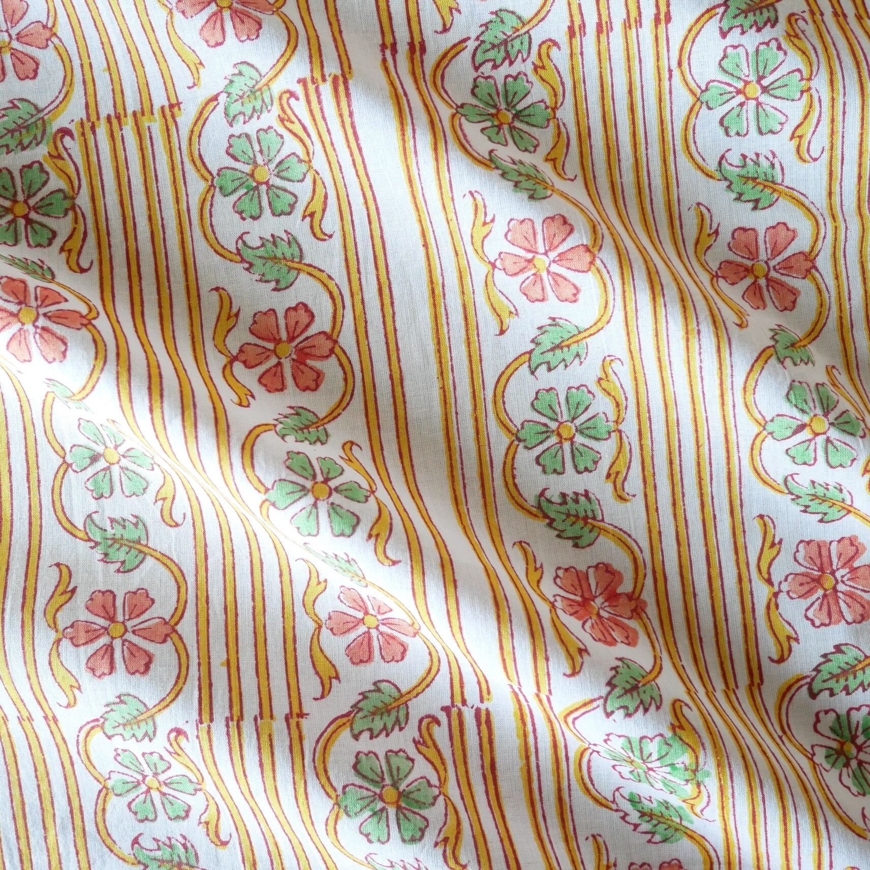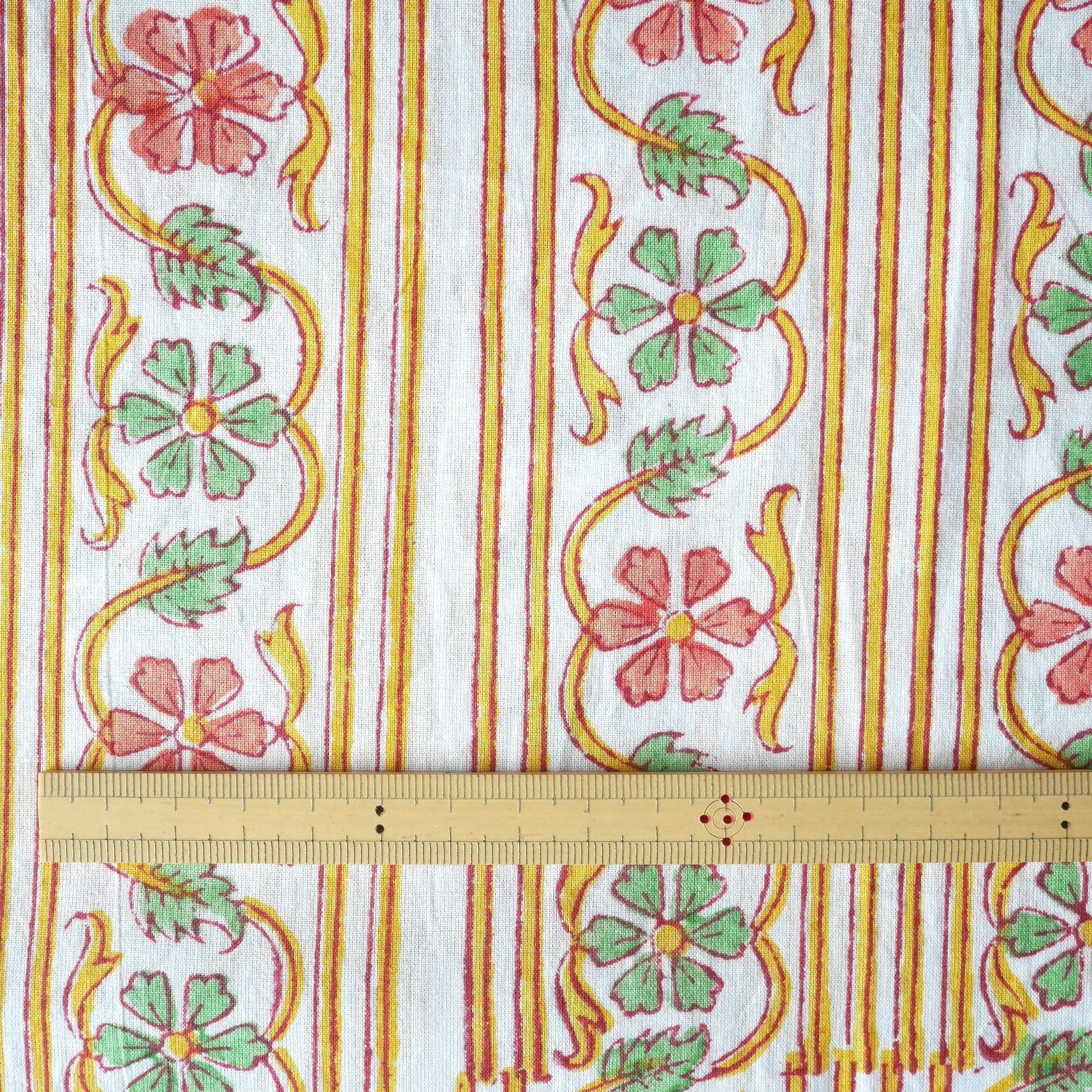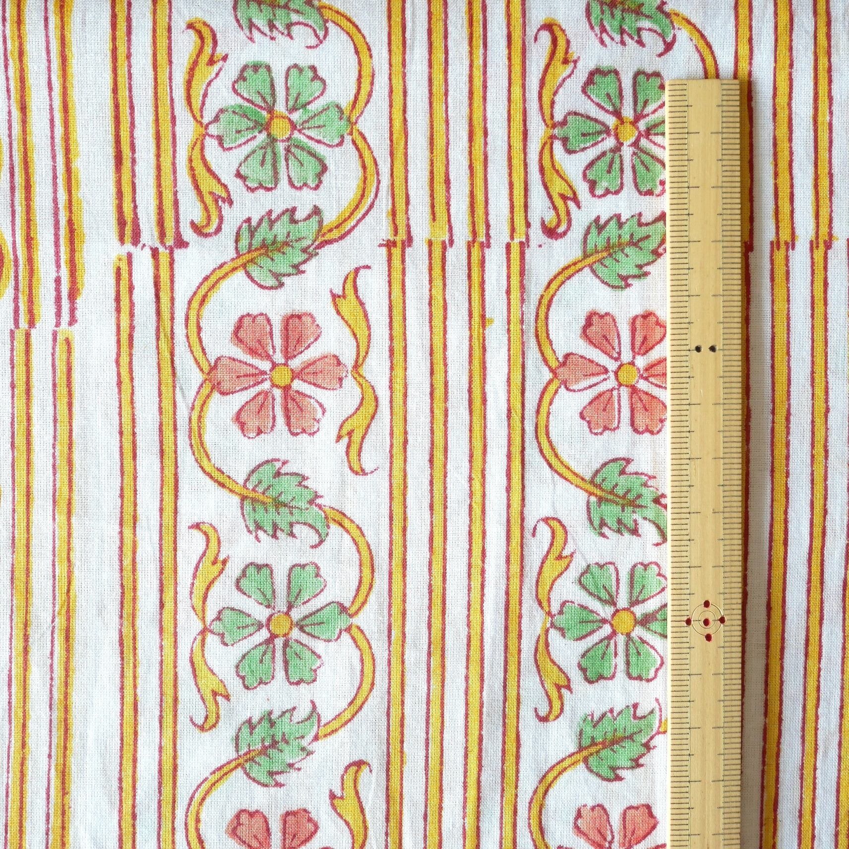 ハンドブロックプリント生地 インド更紗 綿生地 ホワイトベース×ストライプフラワー 薄手コットン GP-250825