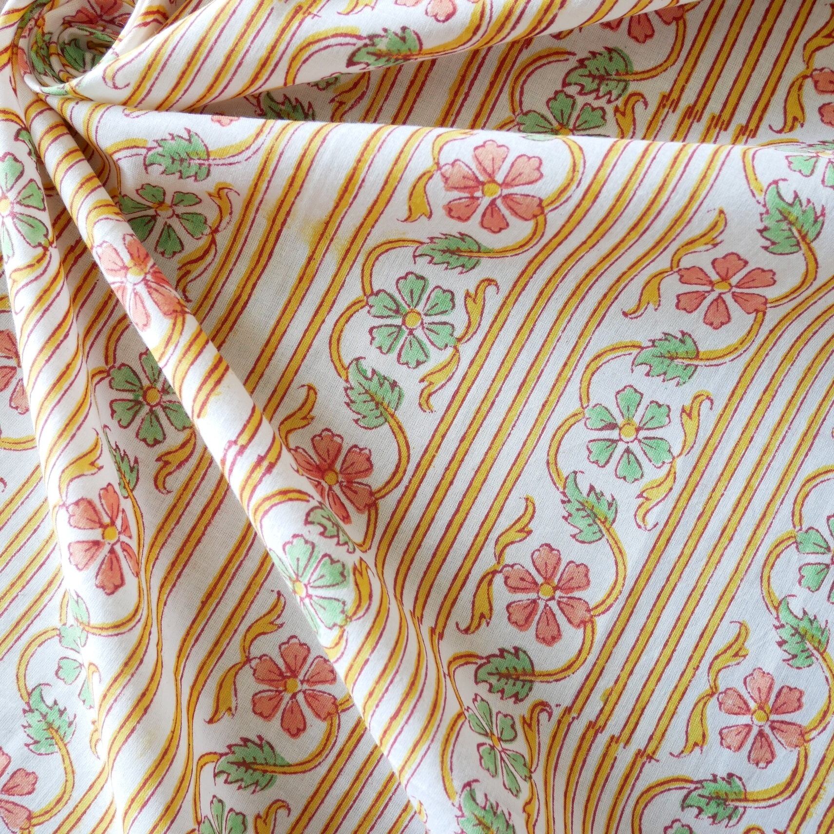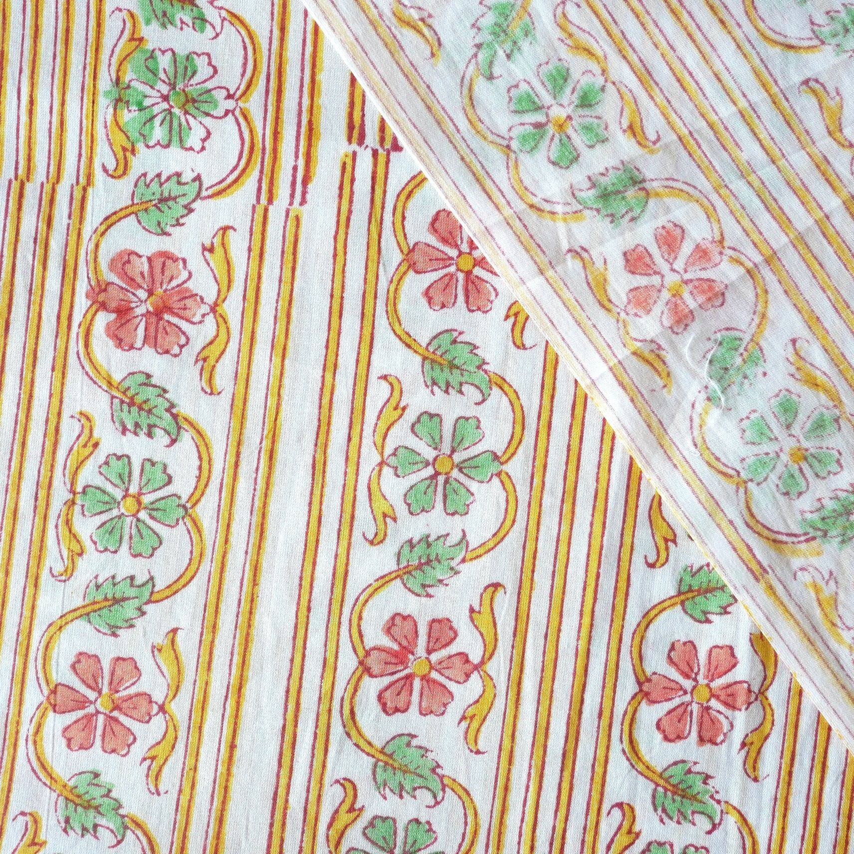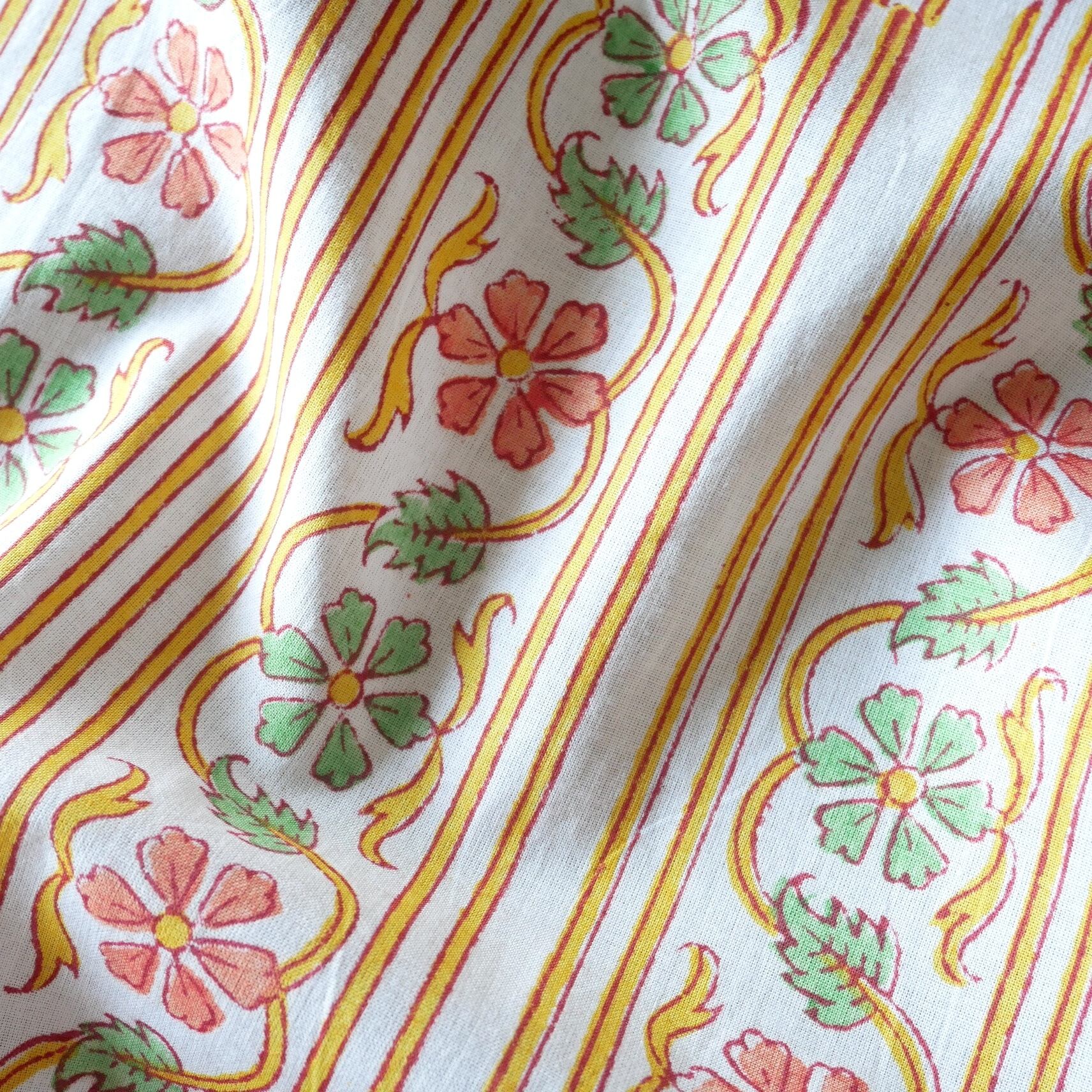 ハンドブロックプリント生地 インド更紗 綿生地 ホワイトベース×ストライプフラワー 薄手コットン GP-250825