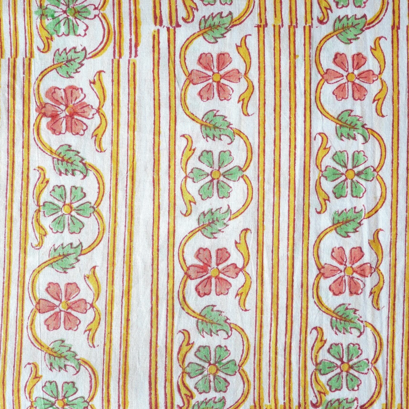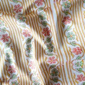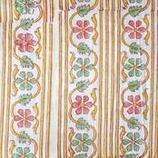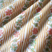 ホワイトのベースに、オレンジ寄りのピンク花とグリーンの葉、そしてイエローのリボンのような曲線モチーフが縦に並んだブロックプリント生地が入荷しました。