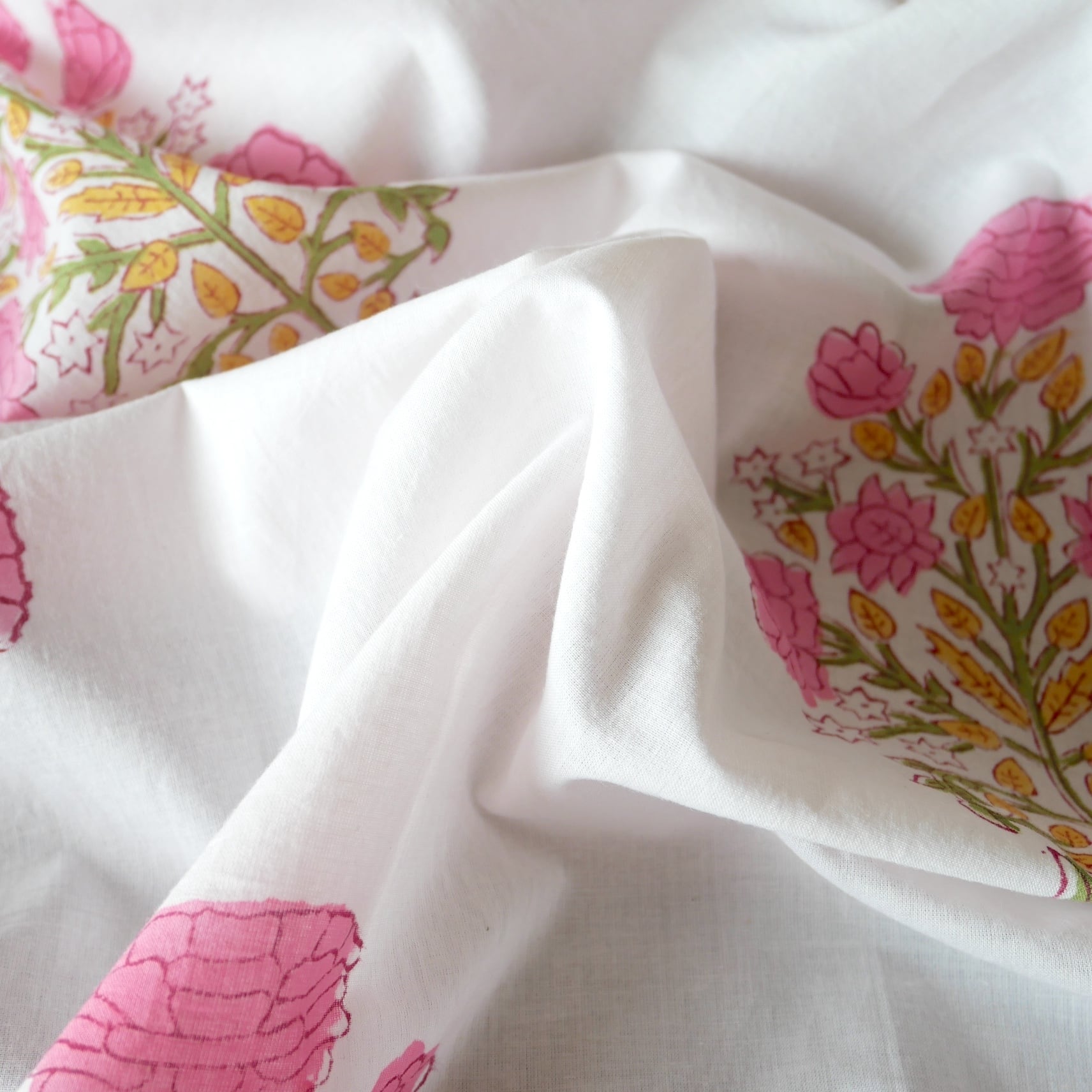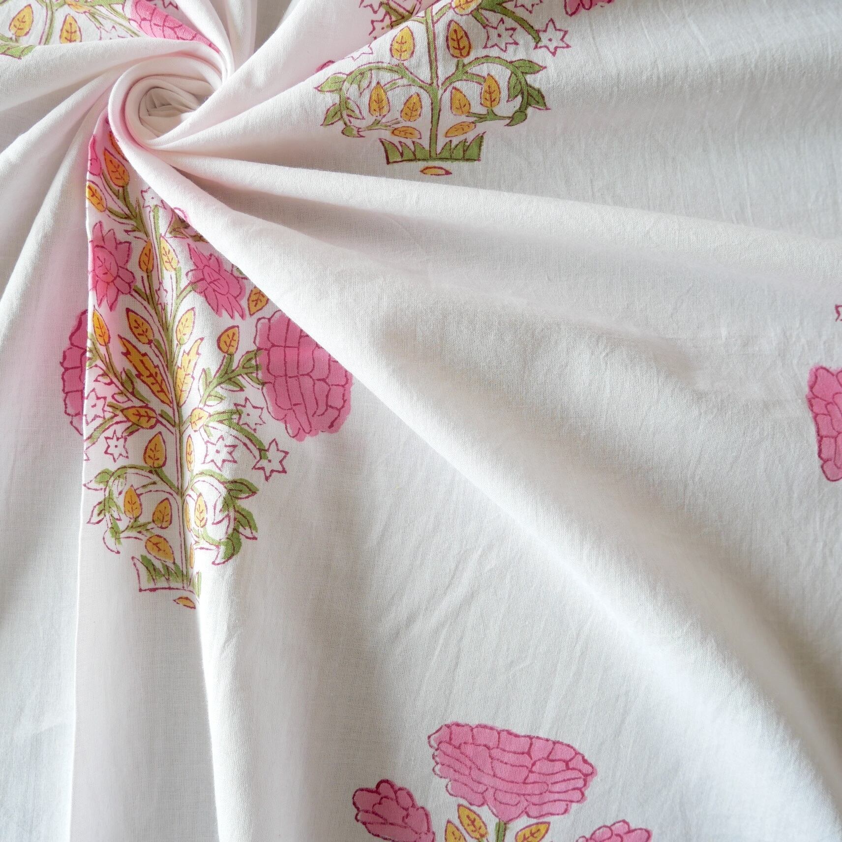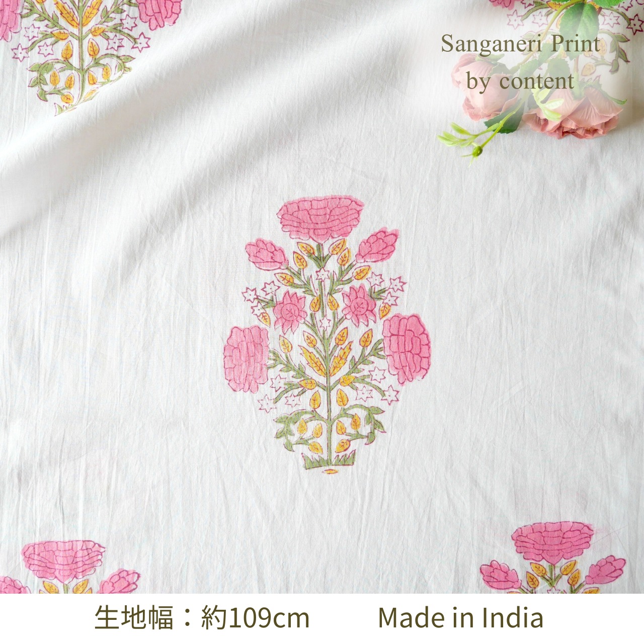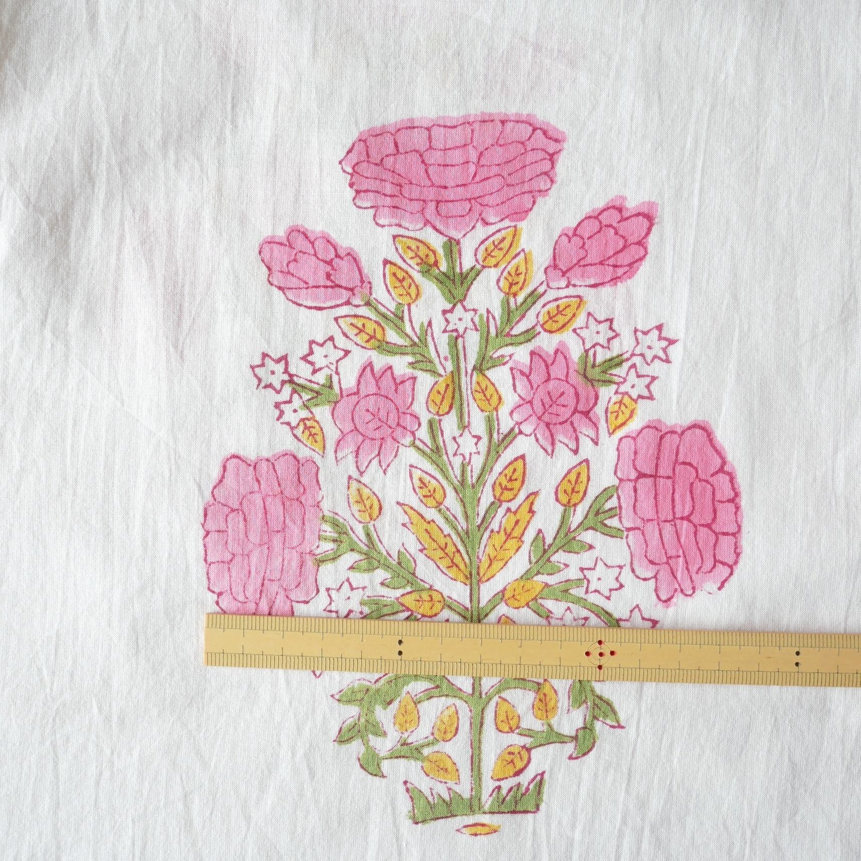 ハンドブロックプリント生地 インド更紗 綿生地 ホワイトベース×ピンクのビッグフラワー 薄手コットン JE-251001