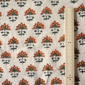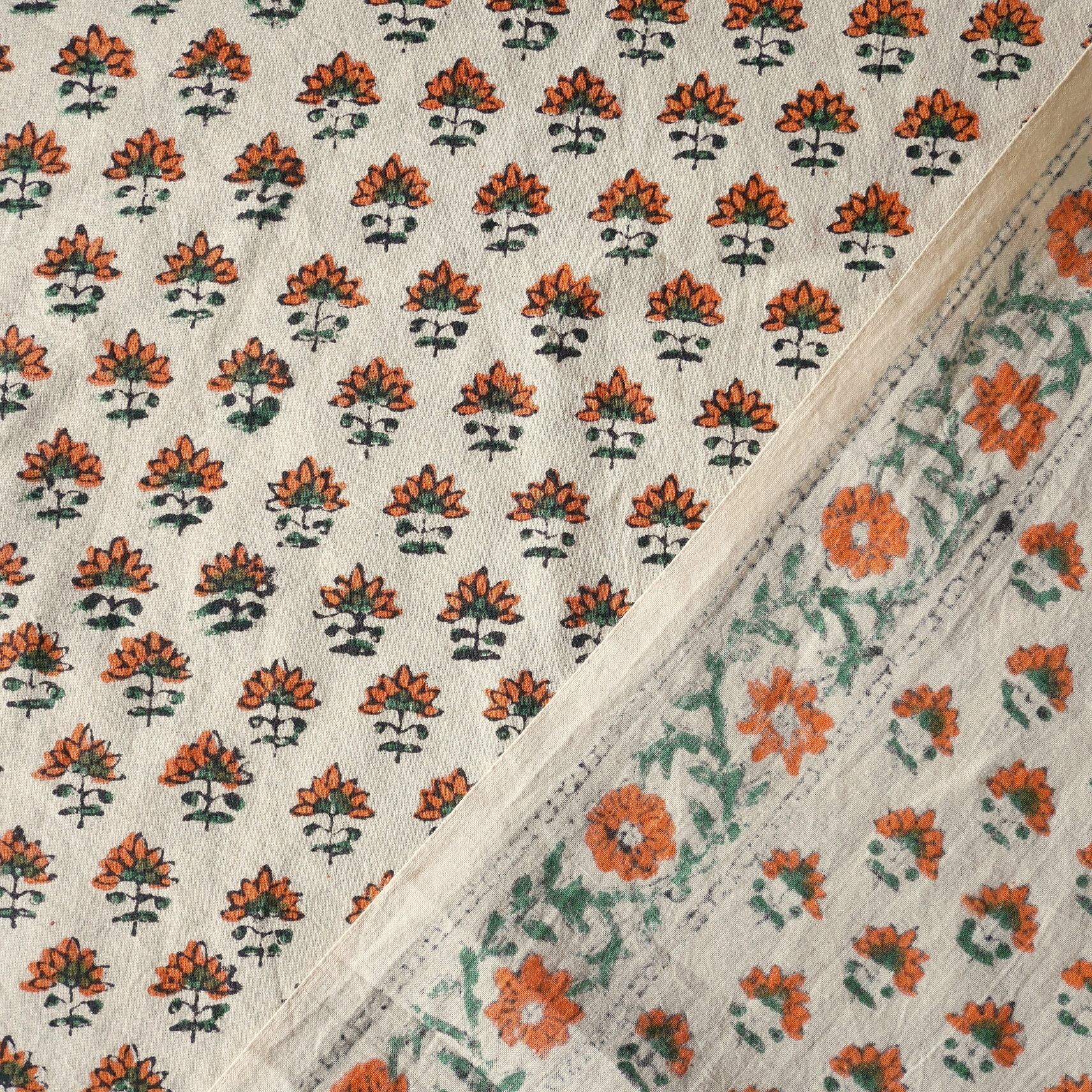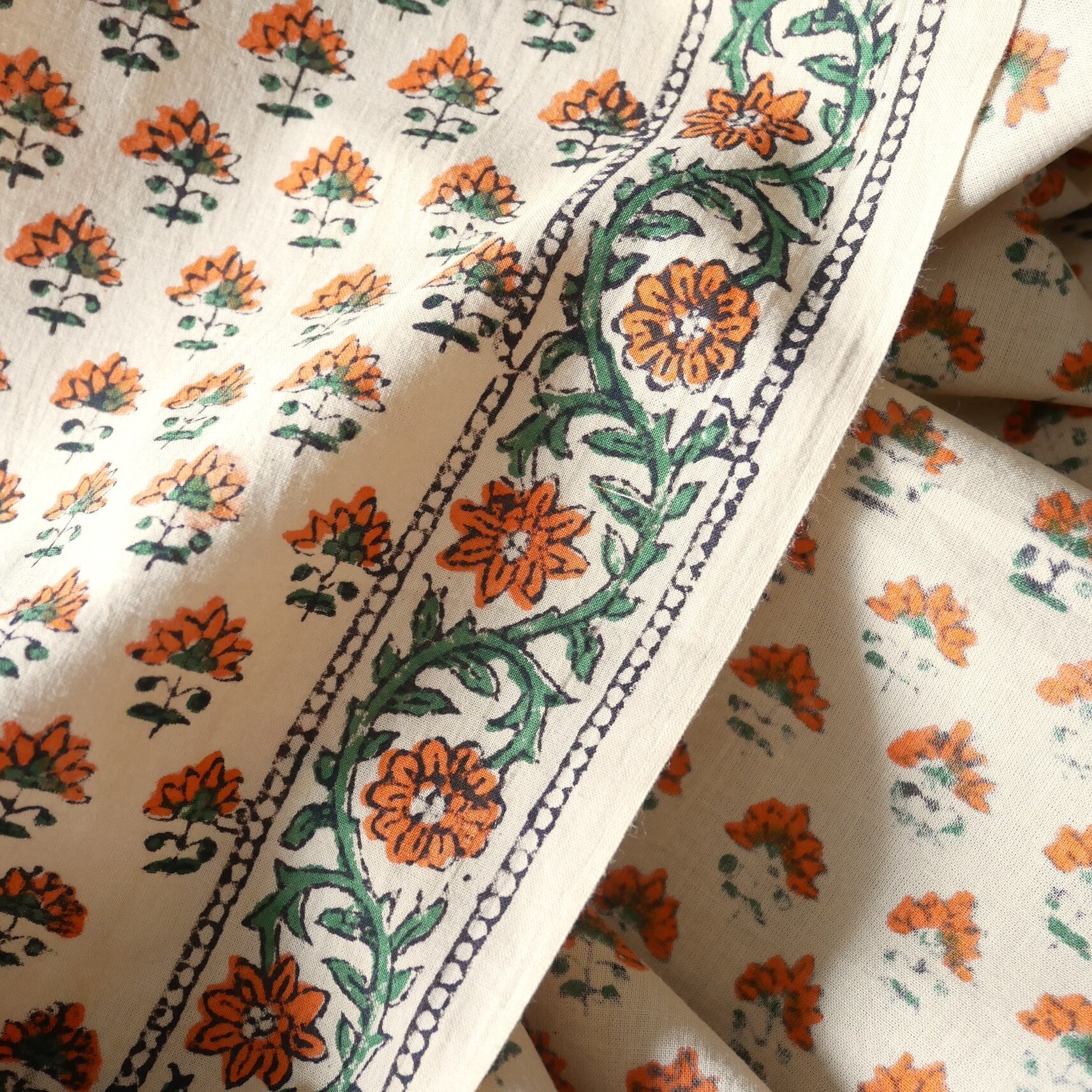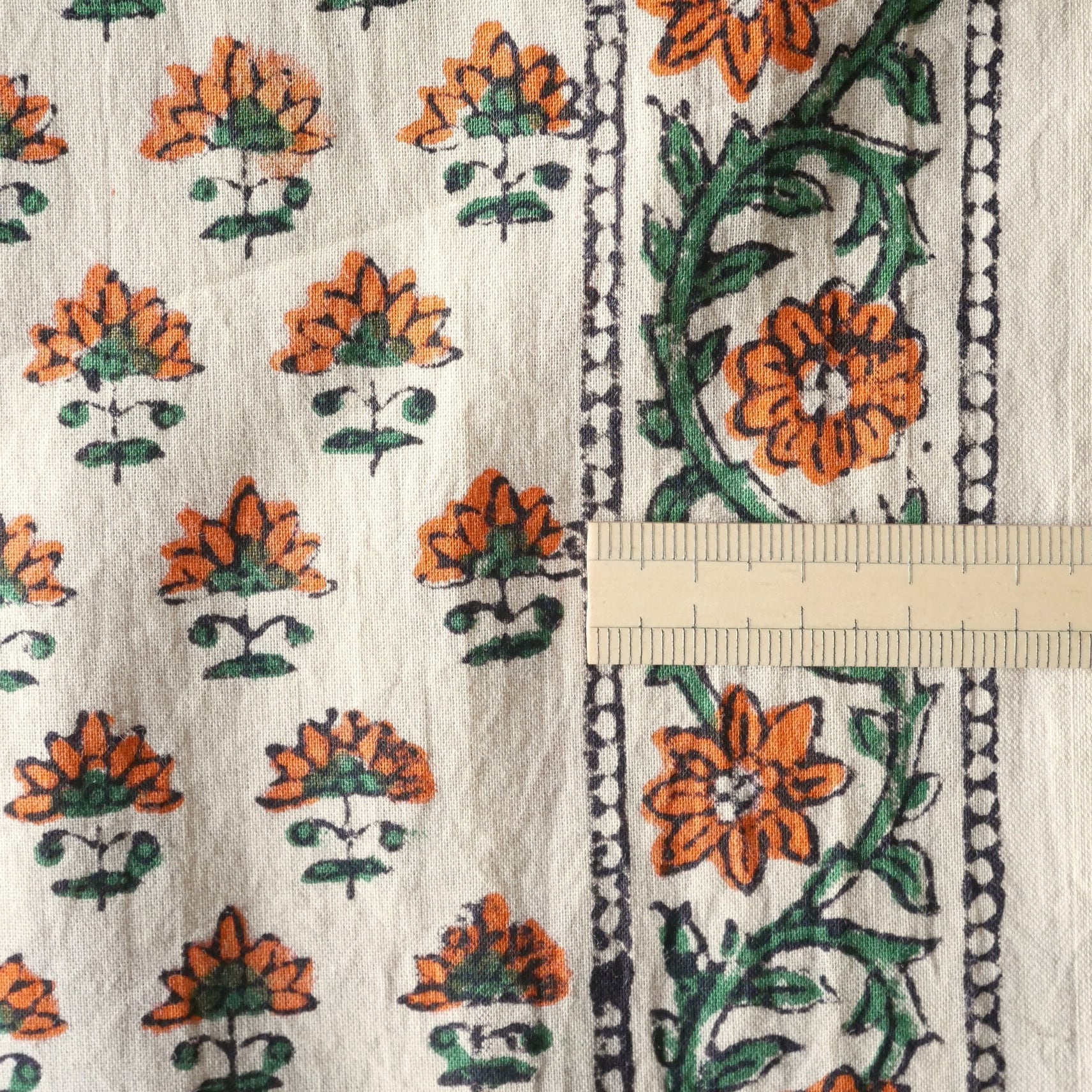 ハンドブロックプリント生地 インド更紗 綿生地 ナチュラルベース×オレンジフラワー 小花柄 ボーダー付き 薄手コットン GP-251023