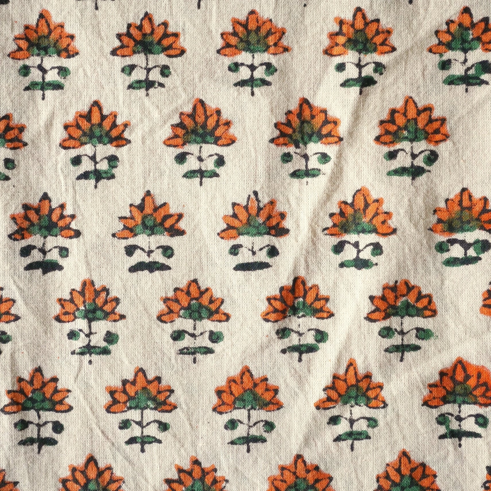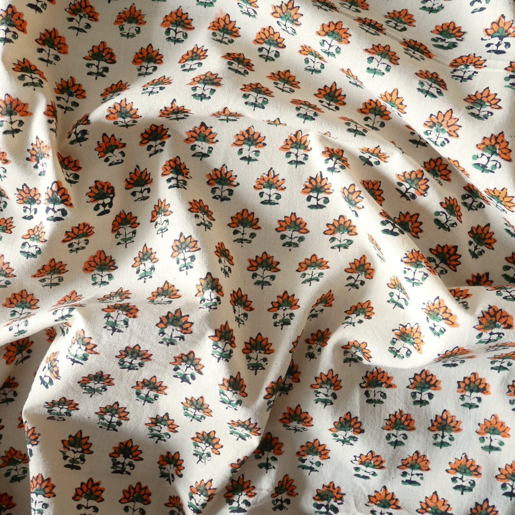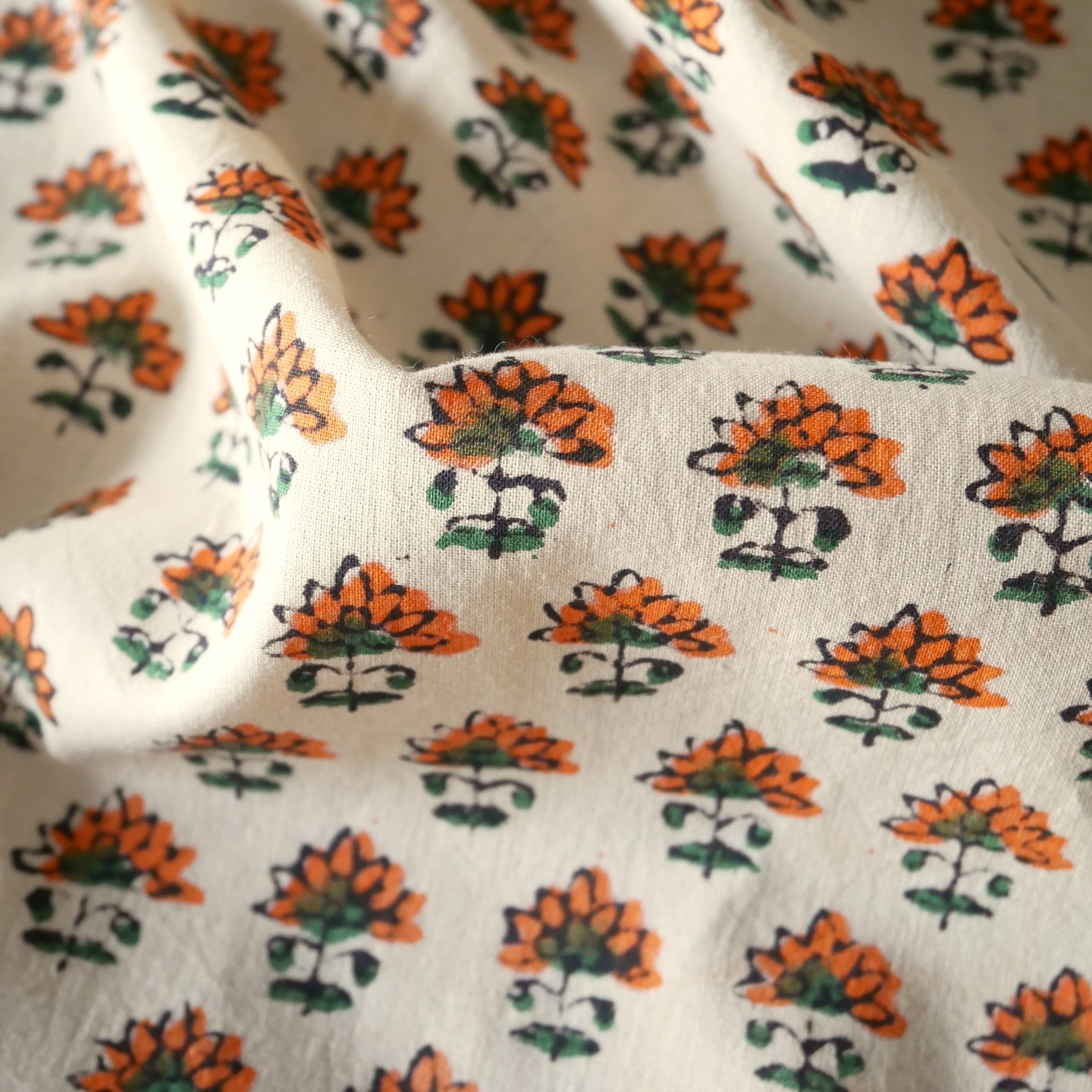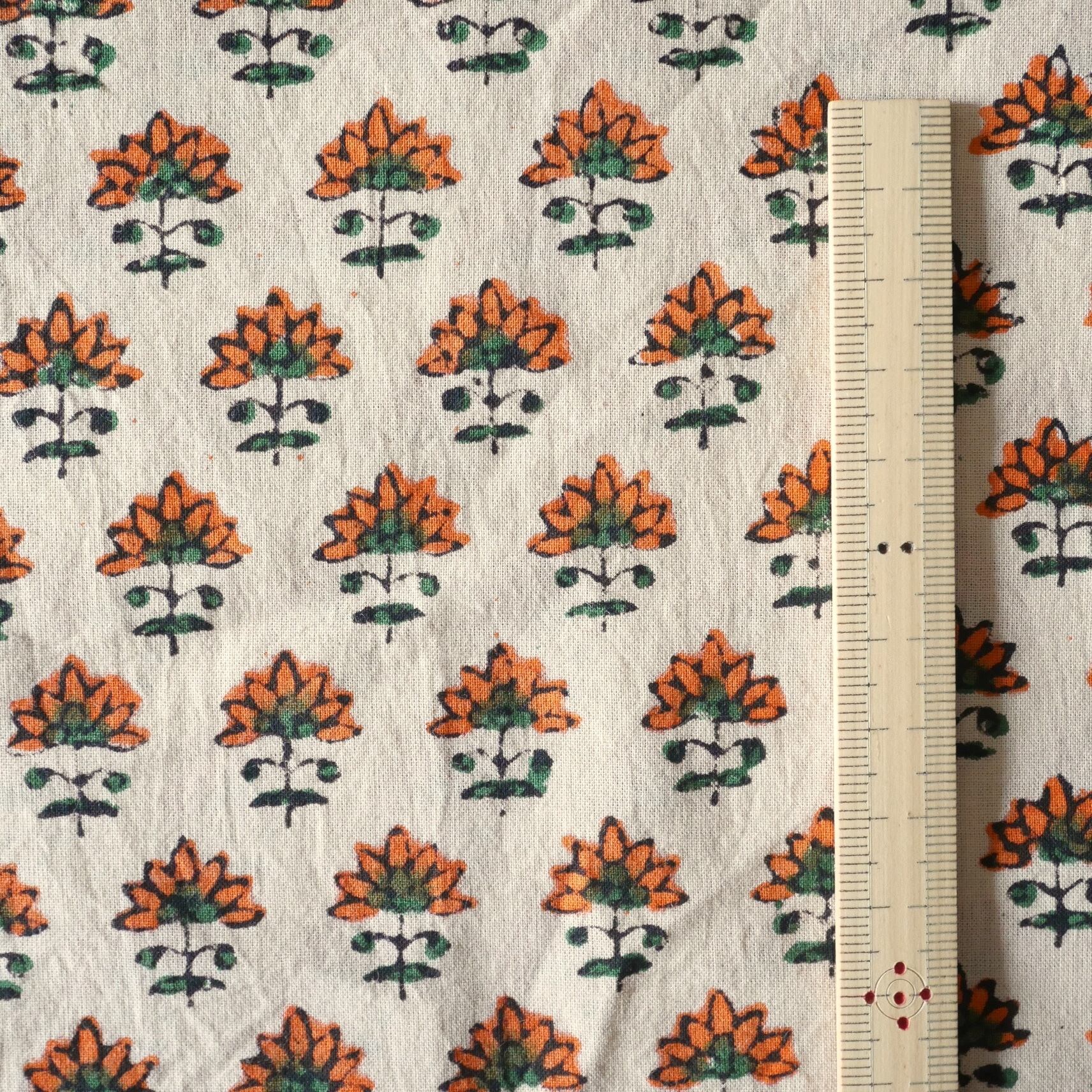 生成りに近いナチュラルなベースに、オレンジの小花がぽこぽこ並んだハンドブロックプリント生地です。