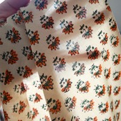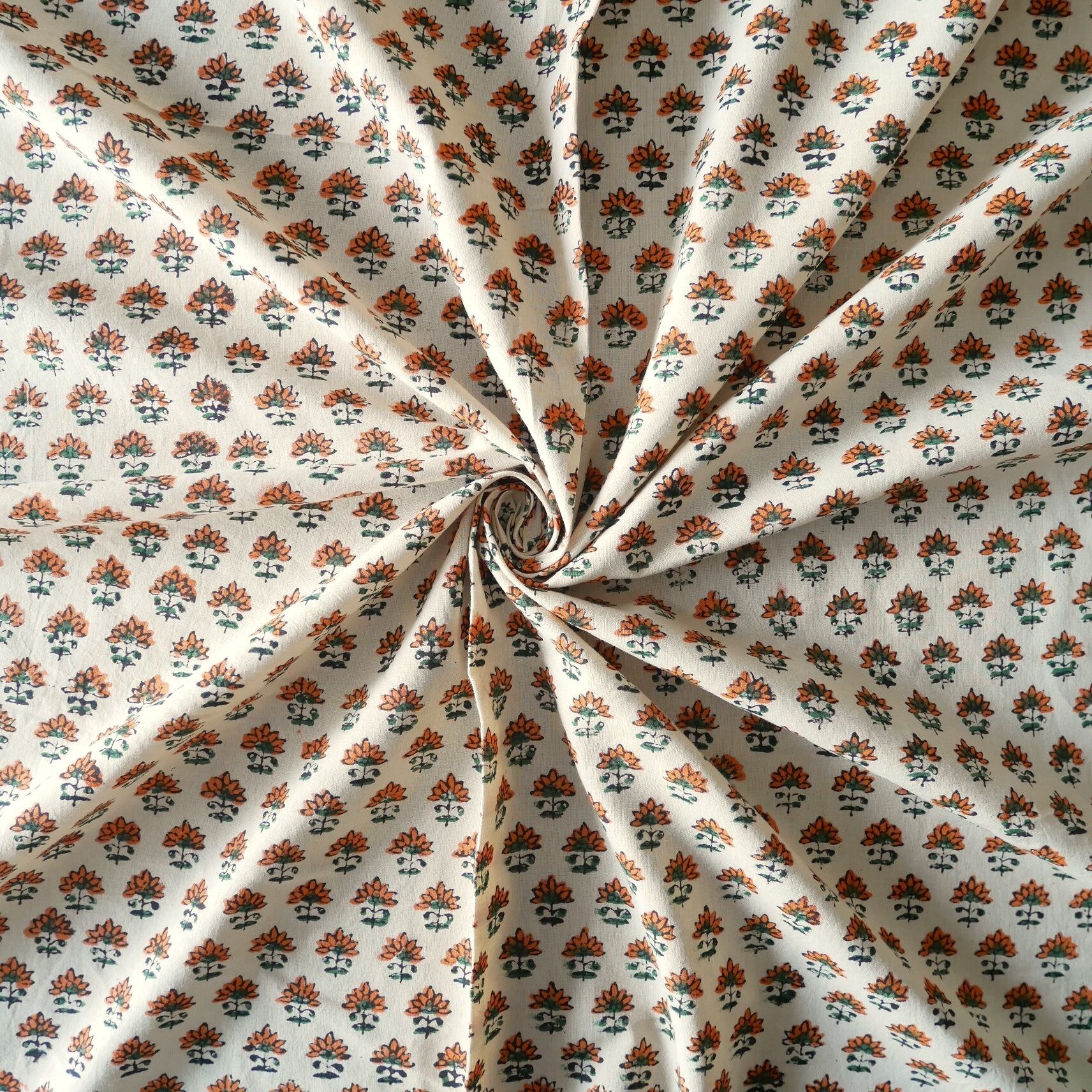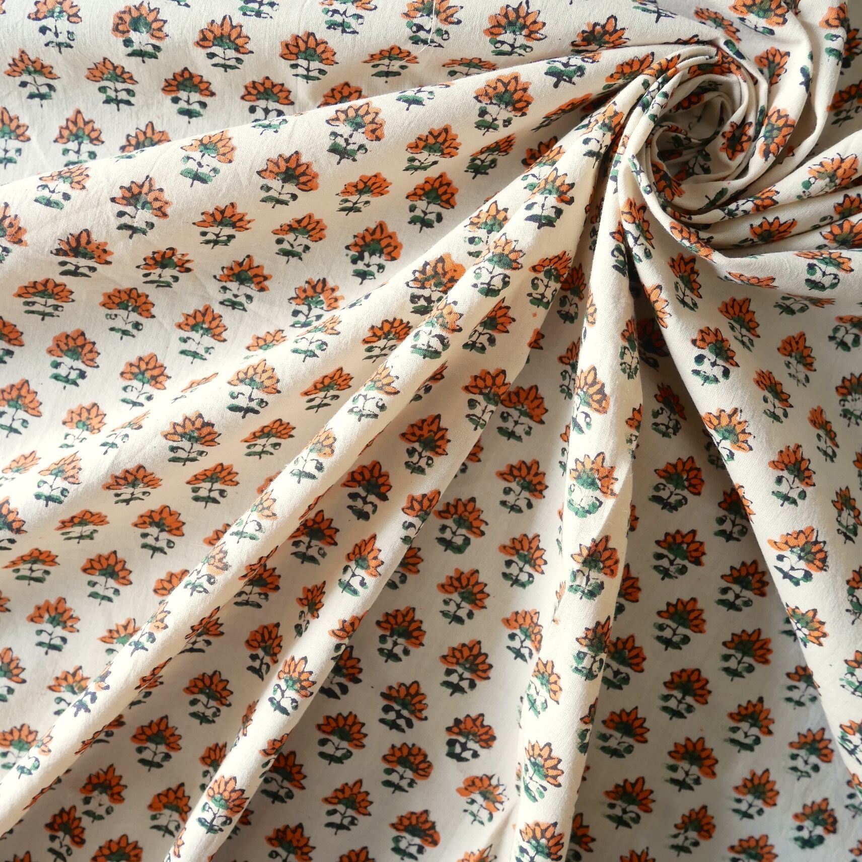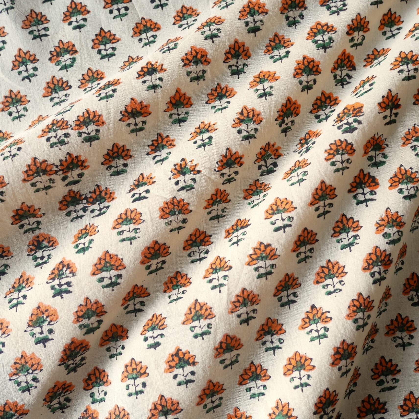 生成りに近いナチュラルなベースに、オレンジの小花がぽこぽこ並んだハンドブロックプリント生地です。